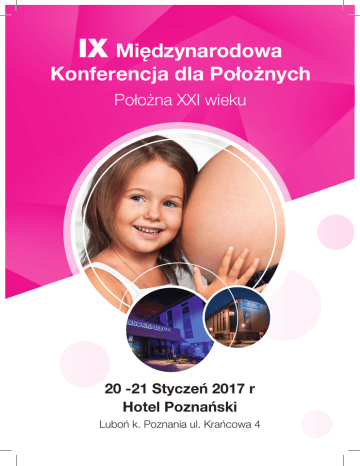 IX Międzynarodowa Konferencja dla Położnych Położna XXI wieku 20 -21 Styczeń 2017 r Hotel Poznański Luboń k. Poznania ul. Krańcowa 4 DZIEŃ PIERWSZY Piątek 20.01.2017 8.00 – 9.00 9.00 – 10.30 10.30 – 12.00 Rejestracja uczestników. Sesja I Transkulturowość w praktyce zawodowej położnej Sesja II Wokół zdrowia kobiety. 1. Leczenie operacyjne raka błony śluzowej trzonu macicy dr hab. Dariusz Wydra (30 min) 2. Ginekologia wieku rozwojowego – zagadnienie interdyscyplinarne dr Grażyna Jarząbek (30 min) 3. Jak uroginekologia rozwiązuje problem nietrzymania moczu dr Przemysław Kądziołka (30 min) 12.00 – 12.20 Przerwa kawowa. 12.20 – 14.00 Sesja III Niepłodność a pełnia szczęścia. 1. Zasady leczenia niepłodności dr Michał Kunicki (30 min) 2. Wybrane problemy kliniczne noworodków z ciąż wielopłodowych dr hab. Tomasz Szczapa (30 min) 3. Położnica i noworodek – pielęgnacja i opieka w świetle współczesnych standardów dr n med. Anna Paczkowska (30 min) 14.20 – 15.20 Lunch 15.20 – 16.50 Sesja IV Prawo medyczne w praktyce zawodowej położnej a rzeczywistość. mec. Wojciech Wojtal (90 min) 19.00 – 24.00 Bankiet 9.00 – 10.50 Sesja I Mnogość współczesnych diet a ciąża 1. Stosowanie diet roślinnych w czasie ciąży dr Aleksandra Śliwińska (30 min) 2. Wegetarianka w ciąży mgr Joanna Moćkurz (30 min) 3. Alergia pokarmowa typu III – transfer matka dziecko dr n. med. Mirosława Gałęcka (30 min) 4. Mleko modyfikowane na bazie mleka koziego – naturalna alternatywa dla popularnych mieszanek z mlekiem krowim mgr Ewa Bielak (20 min) 11.00 – 12.20 Warsztaty Stymulacja wielozmysłowa i zdrowy rozwój niemowlęcia. JOHNSON’S® So Much More™ 11.00 – 12.00 1. Wykład do kampanii So much more Agnieszka Machino (30 min) 12.00 – 12.10 2. Podział na grupy warsztatowe i przejście do stref warsztatowych Zmysły – rozwojowe okno na świat dr Julia Wojciechowska Kąpiel – eksplozja zmysłów Paweł Zawitkowski Węch – wielka mapa świata Marta Siembab Laboratorium JOHNSON’S Agnieszka Machino 14.20 – 15.10 Lunch 15.30 – 16.00 Podsumowanie 12.15 12.55 13.00 13.40 12.45 13.25 13.30 14.10 grupa 1 grupa 2 grupa 4 grupa 3 grupa 2 grupa 3 grupa 4 grupa 1 grupa 3 grupa 4 grupa 1 grupa 2 grupa 4 grupa 1 grupa 2 grupa 3 j DZIEŃ DRUGI Sobota 21.01.2017 Komitet Naukowy Komitet organizacyjny Przewodnicząca: Dr hab. Beata Pięta, prof. UM Przewodnicząca : Dr hab. Beata Pieta, prof. UM Dr hab. Małgorzata Kotwicka, prof. UM Dr Jolanta Olszewska Dr hab. Aleksandra Gaworska – Krzemińska Dr Anna Michalik Prof. Michał Musielak Dr Justyna Kamińska; Prof. dr hab. Krzysztof Łukaszuk Mgr Agnieszka Czerwińska-Osipiak Prof. Maciej Wilczak Mgr Jakub Pietrzak Dr hab. Tomasz Szczapa Mgr Weronika Michalska Dr hab. Dariusz Wydra Mgr Zuzanna Szymańczyk Dr Katarzyna Głodowska Dr Anna Michalik; Dr Justyna Kamińska; Dr Jolanta Olszewska Koszty udziału: Udział w konferencji oraz warsztatach - 80 pln Udział w imprezie towarzyszącej - 100 pln Zgłoszenia: Warunkiem uczestnictwa w Konferencji jest dokonanie rejestracji. [email protected] lub tel. 506-027-613 Prosimy o przesłanie następujących danych w mailu: Imię i nazwisko, dane do faktury (ewentualnie), informacja o uczestnictwie w bankiecie Opłatę rejestracyjną prosimy wpłacać na konto MIRALEX SP. Z O.O., UL. LOTNICZA 4, 64-920 PIŁA 75 1500 1041 1210 4005 4090 0000 z dopiskiem imię i nazwisko/data konf./nazwa miejscowości np. Jan Kowalski/20-21.01.2017/Poznań