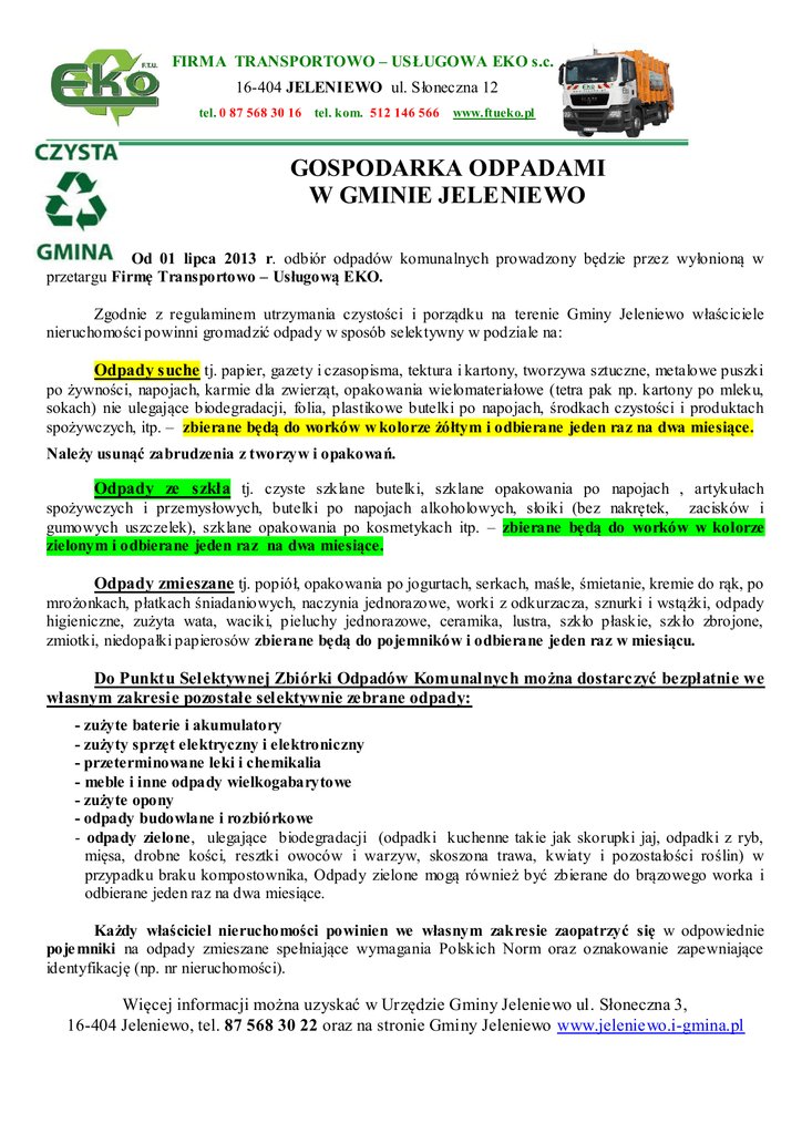 FIRMA TRANSPORTOWO – USŁUGOWA EKO s.c. 16-404 JELENIEWO ul. Słoneczna 12 tel. 0 87 568 30 16 tel. kom. 512 146 566 www.ftueko.pl GOSPODARKA ODPADAMI W GMINIE JELENIEWO Od 01 lipca 2013 r. odbiór odpadów komunalnych prowadzony będzie przez wyłonioną w przetargu Firmę Transportowo – Usługową EKO. Zgodnie z regulaminem utrzymania czystości i porządku na terenie Gminy Jeleniewo właściciele nieruchomości powinni gromadzić odpady w sposób selektywny w podziale na: Odpady suche tj. papier, gazety i czasopisma, tektura i kartony, tworzywa sztuczne, metalowe puszki po żywności, napojach, karmie dla zwierząt, opakowania wielomateriałowe (tetra pak np. kartony po mleku, sokach) nie ulegające biodegradacji, folia, plastikowe butelki po napojach, środkach czystości i produktach spożywczych, itp. – zbierane będą do worków w kolorze żółtym i odbierane jeden raz na dwa miesiące. Należy usunąć zabrudzenia z tworzyw i opakowań. Odpady ze szkła tj. czyste szklane butelki, szklane opakowania po napojach , artykułach spożywczych i przemysłowych, butelki po napojach alkoholowych, słoiki (bez nakrętek, zacisków i gumowych uszczelek), szklane opakowania po kosmetykach itp. – zbierane będą do worków w kolorze zielonym i odbierane jeden raz na dwa miesiące. Odpady zmieszane tj. popiół, opakowania po jogurtach, serkach, maśle, śmietanie, kremie do rąk, po mrożonkach, płatkach śniadaniowych, naczynia jednorazowe, worki z odkurzacza, sznurki i wstążki, odpady higieniczne, zużyta wata, waciki, pieluchy jednorazowe, ceramika, lustra, szkło płaskie, szkło zbrojone, zmiotki, niedopałki papierosów zbierane będą do pojemników i odbierane jeden raz w miesiącu. Do Punktu Selektywnej Zbiórki Odpadów Komunalnych można dostarczyć bezpłatnie we własnym zakresie pozostałe selektywnie zebrane odpady: - zużyte baterie i akumulatory - zużyty sprzęt elektryczny i elektroniczny - przeterminowane leki i chemikalia - meble i inne odpady wielkogabarytowe - zużyte opony - odpady budowlane i rozbiórkowe - odpady zielone, ulegające biodegradacji (odpadki kuchenne takie jak skorupki jaj, odpadki z ryb, mięsa, drobne kości, resztki owoców i warzyw, skoszona trawa, kwiaty i pozostałości roślin) w przypadku braku kompostownika, Odpady zielone mogą również być zbierane do brązowego worka i odbierane jeden raz na dwa miesiące. Każdy właściciel nieruchomości powinien we własnym zakresie zaopatrzyć się w odpowiednie poje mniki na odpady zmieszane spełniające wymagania Polskich Norm oraz oznakowanie zapewniające identyfikację (np. nr nieruchomości). Więcej informacji można uzyskać w Urzędzie Gminy Jeleniewo ul. Słoneczna 3, 16-404 Jeleniewo, tel. 87 568 30 22 oraz na stronie Gminy Jeleniewo www.jeleniewo.i-gmina.pl