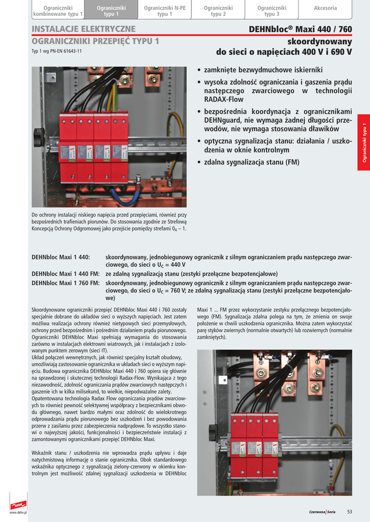 Ograniczniki kombinowane typu 1 Ograniczniki typu 1 Ograniczniki N-PE typu 1 iNstalacjE ElEktryczNE OgraNiczNiki przEpięć typu 1 Typ 1 wg PN-EN 61643-11 Ograniczniki typu 2 Ograniczniki typu 3 Akcesoria DEHNbloc® Maxi 440 / 760 skoordynowany do sieci o napięciach 400 V i 690 V • zamknięte bezwydmuchowe iskierniki • bezpośrednia koordynacja z ogranicznikami DEHNguard, nie wymaga żadnej długości przewodów, nie wymaga stosowania dławików • optyczna sygnalizacja stanu: działania / uszkodzenia w oknie kontrolnym • zdalna sygnalizacja stanu (FM) Do ochrony instalacji niskiego napięcia przed przepięciami, również przy bezpośrednich trafieniach piorunów. Do stosowania zgodnie ze Strefową Koncepcją Ochrony Odgromowej jako przejście pomiędzy strefami 0A – 1. DEHNbloc Maxi 1 440: skoordynowany, jednobiegunowy ogranicznik z silnym ograniczaniem prądu następczego zwarciowego, do sieci o UC = 440 V DEHNbloc Maxi 1 440 FM: ze zdalną sygnalizacją stanu (zestyki przełączne bezpotencjałowe) DEHNbloc Maxi 1 760 FM: skoordynowany, jednobiegunowy ogranicznik z silnym ograniczaniem prądu następczego zwarciowego, do sieci o UC = 760 V; ze zdalną sygnalizacją stanu (zestyki przełączne bezpotencjałowe) Skoordynowane ograniczniki przepięć DEHNbloc Maxi 440 i 60 zostały specjalnie dobrane do układów sieci o wyższych napięciach. Jest zatem możliwa realizacja ochrony również nietypowych sieci przemysłowych, ochrony przed bezpośrednim i pośrednim działaniem prądu piorunowego. Ograniczniki DEHNbloc Maxi spełniają wymagania do stosowania zarówno w instalacjach elektrowni wiatrowych, jak i instalacjach z izolowanym punktem zerowym (sieci IT). Układ połączeń wewnętrznych, jak również specjalny kształt obudowy, umożliwiają zastosowanie ogranicznika w układach sieci o wyższym napięciu. Budowa ogranicznika DEHNbloc Maxi 440 i 60 opiera się głównie na sprawdzonej i skutecznej technologii Radax-Flow. Wynikająca z tego niezawodność, zdolność ograniczania prądów zwarciowych następczych i gaszenie ich w kilka milisekund, to wielkie, niepodważalne zalety. Opatentowana technologia Radax Flow ograniczania prądów zwarciowych to również pewność selektywnej współpracy z bezpiecznikami obwodu głównego, nawet bardzo małymi oraz zdolność do wielokrotnego odprowadzania prądu piorunowego bez uszkodzeń i bez powodowania przerw z zasilaniu przez zabezpieczenia nadprądowe. To wszystko stanowi o najwyższej jakości, funkcjonalności i bezpieczeństwie instalacji z zamontowanymi ogranicznikami przepięć DEHNbloc Maxi. Maxi 1 ... FM przez wykorzystanie zestyku przełącznego bezpotencjałowego (FM). Sygnalizacja zdalna polega na tym, że zmienia on swoje położenie w chwili uszkodzenia ogranicznika. Można zatem wykorzystać parę styków zwiernych (normalnie otwartych) lub rozwiernych (normalnie zamkniętych). Wskaźnik stanu / uszkodzenia nie wprowadza prądu upływu i daje natychmistową informację o stanie ogranicznika. Obok standardowego wskaźnika optycznego z sygnalizacją zielony-czerwony w okienku kontrolnym jest możliwość zdalnej sygnalizacji uszkodzenia w DEHNbloc www.dehn.pl 53 Ograniczniki typu 1 • wysoka zdolność ograniczania i gaszenia prądu następczego zwarciowego w technologii RADAX-Flow Ograniczniki kombinowane typu 1 Ograniczniki typu 1 Ograniczniki N-PE typu 1 Ograniczniki typu 2 DEHNbloc® Maxi 440 / 760 DEHNbloc Maxi 1 440 (FM) Ograniczniki typu 3 Akcesoria iNstalacjE ElEktryczNE OgraNiczNiki przEpięć typu 1 L 961 140 961 145 DBM 1 440 DBM 1 440 FM DBM 1 440 961 140 DBM 1 440 FM FM DEHNbloc Maxi 1 440 L´ 12 11 14 Ograniczniki typu 1 N/PEN Schemat połączeń DBM 1 440 FM Rysunek wymiarowy DBM 1 440 FM DBM 1 440 (FM): skoordynowany, jednobiegunowy ogranicznik z silnym ograniczaniem prądu zwarciowego do sieci o UC = 440 V, np do sieci TN 400/690 V DBM 1 440 Ogranicznik przepięć wg PN-EN 61643-11 Ogranicznik przepięć wg PN-IEC 61643-1 Największe napięcie trwałej pracy AC UC Prąd udarowy (10/350) Iimp Znamionowy prąd wyładowczy (8/20) In Napięciowy poziom ochrony UP Zdolność gaszenia prądu następczego AC Ifi Ograniczanie prądu następczego / Selektywność Czas zadziałania tA Maks. bezpiecznik (L) do IK = 50 kAeff (ta ≤ 0,2 s) Maks. bezpiecznik (L) do IK = 50 kAeff (ta ≤ 5 s) Maks. bezpiecznik (L) przy IK > 50 kAeff Maks. bezpiecznik (L-L´) Przepięcie dorywcze UT Przepięcia dorywcze - cecha Zakres temperatur pracy (połączenie równoległe) TUP Zakres temperatur pracy (połączenie szeregowe) TUS Wskaźnik działania / uszkodzenia Przekroje przewodów (L, L´, N/PEN) min. Przekroje przewodów (L, N/PEN) maks. Przekroje przewodów (L´) maks. Montaż Materiał obudowy Stopień ochrony Szerokość montażowa Sygnalizacja uszkodzenia FM / Typ zestyku Parametry obwodu sygnalizacji AC Parametry obwodu sygnalizacji DC Przekroje przewodów FM Typ 1 Typ 1 Klasa I Klasa I 440 V 440 V 35 kA 35 kA 35 kA 35 kA ≤ 2,5 kV ≤ 2,5 kV 50 kAeff 50 kAeff bezpiecznik od 35 A gL/gG do 50 kAeff (prądu spodziewanego) nie zadziała ≤ 100 ns ≤ 100 ns 500 A gL/gG 500 A gL/gG 250 A gL/gG 250 A gL/gG 160 A gL/gG 160 A gL/gG 125 A gL/gG 125 A gL/gG 690 V / 5 sekund 690 V / 5 sekund wytrzymały wytrzymały -40°C...+80°C -40°C...+80°C -40°C...+60°C -40°C...+60°C zielony / czerwony zielony / czerwony 10 mm2 drut / linka 10 mm2 drut / linka 50 mm2 wielodrutowo / 35 mm2 linka 50 mm2 wielodrutowo / 35 mm2 linka 35 mm2 wielodrutowo / 25 mm2 linka 35 mm2 wielodrutowo / 25 mm2 linka szyna 35 mm wg EN 6015 szyna 35 mm wg EN 6015 Thermoplast, kolor czerwony, UL 94 V-0 Thermoplast, kolor czerwony, UL 94 V-0 IP 20 IP 20 2 moduły TE, DIN 43880 2 moduły TE, DIN 43880 — przełączny — 250 V/0,5 A — 250 V/0,1 A; 125 V/0,2 A; 5 V/0,5 A — maks. 1,5 mm2 drut / linka Dane potrzebne do zamówienia Typ Numer katalogowy Opakowanie jednostkowe DBM 1 440 961 140 1 szt. Akcesoria do DEHNbloc® Maxi 440 / 760 900 