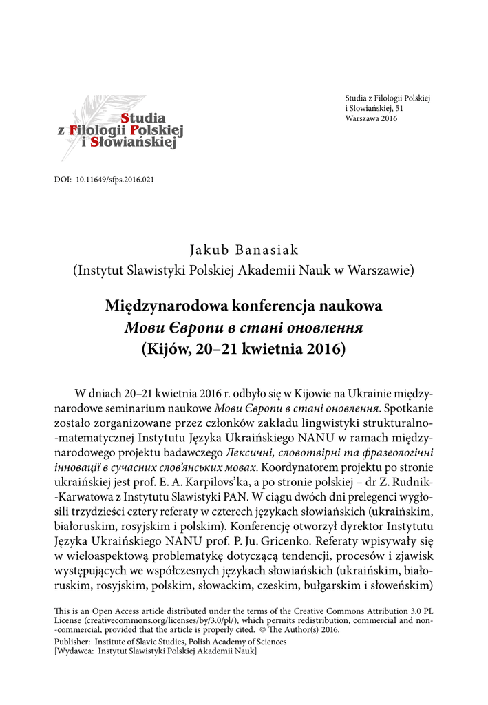 Studia z Filologii Polskiej i Słowiańskiej, 51 Warszawa 2016 DOI: 10.11649/sfps.2016.021 Ja kub B anas i a k (Instytut Slawistyki Polskiej Akademii Nauk w Warszawie) Międzynarodowa konferencja naukowa Мови Європи в стані оновлення (Kijów, 20–21 kwietnia 2016) W dniach 20–21 kwietnia 2016 r. odbyło się w Kijowie na Ukrainie między narodowe seminarium naukowe Мови Європи в стані оновлення. Spotkanie zostało zorganizowane przez członków zakładu lingwistyki strukturalno ‑matematycznej Instytutu Języka Ukraińskiego NANU w ramach między narodowego projektu badawczego Лексичні, словотвірні та фразеологічні інновації в сучасних слов’янських мовах. Koordynatorem projektu po stronie ukraińskiej jest prof. E. A. Karpilovs’ka, a po stronie polskiej – dr Z. Rudnik ‑Karwatowa z Instytutu Slawistyki PAN. W ciągu dwóch dni prelegenci wygło sili trzydzieści cztery referaty w czterech językach słowiańskich (ukraińskim, białoruskim, rosyjskim i polskim). Konferencję otworzył dyrektor Instytutu Języka Ukraińskiego NANU prof. P. Ju. Gricenko. Referaty wpisywały się w wieloaspektową problematykę dotyczącą tendencji, procesów i zjawisk występujących we współczesnych językach słowiańskich (ukraińskim, biało ruskim, rosyjskim, polskim, słowackim, czeskim, bułgarskim i słoweńskim) This is an Open Access article distributed under the terms of the Creative Commons Attribution 3.0 PL License (creativecommons.org/licenses/by/3.0/pl/), which permits redistribution, commercial and non ‑commercial, provided that the article is properly cited. © The Author(s) 2016. Publisher: Institute of Slavic Studies, Polish Academy of Sciences [Wydawca: Instytut Slawistyki Polskiej Akademii Nauk] Jakub Banasiak Międzynarodowa konferencja naukowa Мови Європи в стані оновлення… oraz języku nowogreckim. Jak wiadomo, sytuacja języków słowiańskich na przełomie wieków zmienia się niezwykle dynamiczne. Z jednej strony obecne są tendencje, które zarysowały się w okresie wcześniejszym (po drugiej wojnie światowej), z drugiej natomiast widoczny jest wpływ późniejszych przemian geopolitycznych takich jak upadek komunizmu, rozpad Jugosławii itp., które zintensyfikowały szereg procesów rozwojowych w obszarze słowiańskim. Wśród głównych tendencji językowych, które zostały omówione w referatach, wymienić należy tendencję do internacjonalizacji, demokratyzacji oraz różnego rodzaju zmiany typologiczne w obrębie leksyki i słowotwórstwa. Zmienia jąca się sytuacja językowa różnicuje jednak poszczególne języki słowiańskie, co znalazło swój wyraz w przedstawionych referatach. Szczególnie dużo miejsca poświęcono innowacjom językowym, wskazując na ich społeczne i kulturowe uwarunkowania oraz potrzeby komunikacyjne użytkowników języka. Prof. E. A. Karpilovs’ka przedstawiła w referacie kry teria określające stabilność innowacji językowych, wśród których wyróżniła następujące czynniki: długotrwałość funkcjonowania innowacji, siłę potencjału funkcjonalnego (syntagmatycznego, paradygmatycznego i słowotwórczego) danej jednostki, potrzebę nominacyjną oraz szerokie możliwości dostosowania danej formy wyrazowej do różnych sub-norm i potrzeb komunikacyjnych. Problematyka związana z adaptacją i standaryzacją nowych jednostek języka znalazła wyraz w licznych pracach poświęconych językowi ukraińskiemu. Dr Ju. V. Romanjuk zwróciła uwagę na ważną rolę analogii w obrębie innowacji czasownikowych. Dr L. P. Kisljuk w swoim wystąpieniu omówiła aktywizację różnych elementów słowotwórczych pochodzenia obcego w języku ukraińskim oraz tendencje analityczne w obrębie kompozytów. Wśród innych wystąpień wyróżnić można grupę poświęconą derywacji semantycznej. Dr P. Kowalski zwrócił uwagę na niezwykle istotną kwestię relacji zachodzących pomiędzy różnymi metodologicznie ujęciami omawianej problematyki (derywat semantyczny vs neosemantyzm vs neologizm seman tyczny) oraz drugą stronę procesu – paleosemantyzację. Szereg referatów poświęcono terminologii z zakresu różnych dziedzin (od informatyki i językoznawstwa po pszczelarstwo). Dr I. Łuczków omówiła rolę tradycji jako czynnika hamującego innowacje terminologiczne. Dr Z. Rudnik -Karwatowa przedstawiła pozajęzykowe czynniki kształtujące powstawanie nowych terminów językoznawczych na przykładzie konkurencji form typu lingwokulturologia vs lingwistyka kulturowa. Dr Ja. Volkava w swoim referacie poświęconym terminologii prawnej i prawniczej w języku białoruskim zauwa 340 Jakub Banasiak Międzynarodowa konferencja naukowa Мови Європи в стані оновлення… żyła, że język ten podlegał naturalnym procesom terminotwórczym do końca XVII w., jednak od XX w. do chwili obecnej sytuacja przedstawia się zgoła odmiennie. Zasób terminologiczny jest bowiem poszerzany poprzez przekład istniejących terminów rosyjskich. Dr M. Fastyn zaprezentował w referacie znaczące (przejrzyste słowotwór czo) nazwy własne osobowe w „Bajkach robotów” S. Lema oraz ich przekłady na język bułgarski, rosyjski i czeski. Seminarium cieszyło się bardzo dużym zainteresowaniem po stronie ukra ińskiej i w sposób znaczny wykroczyło poza ramy pierwotnie planowanego spotkania roboczego uczestników międzynarodowego projektu badawczego Лексичні, словотвірні та фразеологічні інновації в сучасних слов’янських мовах. Całe spotkanie przebiegało w bardzo miłej atmosferze. W dyskusji zaproponowano, aby zorganizować kolejne sesje w tym formacie, co pozwala mieć nadzieję, że konferencja nabierze cyklicznego charakteru. Referaty zostaną opublikowane w czasopiśmie Українська м