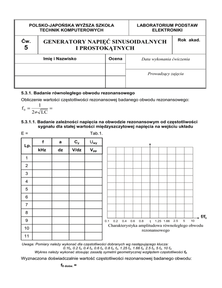 POLSKO-JAPOŃSKA WYśSZA SZKOŁA TECHNIK KOMPUTEROWYCH Ćw. 5 LABORATORIUM PODSTAW ELEKTRONIKI GENERATORY NAPIĘĆ SINUSOIDALNYCH I PROSTOKĄTNYCH Imię i Nazwisko Ocena Rok akad. Data wykonania ćwiczenia Prowadzący zajęcia 5.3.1. Badanie równoległego obwodu rezonansowego Obliczenie wartości częstotliwości rezonansowej badanego obwodu rezonansowego: f0 = 1 = 2π LC 5.3.1.1. Badanie zaleŜności napięcia na obwodzie rezonansowym od częstotliwości sygnału dla stałej wartości międzyszczytowej napięcia na wejściu układu E= Lp. Tab.1. f a Cy Uwy kHz dz V/dz Vpp 1 2 3 4 5 6 7 8 f/f0 9 0.1 0.2 0.4 0.6 0.8 1.25 1.66 2.5 5 10 Charakterystyka amplitudowa równoległego obwodu rezonansowego 10 11 Uwaga: Pomiary naleŜy wykonać dla częstotliwości dobranych wg następującego klucza: 0.1f0, 0.2 f0, 0.4 f0, 0.6 f0, 0.8 f0, f0, 1.25 f0, 1.66 f0, 2.5 f0, 5 f0, 10 f0. Wykres naleŜy wykonać stosując zasadę symetrii geometrycznej względem częstotliwości f0. Wyznaczona doświadczalnie wartość częstotliwości rezonansowej badanego obwodu: f0 dośw. = LPE - Ćw.5. GENERATORY NAPIĘĆ SINUSOIDALNYCH I PROSTOKĄTNYCH Wyznaczona doświadczalnie szerokość pasma 2∆ ∆f badanego obwodu rezonansowego: f1(3dB) = f2(3dB) = 2∆ ∆f = f2(3dB) - f1(3dB) = Dobroć obciąŜonego (kablem i wejściem oscyloskopu) obwodu rezonansowego: Q = f0 dośw./ 2∆ ∆f = Wnioski: 5.3.2. Badanie generatora drgań sinusoidalnych z obwodem rezonansowym LC Obliczenie wartości częstotliwości rezonansowej obwodu LC uŜytego w generatorze: f0(LC) = Sygnały w generatorze LC (obserwowane w p. S1, S2 i S3) Częstotliwość sygnału wyjściowego generatora zmierzona częstościomierzem cyfrowym: f0(LC) = Wnioski: 2 LPE - Ćw.5. GENERATORY NAPIĘĆ SINUSOIDALNYCH I PROSTOKĄTNYCH 5.3.3. Badanie generatora kwarcowego z inwerterem CMOS Uwaga: Sygnały w punktach S4, S5 i S6 naleŜy obserwować i naszkicować względem sygnału WY. Wnioski Sygnały w generatorze kwarcowym (obserwowane w punktach S4, S5, S6 i WY) 5.3.4. Badanie generatora relaksacyjnego ze wzmacniaczem operacyjnym Obliczenie wartości częstotliwości sygnału wytwarzanego przez generator relaksacyjny: f g ( obl ) = 1 = T gdzie: T = 2R 11C 8 ln α= Sygnały w generatorze relaksacyjnym (obserwowane w punktach S7, S8 i S9) 1+ α = 1− α R7 = R7 + R9 Częstotliwość sygnału wyjściowego generatora zmierzona częstościomierzem cyfrowym: fg = Wnioski: 3