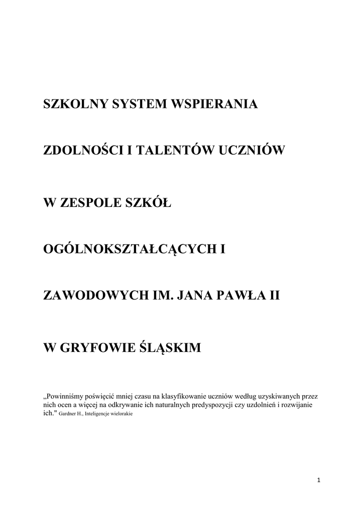 SZKOLNY SYSTEM WSPIERANIA ZDOLNOŚCI I TALENTÓW UCZNIÓW W ZESPOLE SZKÓŁ OGÓLNOKSZTAŁCĄCYCH I ZAWODOWYCH IM. JANA PAWŁA II W GRYFOWIE ŚLĄSKIM „Powinniśmy poświęcić mniej czasu na klasyfikowanie uczniów według uzyskiwanych przez nich ocen a więcej na odkrywanie ich naturalnych predyspozycji czy uzdolnień i rozwijanie ich." Gardner H., Inteligencje wielorakie 1 WYKAZ OBOWIĄZUJĄCYCH AKTÓW PRAWNYCH DOTYCZĄCYCH KSZTAŁCENIA UCZNIÓW UZDOLNIONYCH ORAZ FORM UDZIELANIA IM POMOCY Rozporządzenie Ministerstwa Edukacji Narodowej i Sportu z dnia 19 grudnia 2001r. w sprawie warunków i trybu udzielania zezwoleń na indywidualny program lub tok nauki oraz organizacji indywidualnego programu lub toku nauki (Dz.U. z 2002r. Nr 3, poz. 28) Rozporządzenie Ministerstwa Edukacji Narodowej i Sportu z dnia 29 stycznia 2002r. w sprawie organizacji oraz sposobu przeprowadzania konkursów, turniejów i olimpiad (Dz. U. Nr 13, poz.125) wraz z późniejszymi zmianami Rozporządzenie Rady Ministrów z dnia 28 października 2000 r. zmieniające rozporządzenie w sprawie warunków, form, trybu przyznawania i wypłacania oraz wysokości pomocy materialnej dla uczniów (Dz. U. Nr 92, poz. 1016) wraz z późniejszymi zmianami Rozporządzenie Ministerstwa Edukacji Narodowej i Sportu z dnia 9 kwietnia 2002r. w sprawie warunków prowadzenia działalności innowacyjnej i eksperymentalnej przez publiczne szkoły i placówki (Dz. U. Nr 41, poz. 362) WSTĘP Wsparcie utalentowanej młodzieży to jedno z najważniejszych zadań współczesnej szkoły. Aby umożliwić uczniom optymalny rozwój, niezbędne jest wieloaspektowe oddziaływanie mające na celu rozwijanie pasji i talentów. W celu usystematyzowania oddziaływań opracowany został w Zespole Szkół Ogólnokształcących i Zawodowych im. Jana Pawła II Szkolny System Wspierania Zdolności i Talentów Uczniów, który pozwala odkrywać i skutecznie rozwijać zainteresowania. Zadania ujęte w jego ramach zostały określone w sposób pozwalający dotrzeć do wszystkich uczniów, z uwzględnieniem ich indywidualnych cech, potrzeb, możliwości, zainteresowań i uzdolnień. CEL GŁÓWNY: Celem nadrzędnym jest wszechstronny rozwój każdego ucznia ZSOiZ, rozpoznawanie, rozbudzanie oraz rozwijanie zainteresowań, uzdolnień i umiejętności wszystkich uczniów, tworzenie warunków do osiągania sukcesów na miarę możliwości każdego z nich oraz promowanie talentów na terenie szkoły i w środowisku lokalnym. CELE SZCZEGÓŁOWE: Identyfikacja i diagnoza zainteresowań i uzdolnień uczniów w ramach zajęć obowiązkowych i pozalekcyjnych. Wdrażanie do efektywnych sposobów samodzielnego przyswajania wiedzy i umiejętności, dokonywania samooceny, planowania własnego rozwoju. Wzrost aktywności twórczej uczniów. Budowanie klimatu bezpieczeństwa niezbędnego do odkrywania przez młodego człowieka swoich mocnych stron. Kształtowanie kreatywności. 2 Wspieranie inicjatyw społecznych podejmowanych przez uczniów Ewaluacja postaw twórczych. Promocja osiągnięć uczniów w szkole i środowisku lokalnym. Systematyczne dokumentowanie rozwoju uzdolnień. Otoczenie ucznia osiągającego mierzalne sukcesy w olimpiadach i konkursach opieką oraz zindywidualizowanie kształcenia poprzez przyznawanie opiekuna naukowego na pisemny wniosek ucznia lub jego rodzica Zakładane osiągnięcia uczniów mają dotyczyć przede wszystkim: wzrostu świadomości dotyczącej możliwości, kierunku własnego rozwoju wzrostu świadomości dotyczącej własnych zainteresowań i możliwości ich realizacji na terenie szkoły DEFINICJA UCZNIA ZDOLNEGO Uczeń zdolny to każdy uczeń Zespołu Szkół Ogólnokształcących i Zawodowych im. Jana Pawła II w Gryfowie Śląskim, posiadający określonego rodzaju predyspozycje: humanistyczne, matematyczne, artystyczne, przyrodniczo-ekologiczne, organizacyjne lub sportowe i cechujący się ciekawością poznawczą oraz motywacją twórczą. OBSZARY UZDOLNIEŃ: społeczno - liderski humanistyczny artystyczny matematyczny informatyczny przyrodniczo-ekologiczny językowy sportowy inne PROCEDURY DIAGNOZOWANIA UZDOLNIEŃ I ZAINTERESOWAŃ UCZNIÓW: 1. Obserwacja ucznia - gromadzenie przez wychowawcę opinii i spostrzeżeń nauczycieli prowadzących zajęcia obowiązkowe i pozalekcyjne. 2. Wywiad z rodzicami na temat rozpoznanych zdolności ucznia. 3. Rozmowy z uczniem, ankieta dla uczniów- badanie stylów uczenia się oraz profilu uzdolnień i zainteresowań. 4. Przygotowanie i udział uczniów w konkursach i olimpiadach przedmiotowych. 5. Semestralna analiza osiągnięć każdego ucznia pod kątem zainteresowań, uzdolnień i osiągnięć. 6. Organizowanie konkursów, zawodów i olimpiad wewnątrzszkolnych oraz innych przedsięwzięć umożliwiających prezentację uzdolnień. 7. Przygotowanie i udział uczniów w konkursach i olimpiadach 3 REALIZATORZY PROGRAMU I ICH ZADANIA Program będą realizować pracownicy szkoły: dyrektor, lider wspierania uzdolnień, opiekunowie uczniów zdolnych, nauczyciele uczący poszczególnych przedmiotów oraz prowadzący zajęcia pozalekcyjne, pedagog, wychowawcy, bibliotekarz. I. ZADANIA DYREKCJI SZKOŁY: Tworzenie klimatu sprzyjającego aktywnemu wspieraniu uzdolnień. Zapewnianie optymalnych warunków pracy z uczniem zdolnym. Wzbogacanie oferty zajęć pozalekcyjnych. Pozyskiwanie środków na podejmowane zadania. Współpraca z rodzicami, środowiskiem i władzami lokalnymi oraz organizacjami wspomagającymi szkołę w działaniach skierowanych na wspieranie uzdolnień i zainteresowań. W miarę potrzeb organizowanie indywidualnego toku nauczania dla ucznia zdolnego. Promowanie nauczycieli podejmujących pracę z uczniami uzdolnionymi osiągającymi wyróżniające efekty swojego działania. Typowanie uczniów - we współpracy z Samorządem Uczniowskim - do stypendiów i nagród. II. ZADANIA LIDERA WSPIERANIA UZDOLNIEŃ Wdrażanie i modyfikowanie na bieżąco Szkolnego Systemu Wspierania Zdolno