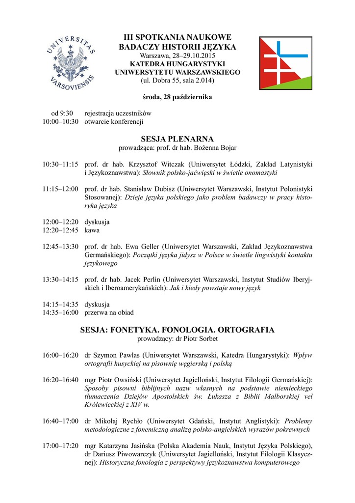 III SPOTKANIA NAUKOWE BADACZY HISTORII JĘZYKA Warszawa, 28–29.10.2015 KATEDRA HUNGARYSTYKI UNIWERSYTETU WARSZAWSKIEGO (ul. Dobra 55, sala 2.014) środa, 28 października od 9:30 rejestracja uczestników 10:00–10:30 otwarcie konferencji SESJA PLENARNA prowadząca: prof. dr hab. Bożenna Bojar 10:30–11:15 prof. dr hab. Krzysztof Witczak (Uniwersytet Łódzki, Zakład Latynistyki i Językoznawstwa): Słownik polsko-jaćwięski w świetle onomastyki 11:15–12:00 prof. dr hab. Stanisław Dubisz (Uniwersytet Warszawski, Instytut Polonistyki Stosowanej): Dzieje języka polskiego jako problem badawczy w pracy historyka języka 12:00–12:20 dyskusja 12:20–12:45 kawa 12:45–13:30 prof. dr hab. Ewa Geller (Uniwersytet Warszawski, Zakład Językoznawstwa Germańskiego): Początki języka jidysz w Polsce w świetle lingwistyki kontaktu językowego 13:30–14:15 prof. dr hab. Jacek Perlin (Uniwersytet Warszawski, Instytut Studiów Iberyjskich i Iberoamerykańskich): Jak i kiedy powstaje nowy język 14:15–14:35 dyskusja 14:35–16:00 przerwa na obiad SESJA: FONETYKA. FONOLOGIA. ORTOGRAFIA prowadzący: dr Piotr Sorbet 16:00–16:20 dr Szymon Pawlas (Uniwersytet Warszawski, Katedra Hungarystyki): Wpływ ortografii husyckiej na pisownię węgierską i polską 16:20–16:40 mgr Piotr Owsiński (Uniwersytet Jagielloński, Instytut Filologii Germańskiej): Sposoby pisowni biblijnych nazw własnych na podstawie niemieckiego tłumaczenia Dziejów Apostolskich św. Łukasza z Biblii Malborskiej vel Królewieckiej z XIV w. 16:40–17:00 dr Mikołaj Rychło (Uniwersytet Gdański, Instytut Anglistyki): Problemy metodologiczne z fonemiczną analizą polsko-angielskich wyrazów pokrewnych 17:00–17:20 mgr Katarzyna Jasińska (Polska Akademia Nauk, Instytut Języka Polskiego), dr Dariusz Piwowarczyk (Uniwersytet Jagielloński, Instytut Filologii Klasycznej): Historyczna fonologia z perspektywy językoznawstwa komputerowego 17:20–18:00 dyskusja 18:00–19:00 wieczerza (sala 3.045) 19:00–20:30 program poetycko-muzyczny „Prorok” na motywach poematu Khalila Gibrana, libańskiego myśliciela, pisarza, poety i plastyka (sala 2.014): Lucyan – czytanie tekstu, sitar, bansuri (flet indyjski), Jacek Kasprzyca – gitara, Piotr Malec – tabla czwartek, 29 października SESJA: MORFOLOGIA prowadzący: dr Szymon Pawlas 9:00–9:20 dr Marek Kaszewski (Akademia Pomorska w Słupsku, Instytut Polonistyki): Z zagadnień słowotwórstwa rzeczownika w słowniku Mikołaja Volckmara z 1596 r. 9:20–9:40 dr Paweł Kornatowski (Uniwersytet Adama Mickiewicza, Zakład Filologii Ugrofińskiej): Status tzw. sufiksów złożonych w morfologii języka węgierskiego 9:40–10:00 dr Marta Woźnicka (Uniwersytet Adama Mickiewicza, Instytut Filologii Germańskiej): Rozwój wskaźników czasu przeszłego od staro- do średniowysoko-niemieckiego 10:00–10:20 mgr Marek Dolatowski (Uniwersytet Adama Mickiewicza, Instytut Filologii Germańskiej): Ablaut w etnolekcie hałcnowskim 10:20-10:40 dr Piotr Sorbet (Uniwersytet Marii Curie-Skłodowskiej, Zakład Studiów Hispanistycznych): Niekauzatywne kontynuanty w zachodnich językach romańskich 10:40–11:10 dyskusja 11:10–11:30 kawa SESJA: LEKSYKA. LEKSYKOLOGIA prowadząca: dr Anna Grzeszak 11:30–11:50 dr Małgorzata Posturzyńska-Bosko (Uniwersytet Marii Curie-Skłodowskiej, Instytut Filologii Romańskiej): Pić jak… Francuz? – analiza leksykalna wyrażeń obrazujących kulturę picia w XVIII-wiecznej Francji na podstawie „Dictionnaire comique, satyrique, critique, burlesque, libre et proverbial” Philiberta-Josepha Le Roux (1786) 11:50-12:10 mgr Paulina Cygańska (Uniwersytet Warszawski, Instytut Języka Polskiego): Rzadkie zapożyczenia w polskich przekładach Ewangelii z XVI wieku: litewskie, ukraińskie, węgierskie i inne 12:10–12:30 dr Katalin Török (Uniwersytet Warszawski, Katedra Hungarystyki): Internacjonalizmy oraz wyrazy wędrowne w języku polskim i węgierskim – kwestia zapożyczenia i adaptacji fonetycznej 12:30–12:50 dr Anna Buncler (Uniwersytet Warszawski, Katedra Hungarystyki): Kształtowanie się systemu zaimkowego w języku fińskim w opisach gramatycznych 12:50–13:30 dyskusja 13:30–14:30 przerwa na obiad SESJA: LEKSYKOGRAFIA. TYPOGRAFIA prowadząca: dr Małgorzata Posturzyńska-Bosko 14:30–14:50 dr hab. Ewa Stala (Uniwersytet Jagielloński, Zakład Filologii Hiszpańskiej): Słowniki P. S. Pallasa i Ph. A. Nemnicha – nowe źródła informacji o słownictwie hiszpańskim 14:50–15:10 dr Anna Grzeszak (Uniwersytet Warszawski, Katedra Hungarystyki): W poszukiwaniu źródeł polskiego działu słownika Piotra Lodereckera z 1605 roku 15:10–15:30 mgr Anna Sawa (Uniwersytet Marii Curie-Skłodowskiej, Instytut Filologii Polskiej): Typograficzna strukturalizacja tekstu w „Regule świętego ojca Benedykta” wydanej w Lublinie w 1635 roku 15:30–16:10 dyskusja i kawa SESJA: VARIA prowadząca: dr Anna Buncler 16:10–16:30 mgr Maciej Hammer (Uniwersytet Jagielloński, Katedra UNESCO do Badań nad Przekładem i Komunikacją Międzykulturową): Problemy związane z przekładem kodeksu szermierczego „Hs. 3227a” w oparciu o teorię skoposu. 16:30–16:50 mgr Michał Wojdylak (Uniwersytet Kazimierza Wielkiego, Wydział Humanistyczny): Łacina jako praźródło języka francuskiego 16:50–17:10 mgr Damian Pisarski (Uniwersytet Śląski, Instytut Filologii Słowiańskiej): Problemy metodologiczne nauczania języka staro-cerkiewno-słowiańskiego – próba analizy 17:10–17:30 dyskusja 17:30 podsumowanie i zakończenie konferencji