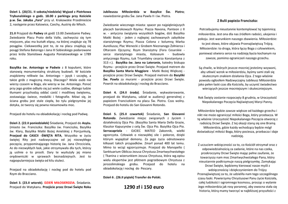 Dzień 1. (20/21. II sobota/niedziela) Wyjazd z Piotrkowa Trybunalskiego o godz. 18.00 z parkingu przy Kościele p.w. Św. Jakuba „Fara” przy ul. Krakowskie Przedmieście 2, następnie przez Katowice, Czechy, Austrię do Włoch. 21.II Przyjazd do Padwy ok godź 13.00 Zwiedzanie Padwy. Zwiedzanie Placu Prato della Valle, zachwycisz się tym miejscem, plac ma kształt elipsy, na której znajduje się 78 posągów. Ciekawostką jest to, że na placu znajdują się posągi Stefana Batorego i Jana III Sobieskiego podarowane przez króla Stanisława Augusta Poniatowskiego w 1789 roku. Bazylika św. Antoniego w Padwie z 8 kopułami, które stanowią monumentalną strukturę budowli. W kościele znajdziemy relikwie św. Antoniego – język i szczękę, a także grób z magiczną mocą. Dlaczego? Wiele osób nie wierzy czasem w Boga, ale wierzy w św. Antoniego. Ponoć przy jego grobie odbyło się już wiele cudów, dlatego ludzie tłumami przychodzą oddać cześć i modlitwę świętemu, zostawiając świece, medaliki i fotografie. Mówi się, że ściana grobu jest stale ciepła, bo tylu pielgrzymów jej dotyka, że tworzy się pewna niesamowita moc. Przejazd do hotelu na obiadokolację i nocleg pod Padwę. Dzień 2. (22.II poniedziałek) Śniadanie, Przejazd do Asyżu. (miasto św. Franciszka: Bazylika św. Franciszka, Bazylika św. Klary, Bazylika Matki Bożej Anielskiej z Porcjunkulą, Przejazd do CASCII -ŚWIĘTA RITA, Wszystko w życiu świętej Rity jest nadzwyczajne od jej niezwykłego poczęcia, przypominającego historię św. Jana Chrzciciela, Az do niezwykłych łask, jakie otrzymywała dla tych, którzy ją usilnie o to prosili. Dary te wysłużyły jej miano orędowniczki w sprawach beznadziejnych. Jest to najpopularniejsza święta od kilu stuleci. Przejazd na obiadokolację i nocleg pod do hotelu pod Rzym do Bracciano. Jubileuszu Miłosierdzia w Bazylice Św. nawiedzenie grobu Św. Jana Pawła II i św. Piotra. Z Bulii papieża Franciszka: Zwiedzanie wiecznego miasta: spacer po najpiękniejszych placach barokowych Rzymu: Piazza Navona, Panteon z II w. - antyczna świątynia wszystkich bogów, dziś Bazylika Matki Bożej - jeden z najlepiej zachowanych zabytków starożytnego Rzymu; Piazza Colona z kolumną Marka Aureliusza; Plac Wenecki z Grobem Nieznanego Żołnierza i Ołtarzem Ojczyzny; Rzym Starożytny (Fora Cesarskie serce starożytnego miasta, Koloseum - budowla antycznego Rzymu, Łuk Triumfalny cesarza Konstantyna z 313 r.). Bazylika św. Jana na Lateranie, katedry biskupa Rzymu - przejście przez Drzwi Święte. Przejazd metrem do Bazylika Santa Maria Maggiore - Matki Bożej Większej przejście przez Drzwi Święte. Przejazd metrem do Bazyliki Św. Pawła za murami - przejście przez Drzwi Święte. Powrót na obiadokolację i nocleg do Bracciano. Dzień 4. (24.II środa). Śniadanie, wykwaterowanie, przejazd do Watykanu, udział w audiencji generalnej z papieżem Franciszkiem na placu Św. Piotra. Czas wolny. Przejazd do hotelu do San Giovanni Rotondo. Dzień 5. (25.II czwartek) Śniadanie, San Giovanni Rotondo. Zwiedzanie miejsc związanych z życiem i działalnością Ojca Pio. (Bazylika Santa Maria Della Grazie, Klasztor Kapucynów z celą Św. Ojca Pio. Bazylika Ojca Pio. Serracapriola - OJCIEC MATEO Zakonnik, wielki egzorcysta. Człowiek o niezwykłej sile i pokorze, dzięki którym wypędzał demony. Za jego życia odnotowano kilkaset takich przypadków. Zmarł ponad 400 lat temu. Mimo to wciąż egzorcyzmuje. Przejazd do Manopello ( Sanktuarium Oblicza Jezusa Chrystusa Zmartwychwstałego ( Tkanina z wizerunkiem Jezusa Chrystusa, która wg.opisu wielu ekspertów jest płótnem pogrzebowym Chrystusa z jerozolimskiego grobu. Przejazd do hotelu na obiadokolację i nocleg do Pescary. Dzień 6 . (26.II piątek) Transfer do Polski. Dzień 3. (23.II wtorek). DZIEŃ MIŁOSIERDZIA. Śniadanie. Przejazd do Watykanu. Przejście przez Drzwi Święte Roku Piotra; 1290 zł i 150 euro Potrzebujemy nieustannie kontemplować tę tajemnicę miłosierdzia. Jest ona dla nas źródłem radości, ukojenia i pokoju. Jest warunkiem naszego zbawienia. Miłosierdzie: to jest słowo, które objawia Przenajświętszą Trójcę. Miłosierdzie: to droga, która łączy Boga z człowiekiem, ponieważ otwiera serce na nadzieję bycia kochanym na zawsze, pomimo ograniczeń naszego grzechu. Są chwile, w których jeszcze mocniej jesteśmy wzywani, aby utkwić wzrok w miłosierdziu, byśmy sami stali się skutecznym znakiem działania Ojca. Z tego właśnie powodu ogłosiłem Nadzwyczajny Jubileusz Miłosierdzia jako pełen łaski czas dla Kościoła, by uczynić świadectwo wierzących jeszcze mocniejszym i skuteczniejszym. Rok Święty zostanie rozpoczęty 8 grudnia, w Uroczystość Niepokalanego Poczęcia Najświętszej Maryi Panny. Miłosierdzie będzie zawsze większe od każdego grzechu i nikt nie może ograniczyć miłości Boga, który przebacza. W tę właśnie Uroczystość Niepokalanego Poczęcia otworzę z radością Drzwi Święte. Z tej okazji staną się one Bramą Miłosierdzia, gdzie każdy wchodzący będzie mógł doświadczyć miłości Boga, który pociesza, przebacza i daje nadzieję. Z uczuciem wdzięczności za to, co Kościół otrzymał oraz z odpowiedzialnością za zadanie, które na nas czeka, przekroczymy Drzwi Święte mając pełne zaufanie, że towarzyszy nam moc Zmartwychwstałego Pana, który nieustannie podtrzymuje naszą pielgrzymkę. Zamykając Drzwi Święte, będziemy kierować nasze myśli z wdzięcznością i dziękczynieniem do Trójcy Przenajświętszej za to, że udzieliła nam tego szczególnego czasu łaski. Powierzymy Chrystusowi Panu życie Kościoła, całej ludzkości i ogromnego kosmosu, prosząc o wylanie Jego miłosierdzia jak rosy porannej, aby owocna stała się historia, którą mamy tworzyć w najbliższej przyszłości z zaangażowaniem wszystkich. O jakże pragnę, aby nadchodzące lata były naznaczone miłosierdziem tak, byśmy wy