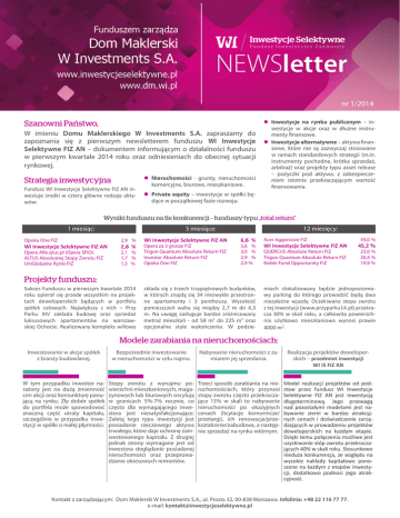 nr 1/2014 Szanowni Państwo, W imieniu Domu Maklerskiego W Investments S.A. zapraszamy do zapoznania się z pierwszym newsletterem funduszu WI Inwestycje Selektywne FIZ AN – dokumentem informującym o działalności funduszu w pierwszym kwartale 2014 roku oraz odniesieniach do obecnej sytuacji rynkowej. Strategia inwestycyjna Fundusz WI Inwestycje Selektywne FIZ AN inwestuje środki w cztery główne rodzaje aktywów: zz Nieruchomości - grunty, nieruchomości komercyjne, biurowe, mieszkaniowe. zz Inwestycje na rynku publicznym – inwestycje w akcje oraz w dłużne instrumenty finansowe. zz Inwestycje alternatywne – aktywa finansowe, które nie są zazwyczaj stosowane w ramach standardowych strategii (m.in. instrumenty pochodne, krótka sprzedaż, arbitraż) oraz projekty typu asset release – pożyczki pod aktywa, z zabezpieczeniem istotnie przekraczającym wartość finansowania. zz Private equity – inwestycje w spółki będące w początkowej fazie rozwoju. Wyniki funduszu na tle konkurencji – funduszy typu „total return” 1 miesiąc: 3 miesiące: Opoka One FIZ 2,9 % Opera Alfa-plus.pl (Opera SFIO) ALTUS Absolutnej Stopy Zwrotu FIZ UniGlobalne Rynki FIZ 2,1 % 1,7 % 1,5 % WI Inwestycje Selektywne FIZ AN 2,6 % WI Inwestycje Selektywne FIZ AN Opera za 3 grosze FIZ Trigon Quantum Absolute Return FIZ Investor Absolute Return FIZ Opoka One FIZ 12 miesięcy: 6,6 % 5,6 % 3,0 % 2,9 % 2,9 % Acer Aggressive FIZ WI Inwestycje Selektywne FIZ AN QUERCUS Absolute Return FIZ Trigon Quantum Absolute Return FIZ Noble Fund Opportunity FIZ 59,0 % 45,2 % 23,0 % 20,4 % 19,9 % Projekty funduszu: Sukces Funduszu w pierwszym kwartale 2014 roku opierał się przede wszystkim na projektach deweloperskich będących w portfelu spółek celowych. Największy z nich – Przy Parku XIV zakłada budowę oraz sprzedaż luksusowych apartamentów na warszawskiej Ochocie. Realizowany kompleks willowy składa się z trzech trzypiętrowych budynków, w których znajdą się 34 niezwykle przestronne apartamenty i 3 penthousy. Wysokość pomieszczeń waha się między 2,7 m do 4,3 m. Na uwagę zasługuje bardzo zróżnicowany metraż mieszkań - od 58 m2 do 225 m2 oraz opcjonalne style wykończenia. W podzie- miach zlokalizowany będzie jednopoziomowy parking do którego prowadzić będą dwa niezależne wjazdy. Oczekiwana stopa zwrotu z tej inwestycji (www.przyparku14.pl) przekracza 30% w skali roku, a całkowita powierzchnia użytkowo mieszkaniowa wynosi prawie 4000 m2. Modele zarabiania na nieruchomościach: Inwestowanie w akcje spółek z branży budowlanej. Bezpośrednie inwestowanie w nieruchomości w celu najmu. Nabywanie nieruchomości z zamiarem jej sprzedania. Realizacja projektów deweloperskich – przedmiot inwestycji WI IS FIZ AN W tym przypadku inwestor narażony jest na dużą zmienność cen akcji oraz koniunkturę panującą na rynku. Zły dobór spółek do portfela może spowodować znaczną część utraty kapitału, szczególnie w przypadku inwestycji w spółki o małej płynności. Stopy zwrotu z wynajmu powierzchni mieszkaniowych, magazynowych lub biurowych oscylują w granicach 5%-7% rocznie, co często dla wymagającego inwestora jest niesatysfakcjonujące. Zaletą tego typu inwestycji jest posiadanie rzeczowego aktywa trwałego, które daje ochronę zainwestowanego kapitału. Z drugiej jednak strony wymagane jest od inwestora doglądanie posiadanej nieruchomości oraz przeprowadzanie okresowych remontów. Trzeci sposób zarabiania na nieruchomościach, który przynosi stopy zwrotu często przekraczające 15% w skali to nabywanie nieruchomości po okazyjnych cenach (licytacje komornicze/ przetargi), ich renowacja/przekształcenie/zabudowa, a następnie sprzedaż na rynku wtórnym. Model realizacji projektów od podstaw przez fundusz WI Inwestycje Selektywne FIZ AN jest inwestycją długoterminową. Jego przewagą nad pozostałymi modelami jest nabywanie ziemi w bardzo atrakcyjnych cenach i doświadczenie zarządzających w prowadzeniu projektów deweloperskich na każdym etapie. Dzięki temu połączeniu możliwe jest uzyskiwanie stóp zwrotu przekraczających 40% w skali roku. Stosunkowo nieduża konkurencja, ze względu na wysokie nakłady kapitałowe ponoszone na każdym z etapów inwestycji, dodatkowo podnosi jego atrakcyjność. Kontakt z zarządzającym: Dom Maklerski W Investments S.A., ul. Prosta 32, 00-838 Warszawa. Infolinia: +48 22 116 77 77. e-mail: [email protected] Przy parku XIV - postęp prac Planowane inwestycje: Fundusz obecnie negocjuje warunki inwestycji na warszawskim Mokotowie, w której występowałby jako współinwestor. Projekt zakłada zakup ziemi od banku ze znacznym dyskontem, budowę, komercjalizację oraz późniejszą sprzedaż budynku biurowego klasy A. Czas trwania projektu to 3 lata, a przewidywane ROE przekracza 80%. Rynek mieszkaniowy Czwarty kwartał roku był bardzo dobry pod względem liczby transakcji na rynku pierwotnym tzn. liczba sprzedanych mieszkań była na podobnym poziomie jak w rekordowym pierwszym kwartale 2007 roku. Wzrosła liczba mieszkań wprowadzonych do sprzedaży – wg danych zbieranych przez REAS w 6 największych polskich aglomeracjach – do sprzedaży wprowadzono około 7.8 tys. mieszkań, a w całym 2013 roku do sprzedaży w tych miastach weszło ponad 24 tys. mieszkań. Jest to liczba wyraźnie niższa od poziomów notowanych kilka lat wstecz kiedy to do obrotu wprowadzano ponad 35 tys. mieszkań rocznie. Jest to niewątpliwie skutkiem wejścia w życie ustawy deweloperskiej, co najpierw zaowocowało rekordowo wysoką liczbą rozpoczynanych inwestycji na początku 2012 roku, a następnie bardzo wyraźnym spadkiem. Dzięki wyraźnej przewadze liczby sprzedanych mieszkań nad wprowadzonymi na rynek, łączna liczba mieszkań oferowanych do sprzedaży w sześciu aglomeracjach zmniejszyła się szósty kwartał z rzędu i wyniosła na koniec grudnia nieco ponad 41 tysięcy jednostek. Było to ponad 6% mniej niż trzy miesi