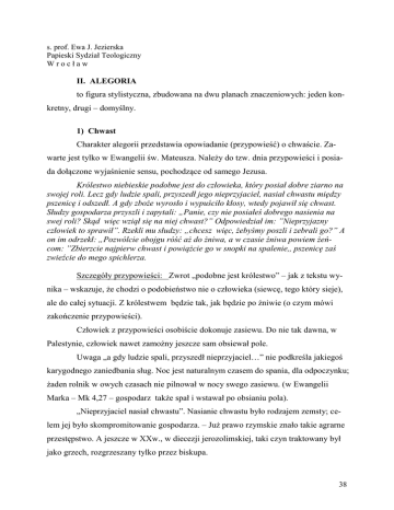 s. prof. Ewa J. Jezierska Papieski Sydział Teologiczny Wrocław II. ALEGORIA to figura stylistyczna, zbudowana na dwu planach znaczeniowych: jeden konkretny, drugi – domyślny. 1) Chwast Charakter alegorii przedstawia opowiadanie (przypowieść) o chwaście. Zawarte jest tylko w Ewangelii św. Mateusza. Należy do tzw. dnia przypowieści i posiada dołączone wyjaśnienie sensu, pochodzące od samego Jezusa. Królestwo niebieskie podobne jest do człowieka, który posiał dobre ziarno na swojej roli. Lecz gdy ludzie spali, przyszedł jego nieprzyjaciel, nasiał chwastu między pszenicę i odszedł. A gdy zboże wyrosło i wypuściło kłosy, wtedy pojawił się chwast. Słudzy gospodarza przyszli i zapytali: „Panie, czy nie posiałeś dobrego nasienia na swej roli? Skąd więc wziął się na niej chwast?” Odpowiedział im: ”Nieprzyjazny człowiek to sprawił”. Rzekli mu słudzy: „chcesz więc, żebyśmy poszli i zebrali go?” A on im odrzekł: „Pozwólcie obojgu róść aż do żniwa, a w czasie żniwa powiem żeńcom: ”Zbierzcie najpierw chwast i powiążcie go w snopki na spalenie,, pszenicę zaś zwieźcie do mego spichlerza. Szczegóły przypowieści: Zwrot „podobne jest królestwo” – jak z tekstu wynika – wskazuje, że chodzi o podobieństwo nie o człowieka (siewcę, tego który sieje), ale do całej sytuacji. Z królestwem będzie tak, jak będzie po żniwie (o czym mówi zakończenie przypowieści). Człowiek z przypowieści osobiście dokonuje zasiewu. Do nie tak dawna, w Palestynie, człowiek nawet zamożny jeszcze sam obsiewał pole. Uwaga „a gdy ludzie spali, przyszedł nieprzyjaciel…” nie podkreśla jakiegoś karygodnego zaniedbania sług. Noc jest naturalnym czasem do spania, dla odpoczynku; żaden rolnik w owych czasach nie pilnował w nocy swego zasiewu. (w Ewangelii Marka – Mk 4,27 – gospodarz także spał i wstawał po obsianiu pola). „Nieprzyjaciel nasiał chwastu”. Nasianie chwastu było rodzajem zemsty; celem jej było skompromitowanie gospodarza. – Już prawo rzymskie znało takie agrarne przestępstwo. A jeszcze w XXw., w diecezji jerozolimskiej, taki czyn traktowany był jako grzech, rozgrzeszany tylko przez biskupa. 38 O jaki chwast chodziło? Biblia Wujka stwierdza, że nie był to znany nam kąkol. Grecka nazwa dzidzanion oznacza mało znaną u nas tzw. życicę roczna (Lolium temulentum L.) o trujących ziarnach, podobną przed wykłoszeniem do pszenicy. Polscy botanicy porównują ten chwast do naszego perzu. Rozmowa sług z gospodarzem: słudzy proponują zabranie się do pielenia chwastu. Propozycja jest sama w sobie rozsądna i stosowana. Ale gospodarz podaje przekonująca rację swojej odmowy: korzenie pszenicy i życicy (chwastu) są poplątane, ponieważ korzeń chwastu jest giętki. Wyrywając chwast, wyrwałoby się i pszenicę. Sens dialogu można streścić zdaniem: „Jeszcze nie czas na taka interwencję, bo wszystko można by popsuć”. Żniwa mają dokonać żeńcy (nie słudzy)! Do dzisiaj stosowany jest w Arabów zwyczaj ścinania sierpami. Ponieważ pszenic wyrasta wyżej, ponad życicę, pada rozkaz „Podnieście wasze ręce” – i wtedy żniwiarze ścinają pszenicę. Potem ścina się chwast i wiążę w snopki. W Palestynie snopki chwastu są cennym paliwem, a ziarnami chwastu karmi się drób, dla którego nie są one szkodliwe. Obraz żniw przedstawiony w przypowieści zgodna jest z rzeczywistością, nie wykracza poza obraz rzeczywisty. Jednak dokładność opisu wskazuje na pointę przypowieści, na jej zastosowanie eschatologiczne. Żniwo nawiązuje do sądu ostatecznego. Wyjaśnienie przypowieści przez Jezusa, podaje Mateusza w 13,36-43: Wtedy odprawił tłumy i wrócił do domu. Tam przystąpili do Niego uczniowie, mówiąc: „Wyjaśnij nam przypowieść o chwaście”. Odpowiedział: „Tym, który sieje dobre nasienie, jest Syn Człowieczy. Rolą jest świat, dobrym nasieniem są synowie królestwa, chwastem zaś synowie Złego. Nieprzyjacielem, który posiał chwast, jest diabeł; żniwem jest koniec świata, a żeńcami są aniołowie. Jak więc zbiera się chwast i spala w ogniu, tak będzie przy końcu świata. Syn Człowieczy pośle aniołów swoich, ci zbiorą z Jego królestwa wszystkie zgorszenia oraz tych, którzy dopuszczaj się nieprawości i wrzuca ich w piec rozpalony, tam będzie płacz i zgrzytanie zębów. <Wtedy sprawiedliwi jaśnieć będą w królestwie Ojca swego> (Dan 12,3). Kto ma uszy, niechaj słucha. Część wyjaśniająca przypowieści jest literacko odmienna. Jest tu rodzaj zwięzłego słownika rzeczowników, a całość ma charakter alegoryczny. W przedstawieniu tekstu stosuje trzy sposoby przedstawiania: równanie – porównanie – podstawienie. 39 Równanie zawierają wiersze, gdzie występuje identyfikowanie (jest to rodzaj słownika): Tym który sieje = Syn Człowieczy; rola = świat; dobre nasienie = synowie królestwa; chwast = Żły; nieprzyjaciel = diabeł; żniwo = koniec świata; = żeńcy = aniołowie. Porównanie następuje po tych identyfikacjach (po tym słowniku): „jak więc zbiera się chwast i spala w ogniu, tak będzie przy końcu świata”: Podstawienie dotyczy: „żeńców” – którymi są w w..41 aniołowie; „dobrego nasienia” – sa nim synowie królestwa ; „synów Złego” – są nimi wszystkie zgorszenia i ci, którzy dopuszczają się nieprawości”. W końcowej części wyjaśnienia Jezusa (jakie podaje Mateusz) nie ma już metafor; świat, diabeł, nie ma wzmianki o świecie, ani o diable. Można zatem powiedzieć, ze wyjaśnienie przypowieści o chwaście ma wyraźnie dwuczęściowy podział, nasuwa myśl o redakcyjnym dodatku do wyjaśnienia. Gatunek literacki tego opowiadania (przypowieści) można określić następująco: po czystej przypowieści o wydźwięku eschatologicznym, następuje wyjaśnienie alegoryczne. Całość można więc określić jako przypowieść alegoryzującą. Naukę przypowieści