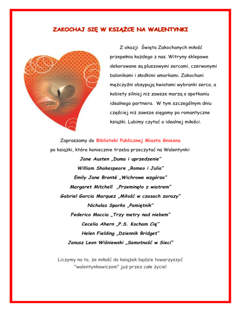 ZAKOCHAJ SIĘ W KSIĄŻCE NA WALENTYNKI Z okazji Święta Zakochanych miłość przepełnia każdego z nas. Witryny sklepowe dekorowane są pluszowymi sercami, czerwonymi balonikami i słodkimi amorkami. Zakochani mężczyźni obsypują kwiatami wybranki serca, a kobiety silniej niż zawsze marzą o spotkaniu idealnego partnera. W tym szczególnym dniu częściej niż zawsze sięgamy po romantyczne książki. Lubimy czytać o idealnej miłości. Zapraszamy do Biblioteki Publicznej Miasta Gniezna po książki, które koniecznie trzeba przeczytać na Walentynki: Jane Austen „Duma i uprzedzenie” William Shakespeare „Romeo i Julia” Emily Jane Brontë „Wichrowe wzgórza” Margaret Mitchell „Przeminęło z wiatrem” Gabriel Garcia Marquez „Miłość w czasach zarazy” Nicholas Sparks „Pamiętnik” Federico Moccia „Trzy metry nad niebem” Cecelia Ahern „P.S. Kocham Cię” Helen Fielding „Dziennik Bridget” Janusz Leon Wiśniewski „Samotność w Sieci” Liczymy na to, że miłość do książek będzie towarzyszyć "walentynkowiczom" już przez całe życie!