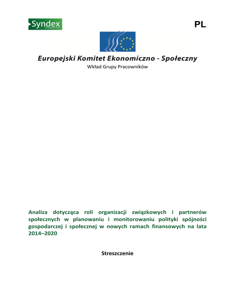 PL Wkład Grupy Pracowników Analiza dotycząca roli organizacji związkowych i partnerów społecznych w planowaniu i monitorowaniu polityki spójności gospodarczej i społecznej w nowych ramach finansowych na lata 2014–2020 Streszczenie Rola organizacji związkowych i partnerów społecznych w planowaniu i monitorowaniu polityki spójności gospodarczej i społecznej w nowych ramach finansowych na lata 2014–2020 1. Konsekwencje decyzji dotyczących budżetu UE na lata 2014–2020 w kontekście kryzysu społeczno-gospodarczego, w porównaniu z poprzednim okresem 2007–2013. Po paru miesiącach trudnych dyskusji i negocjacji, w kontekście bezprecedensowego kryzysu finansowego, gospodarczego i społecznego w państwach członkowskich UE, instytucje Unii Europejskiej (Komisja, Rada i Parlament) przyjęły na początku lipca 2013 r. wieloletnie ramy finansowe, czyli budżet UE na lata 2014–2020. Budżet UE na lata 2014–2020 będzie w ostatecznym rachunku o około 7% mniejszy od budżetu z poprzedniego okresu 2007–2013 (pokrycie wydatków na poziomie 908 mld EUR w porównaniu z 977 mld EUR), nawet jeśli osiągnięte porozumienie przewiduje pewną elastyczność wykorzystywania funduszy. A przecież według „sprawozdania strategicznego” Komisji Europejskiej w sprawie wdrażania programów dotyczących polityki spójności gospodarczej i społecznej w latach 2007–2013 (opublikowanego 18 kwietnia 2013 r.), inwestycje finansowane z EFS, EFRR i Funduszu Spójności przyczyniły się do przezwyciężenia kryzysu i tworzenia wzrostu gospodarczego. Pozwoliły między innymi znacząco zwiększyć liczbę osób korzystających ze wsparcia w zakresie zatrudnienia (z 10 mln osób rocznie w okresie przed 2010 r. do prawie 15 mln osób rocznie od tego czasu). Dzięki tym funduszom od 2010 r. istotnie wzrosło również wsparcie dla MŚP: utworzono około 400 tys. miejsc pracy (z czego połowę w okresie 2010–2011), w tym 15 600 stanowisk w dziedzinie badań i 167 000 stanowisk w sektorze MŚP. Za pośrednictwem trzech funduszy – Europejskiego Funduszu Rozwoju Regionalnego (EFRR), Europejskiego Funduszu Społecznego (EFS) i Funduszu Spójności – w latach 2007–2013 UE zainwestowała w ramach polityki spójności gospodarczej i społecznej 347 mld EUR (w tym z EFS: 76 mld EUR) w 27 państwach członkowskich. Kwota ta stanowi 35% całkowitego budżetu UE (975 mld EUR) na ten okres. Warto tu przypomnieć cele, budżet i główne zasady interwencji w ramach programów na lata 2007– 2013 oraz zmiany w programie na lata 2014–2020: polityka spójności zapewnia ramy inwestycyjne oraz system ich realizacji, który jest niezbędny do osiągnięcia celów określonych w bieżącej europejskiej strategii politycznej (strategia lizbońska w pierwszej dekadzie 21. wieku, strategia „Europa 2020” w drugiej dekadzie). Polityka spójności została ponownie przeanalizowana z punktu widzenia poprawy skuteczności jej wdrażania i jej lepszego dostosowania do celów strategii Europa 2020. W celu spójnego ustrukturyzowania polityki spójności regionalnej, w okresie programowania 2007–2013 skupiono się na trzech celach wspólnotowych: konwergencji; konkurencyjności regionalnej i zatrudnieniu oraz na europejskiej współpracy terytorialnej. Cele te są finansowane z jednego lub kilku funduszy w ramach krajowych lub regionalnych programów operacyjnych (PO). W okresie programowania 2014–2020 uwzględniono pięć zasadniczych celów strategii „Europa 2020”: 1. Zatrudnienie: zapewnienie pracy dla 75% populacji w wieku od 20 do 64 lat. 2. Badania naukowe i rozwój: inwestowanie 3 % PKB UE w badania i rozwój. 3. Zmiana klimatu i energia: ograniczenie emisji gazów cieplarnianych o 20% w porównaniu z 1990 r., osiągnięcie 20-procentowego udziału energii ze źródeł odnawialnych i zwiększenie o 20% efektywności energetycznej. 2 Rola organizacji związkowych i partnerów społecznych w planowaniu i monitorowaniu polityki spójności gospodarczej i społecznej w nowych ramach finansowych na lata 2014–2020 4. Edukacja: obniżenie wskaźnika przedwczesnego przerywania nauki do poniżej 10%, dyplom studiów wyższych dla co najmniej 40% populacji w wieku od 30 do 34 lat. 5. Ubóstwo i wykluczenie społeczne: zmniejszenie o co najmniej 20 mln liczby osób znajdujących się w sytuacji ubóstwa lub wykluczenia społecznego lub nimi zagrożonych. Innym istotnym elementem uwzględnionym w celach budżetu UE na lata 2014–2020 jest zatwierdzone przez Radę i Parlament Europejski zalecenie Komisji Europejskiej w sprawie asygnowania co najmniej 20% budżetu UE na projekty dotyczące pakietu klimatycznoenergetycznego (dyrektywy europejskie 3X20) i wykorzystywania w tym celu także środków EBI. Jest to postrzegane jako jeden ze sposobów wyjścia z kryzysu, jako że miałoby to istotny wpływ na zatrudnienie i zarządzanie transformacją społeczną i zawodową, gdzie istotnym wyzwaniem jest zaspokojenie potrzeb w zakresie szkoleń. Można tu wspomnieć o doświadczeniach Hiszpanii dotyczących dobrych praktyk partnerskiej współpracy z organizacjami związkowymi (w latach 2007– 2013) w realizowaniu tego rodzaju projektów (Program Empleaverde, projekt Informa-Ambiental). 2. Kwestie związane ze stosowaniem art. 5 nowego rozporządzenia, jeśli chodzi o udział partnerów społecznych w świetle doświadczeń lat 2007–2013. Tymczasem (i to jest główny przedmiot niniejszej analizy), zatwierdzone przez Radę i Parlament Europejski propozycje Komisji Europejskiej dotyczące funduszy objętych wspólnymi ramami strategicznymi na lata 2014–2020 jednoznacznie zobowiązują państwa członkowskie do angażowania partnerów gospodarczych i społecznych, w tym organizacji związkowych, we wszystkie etapy procesu zarządzania funduszami objętymi zakresem niniejszego badania, tzn. funduszami strukturalnymi (EFS i EFRR) oraz Funduszem Spójności służącymi realizacji polityki spójności 