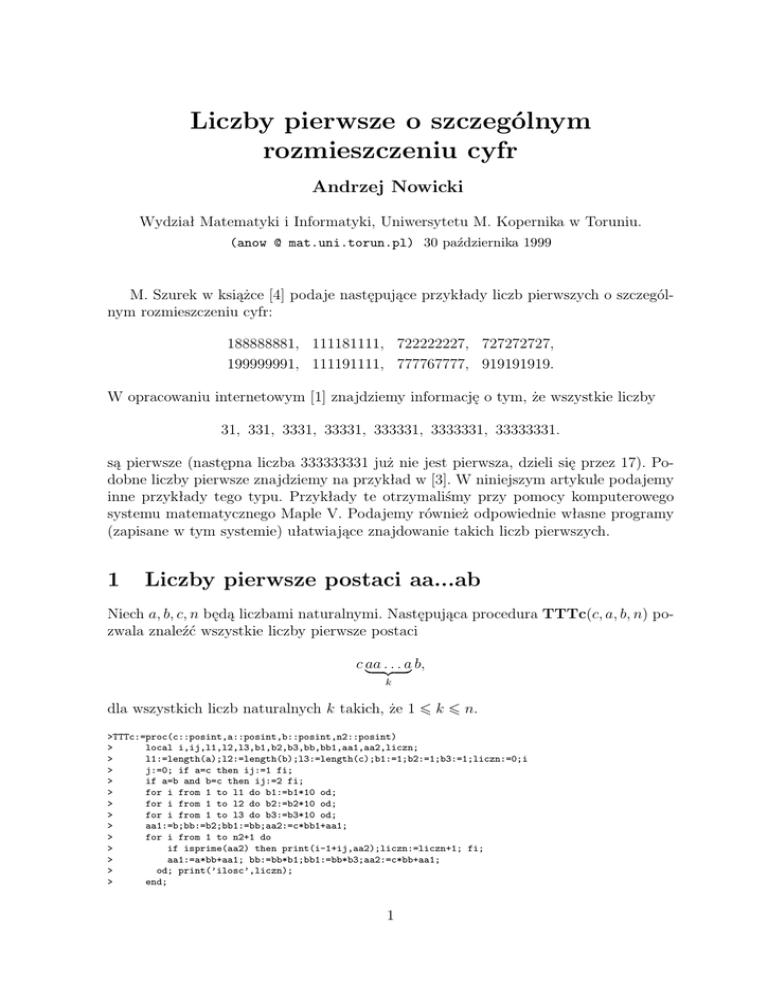 są pierwsze (następna liczba 333333331 już nie jest pierwsza, dzieli się przez 17). Podobne liczby pierwsze znajdziemy na przykład w [3]. W niniejszym artykule podajemy