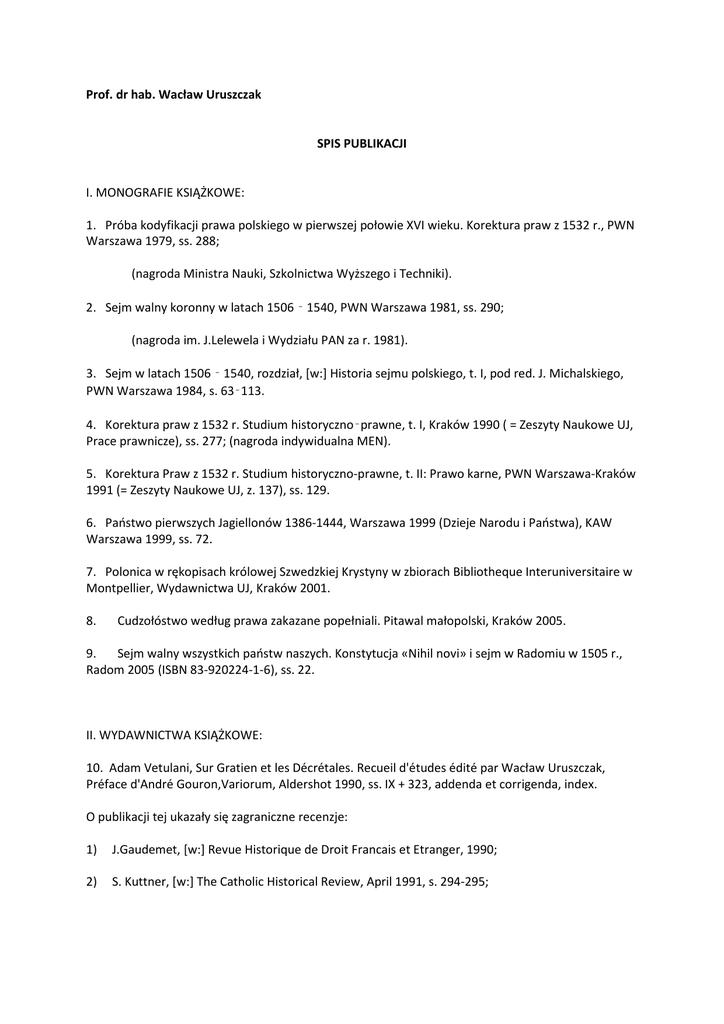 Prof. dr hab. Wacław Uruszczak SPIS PUBLIKACJI I. MONOGRAFIE KSIĄŻKOWE: 1. Próba kodyfikacji prawa polskiego w pierwszej połowie XVI wieku. Korektura praw z 1532 r., PWN Warszawa 1979, ss. 288; (nagroda Ministra Nauki, Szkolnictwa Wyższego i Techniki). 2. Sejm walny koronny w latach 1506 ‑ 1540, PWN Warszawa 1981, ss. 290; (nagroda im. J.Lelewela i Wydziału PAN za r. 1981). 3. Sejm w latach 1506 ‑ 1540, rozdział, [w:] Historia sejmu polskiego, t. I, pod red. J. Michalskiego, PWN Warszawa 1984, s. 63‑113. 4. Korektura praw z 1532 r. Studium historyczno‑prawne, t. I, Kraków 1990 ( = Zeszyty Naukowe UJ, Prace prawnicze), ss. 277; (nagroda indywidualna MEN). 5. Korektura Praw z 1532 r. Studium historyczno-prawne, t. II: Prawo karne, PWN Warszawa-Kraków 1991 (= Zeszyty Naukowe UJ, z. 137), ss. 129. 6. Państwo pierwszych Jagiellonów 1386-1444, Warszawa 1999 (Dzieje Narodu i Państwa), KAW Warszawa 1999, ss. 72. 7. Polonica w rękopisach królowej Szwedzkiej Krystyny w zbiorach Bibliotheque Interuniversitaire w Montpellier, Wydawnictwa UJ, Kraków 2001. 8. Cudzołóstwo według prawa zakazane popełniali. Pitawal małopolski, Kraków 2005. 9. Sejm walny wszystkich państw naszych. Konstytucja «Nihil novi» i sejm w Radomiu w 1505 r., Radom 2005 (ISBN 83-920224-1-6), ss. 22. II. WYDAWNICTWA KSIĄŻKOWE: 10. Adam Vetulani, Sur Gratien et les Décrétales. Recueil d'études édité par Wacław Uruszczak, Préface d'André Gouron,Variorum, Aldershot 1990, ss. IX + 323, addenda et corrigenda, index. O publikacji tej ukazały się zagraniczne recenzje: 1) J.Gaudemet, [w:] Revue Historique de Droit Francais et Etranger, 1990; 2) S. Kuttner, [w:] The Catholic Historical Review, April 1991, s. 294-295; 3) R. Weigand, [w:] Zeitschrift der Savigny-Stiftung f. Rechtsgeschichte, Kan. Abt. LXXVIII, 1992, s. 597-601. Cytowania: Tractatus criminum saeculi XII editionem criticam congessit Giovanni Minucci, Monduzzi Editore 2002 (s/.lxxiv n., lxxix n.). 11. Adam Vetulani, Institutions de l'Eglise et canonistes au Moyen Age, Recueil d'études édité par Wacław Uruszczak, Variorum, Aldershot 1991, ss. 334, addenda et corrigenda, index. 12. Volumina Constitutionum, Tom I : 1493-1549, Volumen 1 : 1493-1526, Wydawnictwo Sejmowe, Warszawa 1996, ss. 498 (Edition de la legislation de la Diete Polonaise de 1493 a 1549), pp. 498 (wespół z prof. Stanisławem Grodziskim i Ireną Dwornicką). 13. Prawo wyznaniowe. Wprowadzenie i opracowanie Wacław Uruszczak, Centrum Prawne Wydawnictwo Kraków 1997, ss. 370. 14. Volumina Constitutionum, Tom I: 1493-1549, Volumen 2: 1526-1549, Wydawnictwo Sejmowe, Warszawa 2000, ss. 370 (Edition de la legislation de la Diete Polonaise de 1493 a 1549), (wespół z prof. Stanisławem Grodziskim i Ireną Dwornicką). 15. Prawo wyznaniowe. Zbiór przepisów, Kantor Wydawniczy Zakamycze 2003, ss. 623, (wespół ze Zdzisławem Zarzyckim). 16. Acta maleficorum Wisniciae. Księga złoczyńców Sądu Kryminalnego w Wiśniczu, Kraków – Collegium Columbinum 2004, przy współpracy Ireny Dwernickiej. Recenzje: W. Kammler, Kwartalnik Historyczny, Nr 1, 2005. 17. Radomiensis Conventionis Decreta Alexandri Regis. Konstytucje wieczyste Sejmu Radomskiego 1505 Roku, Radom 2005 (wespół z: W. Kacperskim, E. Orzechowską, A. Karabowicz, G. Kowalskim), ss. 63. 18. Volumina Constitutionum, Tom II : 1550-1609, Volumen 1 : 1550-1585, Wydawnictwo Sejmowe, Warszawa 2005, ss. 516 (wespół z prof. Stanisławem Grodziskim i Ireną Dwornicką). IV. SKRYPTY: 19. Les cours de droit: Histoire du droit privé, vol. I [Wykłady z prawa: Historia prawa prywatnego, t. I], wyd.: Université de Montpellier, Faculté de Droit et des Sciences Economiques, Corpo.de Droit, Montpellier 1985. V. ROZPRAWY I ARTYKUŁY: 20. O genezie i dacie statutu krakowskiego Władysława Jagiełły, Czasopismo Prawno‑Historyczne, t. XX, 1968, z. 2, s. 59‑65. 21. Najdawniejszy zbiór systematyczny prawa polskiego z końca XV w., Czasopismo Prawno‑Historyczne, t. XXI, 1969, z. 1, s. 159‑173, wspólnie z Stefanem K. Rzoncą. 22. W sprawie najnowszych wydawnictw pism Pawła Włodkowica, Czasopismo Prawno‑Historyczne, t. XXII, 1970, z. 2, s. 225‑233, wspólnie z Richardem Kubiakiem. 23. Komputer na usługach współczesnej dekretystyki, Prawo Kanoniczne, t. XV, 1972, nr 1‑2, s. 304‑309. 24. Dzieło dekretysty Omnibona w rękopisie Biblioteki Miejskiej w Cambrai, Analecta Cracoviensia, t. 4, 1972, s. 239‑266, wspó1nie z Adamem Vetulanim. 25. Krakowski komentarz reguł prawa z początku XVI wieku, Czasopismo Prawno‑Historyczne, t. XXV, 1973, 2, s. 69‑88. 26. Violenta expulsio. Z badań nad procesem posesoryjnym w prawie polskim I poł. XVI wieku, Zeszyty Naukowe UJ, nr CCCLIX, Prace Prawnicze 63, 1974, s. 227‑246. 27. Próba kodyfikacji prawa polskiego w okresie Odrodzenia, Dzieje kodyfikacji prawa. Materiały na konferencję historyków prawa w Karpaczu, maj 1974, b.m. wyd., s. 72‑92. 28. Król i sejm w świetle Korektury praw z 1532 r. Z badań nad przyczynami jej upadku, [w:] Krakowskie Studia Prawnicze, VIII, 1975, s. 123‑141. 29. Les répercussions de la mort de Thomas Becket en Pologne (XIIe ‑ XIIIe siécles), [Echa śmierci Tomasza Becketa w Polsce XII‑XIII w.], [w:] Thomas Becket et la France. Actes du colloque international de Sédieres publiés par Raymonde Foreville, Paris 1975, s. 115‑125. 30. Z przeszłości Karpat. Proces zbójnika, Karpaty, z. 3, 1975, s. 21‑23. 31. Uwagi o polskiej rodzinie szlacheckiej w późnym średniowieczu, Czasopismo Prawno‑Historyczne, t. XXVIII, 1976, z. 2, s. 249‑261. 32. Un jurista espanol olvidado ‑ Garcia Quadros de Sevilla. Sobre la historia de la ciencia juridica en Polonia en la epoca del rinacimento [Zapomniany prawnik hiszpański ‑ Garcia Quadros z Sewilli. Z badań nad historią nauki prawa w Polsce w czasach odrodzenia], Annuario de historia del derecho espanol, Madrid 1976, s. 469‑502. 33. L' oeuvre d'Omnebene dans le ms 602 de la