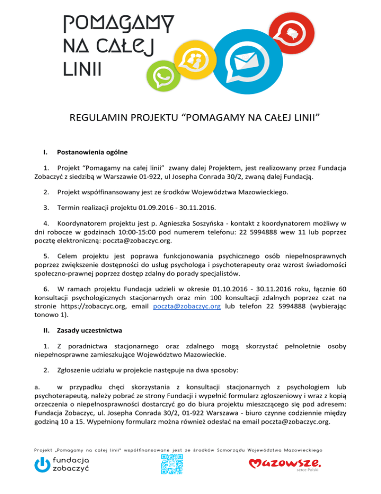 REGULAMIN PROJEKTU “POMAGAMY NA CAŁEJ LINII” I. Postanowienia ogólne 1. Projekt “Pomagamy na całej linii” zwany dalej Projektem, jest realizowany przez Fundacja Zobaczyć z siedzibą w Warszawie 01-922, ul Josepha Conrada 30/2, zwaną dalej Fundacją. 2. Projekt współfinansowany jest ze środków Województwa Mazowieckiego. 3. Termin realizacji projektu 01.09.2016 - 30.11.2016. 4. Koordynatorem projektu jest p. Agnieszka Soszyńska - kontakt z koordynatorem możliwy w dni robocze w godzinach 10:00-15:00 pod numerem telefonu: 22 5994888 wew 11 lub poprzez pocztę elektroniczną: [email protected]. 5. Celem projektu jest poprawa funkcjonowania psychicznego osób niepełnosprawnych poprzez zwiększenie dostępności do usług psychologa i psychoterapeuty oraz wzrost świadomości społeczno-prawnej poprzez dostęp zdalny do porady specjalistów. 6. W ramach projektu Fundacja udzieli w okresie 01.10.2016 - 30.11.2016 roku, łącznie 60 konsultacji psychologicznych stacjonarnych oraz min 100 konsultacji zdalnych poprzez czat na stronie https://zobaczyc.org, email [email protected] lub telefon 22 5994888 (wybierając tonowo 1). II. Zasady uczestnictwa 1. Z poradnictwa stacjonarnego oraz zdalnego mogą skorzystać pełnoletnie osoby niepełnosprawne zamieszkujące Województwo Mazowieckie. 2. Zgłoszenie udziału w projekcie następuje na dwa sposoby: a. w przypadku chęci skorzystania z konsultacji stacjonarnych z psychologiem lub psychoterapeutą, należy pobrać ze strony Fundacji i wypełnić formularz zgłoszeniowy i wraz z kopią orzeczenia o niepełnosprawności dostarczyć go do biura projektu mieszczącego się pod adresem: Fundacja Zobaczyc, ul. Josepha Conrada 30/2, 01-922 Warszawa - biuro czynne codziennie między godziną 10 a 15. Wypełniony formularz można również odesłać na email [email protected]. b. W przypadku chęci skorzystania z porady poprzez czat, email lub telefon, wystarczy w trakcie trwania konsultacji przedstawić się z imienia i nazwiska oraz złożyć odpowiednio słowne lub pisemne oświadczenie o zamieszkiwaniu Województwa Mazowieckiego oraz posiadaniu orzeczenia o stopniu niepełnosprawności. 2. W przypadku opiekunów pełnoletnich osób niepełnosprawnych, możliwe jest uzyskanie wsparcia poprzez email, telefon, czat. Wsparcie te powinno dotyczyć problemów niepełnosprawnego członka rodziny. 3. Zgłoszenie udziału jest jednoznaczne z wyrażeniem zgody na przetwarzanie swoich danych osobowych przez Fundację Zobaczyć w celu realizacji projektu, jak i po jego zakończeniu w celach statystycznych. 4. Liczba osób korzystających z konsultacji stacjonarnych jest ograniczona do 15. W przypadku większej liczby chętnych, zostanie utworzona lista rezerwowa. 5. Liczba osób korzystających z konsultacji zdalnych jest nieograniczona. W okresie realizacji projektu, każda osoba spełniająca kryterium uczestnictwa, zostanie zakwalifikowana do projektu i zostanie udzielone jej wsparcie. 6. W przypadku osób zakwalifikowanych do udziału w konsultacjach stacjonarnych, ustalenie terminów spotkań będzie odbywało się poprzez kontakt mailowy lub telefoniczny pod numerem telefonu 22 599 4888. III. Prawa i obowiązki uczestników: 1. Uczestnik ma prawo do: a. świadczenia na swoją rzecz bezpłatnych usług zgodnie z postanowieniem regulaminu Projektu, b. rezygnacji z udziału w projekcie w trakcie jego trwania, c. wglądu do swoich danych oraz ich poprawiania. d. żądania uzupełnienia, uaktualnienia, sprostowania danych osobowych, czasowego lub stałego wstrzymania ich przetwarzania lub ich usunięcia. 2. Uczestnik zobowiązuje się do nieprzesyłania informacji o charakterze bezprawnym, obraźliwym i niezgodnym z rzeczywistością oraz mogących powodować uszkodzenie serwisu Internetowego Fundacji, oprogramowania oraz urządzeń technicznych z nim związanych. 3. Uczestnik zobowiązuje się do nieujawniania w jakikolwiek sposób informacji uzyskanych w ramach konsultacji bez uzyskania zgody Usługodawcy w formie pisemnej. 4. Uczestnik zobowiązuje się do udziału w badaniach satysfakcji oraz ewaluacyjnych. Badania mają charakter anonimowy i służyć mają polepszeniu świadczonych usług oraz sprawozdawczych z realizacji projektu. IV. Prawa i obowiązki Fundacji 1. Zobowiązuje się świadczyć na rzecz uczestników usługi zgodnie z jej treścią i postanowieniami regulaminu. 2. Zobowiązuje się zachować w tajemnicy informacje związane z Uczestnikiem, chyba że przepisy prawa stanowią inaczej. Obowiązek zachowania tajemnicy nie jest ograniczony w czasie. 3. Nie ponosi odpowiedzialności za decyzje podjęte przez uczestnika w trakcie lub następstwie świadczonych konsultacji. 4. Ma prawo do zaprzestania świadczenia usług i usług psychologicznych w przypadku przekazywania przez Klienta treści o charakterze bezprawnym lub obraźliwym. 5. Ma prawo do zawieszenia funkcjonowania strony internetowej w przypadku bieżącej obsługi i konserwacji serwisu, oprogramowania i urządzeń technicznych z nim związanych. V. Postanowienia końcowe 1. Regulamin obowiązuje od dnia 22.09.2016 roku. 1. Fundacja zastrzega sobie prawo zmiany postanowień niniejszego Regulaminu. 2. Zmiany będą obowiązywały po 14 dniach od momentu ich umieszczenia w serwisie Internetowym. 3. W sprawach nieuregulowanych postanowieniami regulaminem mają zastosowanie w szczególności przepisy: a. ustawy z dnia 18 lipca 2002 r., o świadczeniu usług drogą elektroniczną (Dz.U.2002.144.1204 z zm.), b. ustawy z dnia 23 kwietnia 1964 r., Kodeks cywilny (Dz.U.1964.16.93 z zm.).