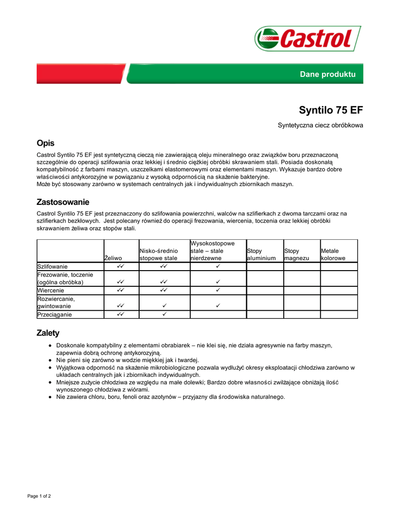 Dane produktu Syntilo 75 EF Syntetyczna ciecz obróbkowa Opis Castrol Syntilo 75 EF jest syntetyczną cieczą nie zawierającą oleju mineralnego oraz związków boru przeznaczoną szczególnie do operacji szlifowania oraz lekkiej i średnio ciężkiej obróbki skrawaniem stali. Posiada doskonałą kompatybilność z farbami maszyn, uszczelkami elastomerowymi oraz elementami maszyn. Wykazuje bardzo dobre właściwości antykorozyjne w powiązaniu z wysoką odpornością na skażenie bakteryjne. Może być stosowany zarówno w systemach centralnych jak i indywidualnych zbiornikach maszyn. Zastosowanie Castrol Syntilo 75 EF jest przeznaczony do szlifowania powierzchni, walców na szlifierkach z dwoma tarczami oraz na szlifierkach bezkłowych. Jest polecany również do operacji frezowania, wiercenia, toczenia oraz lekkiej obróbki skrawaniem żeliwa oraz stopów stali. Szlifowanie Frezowanie, toczenie (ogólna obróbka) Wiercenie Rozwiercanie, gwintowanie Przeciąganie Żeliwo ¸¸ Nisko-średnio stopowe stale ¸¸ Wysokostopowe stale – stale nierdzewne ¸ ¸¸ ¸¸ ¸¸ ¸¸ ¸ ¸ ¸¸ ¸¸ ¸ ¸ ¸ Stopy aluminium Stopy magnezu Metale kolorowe Zalety Doskonale kompatybilny z elementami obrabiarek – nie klei się, nie działa agresywnie na farby maszyn, zapewnia dobrą ochronę antykorozyjną. Nie pieni się zarówno w wodzie miękkiej jak i twardej. Wyjątkowa odporność na skażenie mikrobiologiczne pozwala wydłużyć okresy eksploatacji chłodziwa zarówno w układach centralnych jak i zbiornikach indywidualnych. Mniejsze zużycie chłodziwa ze względu na małe dolewki; Bardzo dobre własności zwilżające obniżają ilość wynoszonego chłodziwa z wiórami. Nie zawiera chloru, boru, fenoli oraz azotynów – przyjazny dla środowiska naturalnego. Page 1 of 2 Dane Techniczne Nazwa Metoda Jednostka Wartość Wygląd wzrokowa - przeźroczysty, żółty Gęstość przy 15 ºC DIN 51757 kg/m³ 996 Zawartość oleju mineralnego szacunkowo % 0 Wygląd wzrokowo - przeźroczysty pH (5%) DIN 51361 - 9.5 – 10.5 - 2.0 Koncentrat: Roztwór: Faktor dla refraktometru Powyższe dane są typowymi wartościami uzyskiwanymi przy normalnych tolerancjach produkcyjnych i nie stanowią specyfikacji technicznych. Zalecane stężenie robocze Szlifowanie 3-5% Ogólna obróbka 4-10% Twardość wody 20 - 600 ppm CaCO3 Składowanie Aby zachować pełne właściwości produktu, kontener/pojemnik powinien być zawsze szczelnie zamknięty. Nie dopuszczać do przedostawania się wody, chronić przed przemrożeniem. Przechowywać w suchym i chłodnym pomieszczeniu w temperaturze: 5 – 40 °C, bez narażania na bezpośrednie działanie promieni słonecznych. Zalecane jest przechowywanie produktu, zawsze w szczelnie zamkniętych opakowaniach. W celu uzyskania bardziej szczegółowych informacji, prosimy o zapoznanie się z kartą bezpieczeństwa produktu. Syntilo 75 EF 02 Aug 2013 Castrol, the Castrol logo and related marks are trademarks of Castrol Limited, used under licence. Prawne wylaczenie Karta produktu i informacje w niej zawarte sa aktualne w momencie jej tworzenie i wydruku. Jednakze , nie dajemy gwarancji ze prezentowane wyrazenia lub zasugerowane zwroty , sa dokladne, precyzyjne i kompletne. Dane zawarte sa oparte na testach wykonanych w warunkach laboratoryjnych i nalezy je traktowac jako wskazówke i ogólna informacje. Uzytkownikom radzimy upewnic sie ze korzystaja z najnowszej wersji karty danych. Uzytkownicy sa odpowiedzialni za bezpieczne uzycie produktu , zgodnie z zastosowaniem i odpowiednim doborem , stosujac sie do wszystkich odpowiednich regulacji i wymagan prawnych. Karta bezpieczenstwa produktu SDS jest dostepna dla wszystkich produktów i powinna byc wykorzystana dla odpowiedniego skladowania, bezpiecznego zastosowania, oraz usuwania , utylizacji produktu. BP , jej filie oraz podmioty wspólpracujace nie ponosza odpowiedzialnosci za jakiekolwiek szkody , zniszczenia i urazy bedace rezultatem nieodpowiedniego uzycia produktu , za jakiekolwiek awarie powstale w wyniku zastosowania niezgodnie z rekomendacja produktu oraz za zagrozenia wlasciwe dla natury i srodowiska . Wszystkie produkty , serwis , obsluga i informacje sa dostarczane zgodnie z standardowymi warunkami sprzedazy. Jesli wymagane sa dodatkowe informacje nalezy sie skontaktowac z lokalnym przedstawicielem sprzedazy. BP Europa SE Oddzial w Polsce, ul. Jasnogórska 1,, 31-358 Kraków, Biuro Handlowe: ul. Chlodna 51 00-867 Warszawa Tel: 0048 22 582 65 00 Fax: 0048 22 582 65 13 www.castrol.pl Page 2 of 2