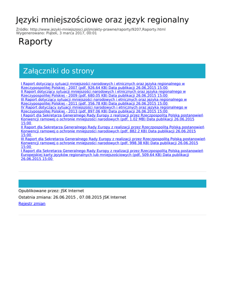 Języki mniejszościowe oraz język regionalny Źródło: http://www.jezyki-mniejszosci.pl/jm/akty-prawne/raporty/9207,Raporty.html Wygenerowano: Piątek, 3 marca 2017, 00:01 Raporty Załączniki do strony I Raport dotyczący sytuacji mniejszości narodowych i etnicznych oraz języka regionalnego w Rzeczypospolitej Polskiej - 2007 (pdf, 926.64 KB) Data publikacji 26.06.2015 15:00 II Raport dotyczący sytuacji mniejszości narodowych i etnicznych oraz języka regionalnego w Rzeczypospolitej Polskiej - 2009 (pdf, 680.05 KB) Data publikacji 26.06.2015 15:00 III Raport dotyczący sytuacji mniejszości narodowych i etnicznych oraz języka regionalnego w Rzeczypospolitej Polskiej - 2011 (pdf, 356.78 KB) Data publikacji 26.06.2015 15:00 IV Raport dotyczący sytuacji mniejszości narodowych i etnicznych oraz języka regionalnego w Rzeczypospolitej Polskiej - 2013 (pdf, 897.06 KB) Data publikacji 26.06.2015 15:00 I Raport dla Sekretarza Generalnego Rady Europy z realizacji przez Rzeczpospolitą Polską postanowień Konwencji ramowej o ochronie mniejszości narodowych (pdf, 1.02 MB) Data publikacji 26.06.2015 15:00 II Raport dla Sekretarza Generalnego Rady Europy z realizacji przez Rzeczpospolitą Polską postanowień Konwencji ramowej o ochronie mniejszości narodowych (pdf, 882.2 KB) Data publikacji 26.06.2015 15:00 III Raport dla Sekretarza Generalnego Rady Europy z realizacji przez Rzeczpospolitą Polską postanowień Konwencji ramowej o ochronie mniejszości narodowych (pdf, 998.38 KB) Data publikacji 26.06.2015 15:00 I Raport dla Sekretarza Generalnego Rady Europy z realizacji przez Rzeczpospolitą Polską postanowień Europejskiej karty języków regionalnych lub mniejszościowych (pdf, 509.64 KB) Data publikacji 26.06.2015 15:00 Opublikowane przez: JSK Internet Ostatnia zmiana: 26.06.2015 , 07.08.2015 JSK Internet Rejestr zmian