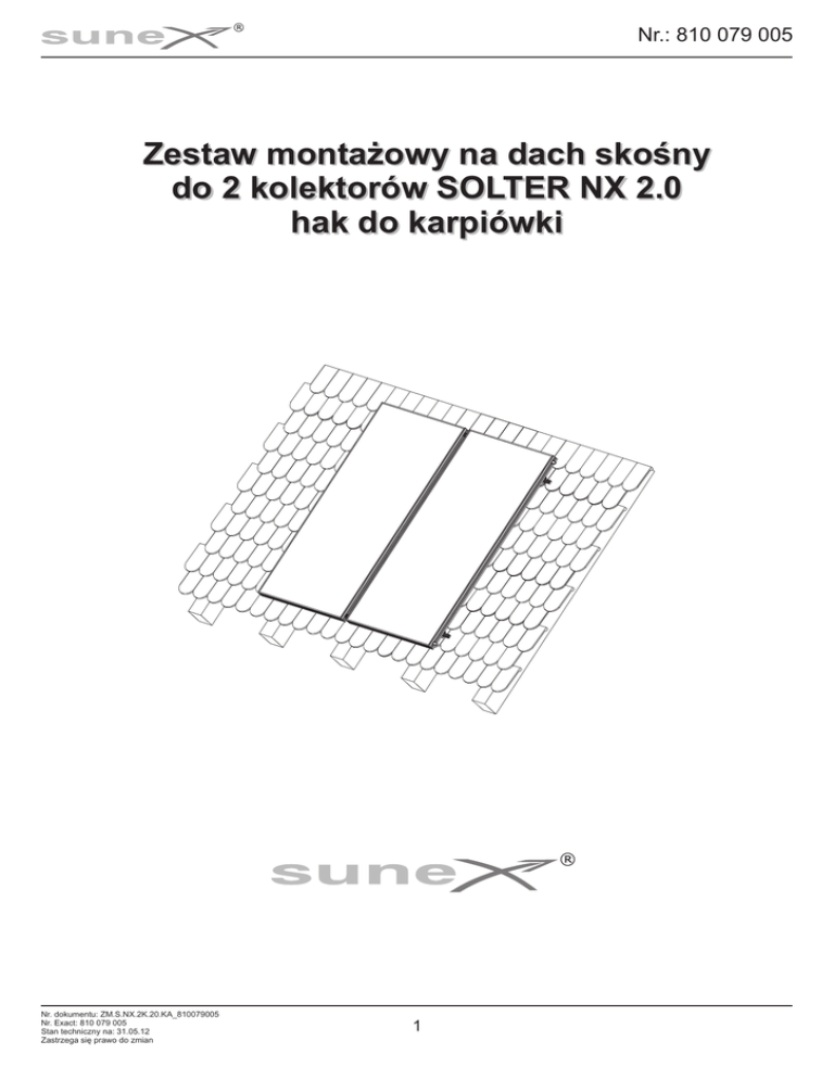 ® Nr.: 810 079 005 Zestaw montażowy na dach skośny do 2 kolektorów SOLTER NX 2.0 hak do karpiówki ® Nr. dokumentu: ZM.S.NX.2K.20.KA_810079005 Nr. Exact: 810 079 005 Stan techniczny na: 31.05.12 Zastrzega się prawo do zmian 1 ® 50 Nr.: 810 079 005 240 8 2 60 15 00 ÷1 80 0 A Hak do karpiówki 1 2 ≈40 0 ≈14 60 226 0 ≈40 0 Wykaz elementów Poz. Opis Ilość 1 Hak (karpiówka) 4 szt. 2 Belka pozioma aluminiowa L=2260 mm 2 szt. 3 Wieszak kolektora dół 4 szt. 4 4 szt. 7 Wieszak kolektora góra Śruba młoteczkowa nierdzewna M8x20 + podkładka płaska + podkładka sprężysta + nakrętka Śruba zamkowa nierdzewna M10x30 + podkładka płaska + podkładka sprężysta + nakrętka Wkręt ocynkowany 6x80 16 szt. 8 Trzpień łączący* 2 szt. 5 6 * trzpień łączący ma zastosowanie przy wykorzystaniu zestawu Nr. dokumentu: ZM.S.NX.2K.20.KA_810079005 Nr. Exact: 810 079 005 Stan techniczny na: 31.05.12 Zastrzega się prawo do zmian 2 jako rozszerzenie (patrz str. 6) 8 kpl. 4 kpl. ® Nr.: 810 079 005 1. Przygotowanie dachu do montażu zestawu. Usunąć dachówki w wyznaczonych miejscach. 00 ÷1 80 0 7 15 1 ≈14 60 Zamontować haki i uzupełnić dachówki. Nr. dokumentu: ZM.S.NX.2K.20.KA_810079005 Nr. Exact: 810 079 005 Stan techniczny na: 31.05.12 Zastrzega się prawo do zmian 3 ® 2. Montaż belek poziomych Nr.: 810 079 005 2 do haków. 6 4 . max 50 3. Montaż wieszaków kolektora 3 Nakrętka M8 Podkładka sprężysta Podkładka płaska Wieszak kolektora góra Śruba młoteczkowa nierdzewna M8x20 A + 50 Zamocować wieszak górny używając śrub młoteczkowych M8x20 i lekko dokręcić. Śruba młoteczkowa nierdzewna M8x20 Wieszak kolektora dół Podkładka płaska Podkładka sprężysta Nakrętka M8 ! Uwaga: Podczas montażu wieszaków, kolektora nie można opierać na szybie! Zamocować wieszak dolny używając śrub młoteczkowych M8x20 i mocno dokręcić. Nr. dokumentu: ZM.S.NX.2K.20.KA_810079005 Nr. Exact: 810 079 005 Stan techniczny na: 31.05.12 Zastrzega się prawo do zmian 4 ® Nr.: 810 079 005 4. Montaż kolektora na belkach poziomych 2 . 7 4 5 1 6 2 Poz. Opis 1 Hak (karpiówka) 2 Belka pozioma aluminiowa 3 Wieszak kolektora dół 4 Wieszak kolektora góra Śruba młoteczkowa nierdzewna M8x20 +podkładka płaska + podkładka sprężysta + nakrętka Śruba zamkowa nierdzewna M10x30 + podkładka płaska + podkładka sprężysta + nakrętka Wkręt ocynkowany 6x80 5 7 3 5 2 1 6 6 7 Nr. dokumentu: ZM.S.NX.2K.20.KA_810079005 Nr. Exact: 810 079 005 Stan techniczny na: 31.05.12 Zastrzega się prawo do zmian 5 ® Nr.: 810 079 005 5. Montaż zestawu rozszerzającego. 2 2 8 Wsunąć trzpień łączący 8 w belki poziome 2 zestawów montażowych. 8 8 ≈80 0 Nr. dokumentu: ZM.S.NX.2K.20.KA_810079005 Nr. Exact: 810 079 005 Stan techniczny na: 31.05.12 Zastrzega się prawo do zmian 6
