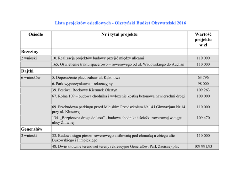 Lista projektów osiedlowych - Olsztyński Budżet Obywatelski 2016 Osiedle Nr i tytuł projektu Wartość projektu w zł Brzeziny 2 wnioski 10. Realizacja projektów budowy przejść między ulicami 110 000 165. Oświetlenie traktu spacerowo – rowerowego od ul. Wadowskiego do Auchan 110 000 5. Doposażenie placu zabaw ul. Kąkolowa 63 796 6. Park wypoczynkowo – rekreacyjny 98 000 39. Festiwal Rockowy Kierunek Olsztyn 109 263 67. Rolna 109 – budowa chodnika i wyłożenie kostką betonową nawierzchni drogi 100 000 69. Przebudowa parkingu przed Miejskim Przedszkolem Nr 14 i Gimnazjum Nr 14 przy ul. Kłosowej 110 000 134. „Bezpieczna droga do lasu” - budowa chodnika i ścieżki rowerowej w ciągu ulicy Żniwnej 109 470 33. Budowa ciągu pieszo-rowerowego z siłownią pod chmurką u zbiegu ulic Bukowskiego i Pimpickiego 110 000 Dajtki 6 wniosków Generałów 3 wnioski 48. Dwie siłownie terenowe( tereny rekreacyjne Generałów, Park Zacisze) plac 109 991,93 zabaw, boiska do piłki na Zaciszu 60. Remont chodników – wykonanie nowej nawierzchni z kostki betonowej przy ul. Berlinga 4,6,8,10; Kleeberga 2,4,6; Kleeberga 1,3,5,11,13 110 000 3. Rewitalizacja rozpadającego się ogrodzenia wokół budynku przy ul. Kromera 1 – sąsiadującego z parkiem Podzamcze (własność UM w Olsztynie) 110 000 59. Dokończenie projektu osiedlowego z budżetu obywatelskiego z 2015r. Remont ulicy Zyndrama z Maszkowic 110 000 65. Remont nawierzchni chodnika (wymiana) ul. Smętka 28 i 28A 42 400 84. Rozbudowa toru rowerowego – Pumptrack Grunwaldzkie 90 500 103. Naprawa drogi dojazdowej do budynku zabytkowego i garaży przy ul. Jagiellończyka 8c z drogi ul. Warszawska Stara 6 000 151. Organizacja zajęć szachowych dla dzieci, młodzieży i dorosłych 9 700 168. Ławki – patroni naszych ulic os. Grunwaldzkie 9 800 Grunwaldzkie 8 wniosków 169. Naprawa chodników ul. Kromera, długość 280 m 110 000 7. Siłownia pod chmurką dla małych i dużych – małe centrum rekreacji 50 000 34. Remont placu apelowego wraz z podjazdem dla osób niepełnosprawnych i 150 miejscami parkingowymi dla rowerów przy Zespole Szkolno – Przedszkolnym nr 1 w Olsztynie 110 000 Gutkowo 4 wnioski 50. Doposażenie i uatrakcyjnienie oferty Biblioteki Publicznej Filia Nr 16 ul. Bałtycka 145 w Olsztynie-Gutkowie 8 600 143. Utwardzenie i poszerzenie ulicy Czapli w Olsztynie 110 000 79. Monitoring oczka wodnego przy ulicy Wilczyńskiego 30 000 80. Wykonanie zespołu urządzeń siłowni zewnętrznej przy ul. Kanta 42-54 50 000 81. Połączenie jezdni ul. Bajkowej z wykonaniem parkingów 100 000 107. Przebudowa ulic Leyka i Hanowskiego wraz z wykonaniem zatok postojowych i przełożeniem chodników 110 000 148. Poprawa bezpieczeństwa dzieci- budowa i remont chodnika przy Przedszkolu Miejskim nr 15 72 100 62. Wykonanie nowego chodnika łączącego posesję budynków przy ul. Kopernika 35A i 35B z ul. Kopernika 37 200 73. zagospodarowanie podwórka – III etap, między ulicami Kościuszki, Kętrzyńskiego, Kopernika, Pułaskiego 110 000 86. Utwardzenie drogi dojazdowej podwórka kostką brukową oraz doprowadzenie wody z terenu między blokami 25, 27, 29, 25A, 29B od strony podwórka 110 000 154. Remont podwórka przy ul. Kętrzyńskiego/Kościuszki polegający na budowie miejsc parkingowych mini boiska, remontu placu zabaw 110 000 157. Utwardzenie podłoża i położenie kostki brukowej wraz z odwodnieniem i nasadzeniami zieleni 110 000 4. Boiska do gry w siatkówkę plażową/ badmintona/ boule 62 000 Jaroty 5 wniosków Kętrzyńskiego 5 wniosków Kormoran 7 wniosków 42. Wymiana nawierzchni chodnika z płytek chodnikowych na chodnik z kostki brukowej, między budynkami przy ul. Wyszyńskiego 10, a budynkiem przy ul. Wyszyńskiego 12. 45 000 43. Remont schodów terenowych przed budynkiem Żołnierska 47 45 000 44. Poszerzenie chodnika na ciągu ulicy Żołnierskiej do szczytu budynku Żołnierska/Wyszyńskiego 20 17 000 45. Projekt i budowa parkingu dla rodziców przywożących dzieci do SP 22 w Olsztynie przy ul Żołnierskiej 22. 110 000 55. Plac do Street Workout (ćwiczeń kalistenika) 100 000 57. Ładowarka solarna 56 000 74. Wymiana jezdni oraz chodnika przy ul. Promienistej w Olsztynie- etap II 110 000 149. Wymiana uszkodzonego chodnika przy ulicy Słonecznej 90 000 40. Ścianka wspinaczkowa zewnętrzna na pływalni przy ul. Głowackiego 27 110 000 101. Remont nawierzchni drogi wewnętrznej przy ul. Kościuszki 58-62A 106 000 111. Remont nawierzchni chodnika przy ul. Romualda Mielczarskiego i Placu Lotników 80 000 129. Międzyosiedlowa alejka do lasu 50 000 137. Uzupełnienie zbiorów książkowych i multimedialnych oraz wzbogacenie wyposażenia olsztyńskiej biblioteki Planety 11 48 000 146. Kultura mówiona – audiobooki 5 000 Kortowo 2 wnioski Kościuszki 6 wniosków Likusy 5 wniosków 138. wykonanie chodników n ul. Kasztanowej i grabowej (od Limbowej do Kasztanowej) 110 000 139. Utwardzenie z polbruku przejścia pomiędzy Wędkarską a Jagodową i Jagodową - Rakową 110 000 141. Siłownia zewnętrzna na plaży osiedlowej oraz doposażenie plaży miejscowej 110 000 142. Pawilon fitness- siłownia zewnętrzna, boisko na placu zabaw (do piłki siatkowej, plażowej) przy ul. Bałtyckiej 110 000 150. Siłownia zewnętrzna 12 588,05 Mazurskie 3 wnioski 58. Plac zabaw dla dzieci oraz siłownia pod chmurką dla dorosłych i dzieci, wymiana ogrodzenia 110 000 88. Poprawa wizerunku ul. Białostockiej poprzez wymianę nawierzchni chodnika – etap II, III, IV (kontynuacja zadania z II edycji OBO) 110 000 152. Wykonanie nowej nawierzchni chodnika ul. Augustowska 60 000 12. Psi wybieg na ul. Schumanna 61 120 75. Renowacja i rozbudowa urządzeń siłowni na wolnym powietrzu w okolicy cypla w zatoce nad Jeziorem Długim 45 000 92. Siłownia na wolnym powietrzu/strefa rozruchowa nad jeziorem Długim usytuowana w pobliżu placu zabaw 50 000 Nad Jeziorem Długim 7 wniosków 126. Oświetlenie schodów zejściowych do Jeziora Dł