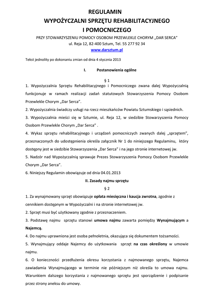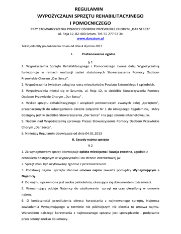 REGULAMIN WYPOŻYCZALNI SPRZĘTU REHABILITACYJNEGO I POMOCNICZEGO PRZY STOWARZYSZENIU POMOCY OSOBOM PRZEWLEKLE CHORYM „DAR SERCA” ul. Reja 12, 82-400 Sztum, Tel. 55 277 92 34 www.darsztum.pl Tekst jednolity po dokonaniu zmian od dnia 4 stycznia 2013 I. Postanowienia ogólne §1 1. Wypożyczalnia Sprzętu Rehabilitacyjnego i Pomocniczego zwana dalej Wypożyczalnią funkcjonuje w ramach realizacji zadao statutowych Stowarzyszenia Pomocy Osobom Przewlekle Chorym „Dar Serca”. 2. Wypożyczalnia świadczy usługi na rzecz mieszkaoców Powiatu Sztumskiego i sąsiednich. 3. Wypożyczalnia mieści się w Sztumie, ul. Reja 12, w siedzibie Stowarzyszenia Pomocy Osobom Przewlekle Chorym „Dar Serca” . 4. Wykaz sprzętu rehabilitacyjnego i urządzeo pomocniczych zwanych dalej „sprzętem”, przeznaczonych do udostępnienia określa załącznik Nr 1 do niniejszego Regulaminu, który dostępny jest w siedzibie Stowarzyszenia „Dar Serca” i na jego stronie internetowej jw. 5. Nadzór nad Wypożyczalnią sprawuje Prezes Stowarzyszenia Pomocy Osobom Przewlekle Chorym „Dar Serca”. 6. Niniejszy Regulamin obowiązuje od dnia 04.01.2013 II. Zasady najmu sprzętu §2 1. Za wynajmowany sprzęt obowiązuje opłata miesięczna i kaucja zwrotna, zgodnie z cennikiem dostępnym w Wypożyczalni i na stronie internetowej jw. 2. Sprzęt musi byd użytkowany zgodnie z przeznaczeniem. 3. Podstawę najmu sprzętu stanowi umowa najmu zawarta pomiędzy Wynajmującym a Najemcą. 4. Do najmu uprawniona jest osoba pełnoletnia, okazująca się dokumentem tożsamości. 5. Wynajmujący oddaje Najemcy do użytkowania sprzęt na czas określony w umowie najmu. 6. O konieczności przedłużenia okresu korzystania z najmowanego sprzętu, Najemca zawiadamia Wynajmującego w terminie nie późniejszym niż określa to umowa najmu. Warunkiem dalszego korzystania z najmowanego sprzętu jest sporządzenie i podpisanie przez strony aneksu do umowy. 7. W przypadku najmu sprzętu o wartości przekraczającej 2 000 PLN, na zabezpieczenie ewentualnych szkód Wynajmującego, Najemca składa podpisany weksel In blanco wraz z deklaracją wekslową, które zostają zwrócone Najemcy po zakooczeniu umowy i zwrocie sprzętu z podpisaniem przez obie strony protokołu zdawczo-odbiorczego. 8. Wynajmujący zobowiązany jest do przeszkolenia Najemcy w zakresie montażu, demontażu i prawidłowej obsługi sprzętu. Szkolenie odbywa się w siedzibie Stowarzyszenia w dniu odbioru sprzętu przez Najmującego. Najmujący potwierdza pisemnie odbycie przeszkolenia. 9. Transport najmowanego sprzętu Najmujący zapewnia we własnym zakresie. 10. Opłaty za wypożyczony sprzęt: 1) Termin wpłaty kaucji zwrotnej oraz czynszu najmu następuje w dniu podpisania umowy lub w dniu odbioru sprzętu przez Najemcę, w Kasie Wypożyczalni. 2) Miesięczne opłaty należy regulowad nie później niż w odstępach 30-to dniowych, na rachunek bankowy BS SZTUM 43 8309 0000 0001 5903 2000 0020 lub w Kasie Wypożyczalni. 3) Przekroczenie wskazanego terminu płatności za wynajęty sprzęt o 14 dni, upoważnia Wynajmującego do naliczenia odsetek ustawowych od nieterminowych opłat. 4) Na wniosek Najemcy, Wynajmujący wystawia Rachunek. 5) W przypadku zwrotu sprzętu w terminie wcześniejszym – do 7 dni kalendarzowych od daty podpisania umowy, Najemca otrzyma zwrot 50% uiszczonej miesięcznej opłaty. 11. Warunkiem zdania najmowanego sprzętu jest okazanie się dowodem uregulowania płatności oraz sporządzenie Protokołu Zdawczo-Odbiorczego. 12. Zwrot kaucji nastąpi po podpisaniu protokołu zdawczo-odbiorczego przez obie strony Umowy. 13. Przy zwrocie sprzętu Najmujący dostarcza sprzęt we własnym zakresie. 14. Termin wypożyczenia lub zwrotu łóżek rehabilitacyjnych winien byd wcześniej uzgodniony telefonicznie. 15. Pacjentom objętym opieką hospicyjną przez Stowarzyszenie pomocy Osobom przewlekle chorym „DAR SERCA” wypożyczanie sprzętu rehabilitacyjnego i pomocniczego jest nieodpłatne. Obowiązuje jedynie wpłata kaucji – zwrotnej po oddaniu sprzętu. Wypożyczenie odbywa się na podstawie UMOWY UZYCZENIA. III. Zasady odpowiedzialności Najemcy za sprzęt §3 1. Najemca ponosi materialną odpowiedzialnośd za użytkowany sprzęt. 2. Najemca jest zobowiązany do natychmiastowego informowania Wynajmującego o zaistniałym uszkodzeniu najmowanego sprzętu lub innych problemach wynikłych w trakcie jego użytkowania . 3. W przypadku szkody poniesionej przez Wynajmującego, za którą odpowiedzialnośd ponosi Najemca (np. uszkodzenie, zniszczenie, zagubienie sprzętu i inne), Najemca zobowiązany jest do zwrotu kosztów równoważnych stracie finansowej wyrządzonej szkody. Wysokośd straty określa Wynajmujący. Koszty te mogą byd pokryte z kaucji. IV. Zasady ewidencjonowania sprzętu i umów §4 1. Ewidencja sprzętu i umów prowadzona jest w systemie elektronicznym. 2. Wypożyczalnia dysponuje sprzętem zakupionym ze środków PFRON, środków własnych, oraz otrzymanym w darowiźnie. 1. Sprzęt otrzymany w formie darowizny jest ewidencjonowany na zasadach ogólnych, na podstawie Protokołu przyjęcia darowizny. 4. Wyceny darowizny dokonuje powołana Komisja. V. Postanowienia koocowe §5 1. Wynajmującemu przysługuje prawo sprawdzenia danych osobowych przedstawionych przez Najemcę oraz kontroli sposobu użytkowania sprzętu. 2. W przypadku stwierdzenia wykorzystywania najmowanego sprzętu niezgodnie z jego przeznaczeniem lub jego zniszczenia, Wynajmujący ma prawo odstąpid od umowy w trybie natychmiastowym i obciążyd Najemcę kosztami ewentualnej naprawy, a Najemca zobowiązany jest do niezwłocznego zwrotu sprzętu. 3. Nie respektowanie przez Najemcę niniejszego Regulaminu stanowi podstawę do natychmiastowego rozwiązania umowy najmu i do odebrania wypożyczonego sprzętu. 4.Wynajmujący ma prawo, na zasadach określonych w ustawie z dnia 29 sierpnia 1997 r. o ochronie danych osobowych (Dz.U.2002.101.926 z późn. zm.), gromadzid