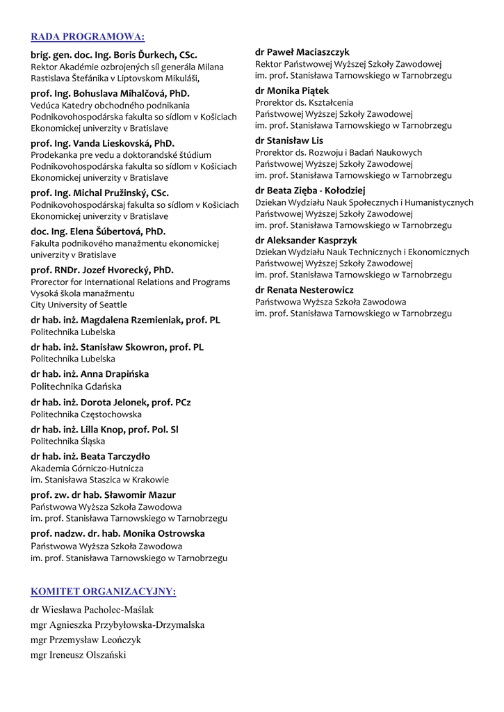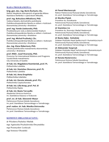 RADA PROGRAMOWA: brig. gen. doc. Ing. Boris Ďurkech, CSc. dr Paweł Maciaszczyk Rektor Akadémie ozbrojených síl generála Milana Rastislava Štefánika v Liptovskom Mikuláši, Rektor Państwowej Wyższej Szkoły Zawodowej im. prof. Stanisława Tarnowskiego w Tarnobrzegu prof. Ing. Bohuslava Mihalčová, PhD. dr Monika Piątek Vedúca Katedry obchodného podnikania Podnikovohospodárska fakulta so sídlom v Košiciach Ekonomickej univerzity v Bratislave Prorektor ds. Kształcenia Państwowej Wyższej Szkoły Zawodowej im. prof. Stanisława Tarnowskiego w Tarnobrzegu prof. Ing. Vanda Lieskovská, PhD. dr Stanisław Lis Prodekanka pre vedu a doktorandské štúdium Podnikovohospodárska fakulta so sídlom v Košiciach Ekonomickej univerzity v Bratislave Prorektor ds. Rozwoju i Badań Naukowych Państwowej Wyższej Szkoły Zawodowej im. prof. Stanisława Tarnowskiego w Tarnobrzegu prof. Ing. Michal Pružinský, CSc. dr Beata Zięba - Kołodziej Podnikovohospodárskaj fakulta so sídlom v Košiciach Ekonomickej univerzity v Bratislave doc. Ing. Elena Šúbertová, PhD. Fakulta podnikového manažmentu ekonomickej univerzity v Bratislave prof. RNDr. Jozef Hvorecký, PhD. Prorector for International Relations and Programs Vysoká škola manažmentu City University of Seattle dr hab. inż. Magdalena Rzemieniak, prof. PL Politechnika Lubelska dr hab. inż. Stanisław Skowron, prof. PL Politechnika Lubelska dr hab. inż. Anna Drapińska Politechnika Gdańska dr hab. inż. Dorota Jelonek, prof. PCz Politechnika Częstochowska dr hab. inż. Lilla Knop, prof. Pol. Sl Politechnika Śląska dr hab. inż. Beata Tarczydło Akademia Górniczo-Hutnicza im. Stanisława Staszica w Krakowie prof. zw. dr hab. Sławomir Mazur Państwowa Wyższa Szkoła Zawodowa im. prof. Stanisława Tarnowskiego w Tarnobrzegu prof. nadzw. dr. hab. Monika Ostrowska Państwowa Wyższa Szkoła Zawodowa im. prof. Stanisława Tarnowskiego w Tarnobrzegu KOMITET ORGANIZACYJNY: dr Wiesława Pacholec-Maślak mgr Agnieszka Przybyłowska-Drzymalska mgr Przemysław Leończyk mgr Ireneusz Olszański Dziekan Wydziału Nauk Społecznych i Humanistycznych Państwowej Wyższej Szkoły Zawodowej im. prof. Stanisława Tarnowskiego w Tarnobrzegu dr Aleksander Kasprzyk Dziekan Wydziału Nauk Technicznych i Ekonomicznych Państwowej Wyższej Szkoły Zawodowej im. prof. Stanisława Tarnowskiego w Tarnobrzegu dr Renata Nesterowicz Państwowa Wyższa Szkoła Zawodowa im. prof. Stanisława Tarnowskiego w Tarnobrzegu