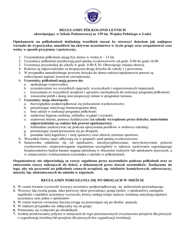 REGULAMIN PÓŁKOLONII LETNICH obowiązujący w Szkole Podstawowej nr 139 im. Wojska Polskiego w Łodzi Opiekunowie na półkoloniach dokładają wszelkich starań by stworzyć dzieciom jak najlepsze warunki do wypoczynku, umożliwić im aktywne uczestnictwo w życiu grupy oraz zorganizować czas wolny w sposób przyjemny i pożyteczny. 1. 2. 3. 4. 5. 6. 7. 8. 9. Uczestnikami półkolonii mogą być dzieci w wieku 6 – 13 lat. Uczestnicy półkolonii przebywają pod opieką wychowawców od godz. 8.00 do godz.16.00. Uczestnicy przychodzą do szkoły w godz. 8.00-8.30. Obowiązuje zmiana obuwia. Rodzice są odpowiedzialni za bezpieczna drogę dziecka do szkoły i z powrotem. W przypadku samodzielnego powrotu dziecka do domu rodzice/opiekunowie prawni są zobowiązani napisać stosowne oświadczenie. Uczestnicy półkolonii mają prawo do: a. spokojnego wypoczynku; b. uczestniczenia we wszystkich zajęciach, wycieczkach i organizowanych imprezach; c. korzystania ze wszystkich urządzeń i sprzętów niezbędnych do realizacji programu półkolonii; d. wnoszenia próśb i skarg oraz propozycji zmian w programie turnusu. Uczestnicy mają obowiązek: a. bezwzględnie podporządkować się poleceniom wychowawców; b. przestrzegać ramowego harmonogramu dnia; c. brać udział w realizacji programu półkolonii; d. zachować higienę osobistą, schludny wygląd i czystość; e. szanować mienie, pomoce dydaktyczne (za szkody wyrządzone przez dziecko, materialnie odpowiedzialni są rodzice lub prawni opiekunowie); f. kulturalnie zachowywać się podczas spożywania posiłków w stołówce szkolnej; g. przestrzegać zasad poruszania się po drogach; h. posiadać strój kąpielowy i strój sportowy oraz obuwie zmienne sportowe. Wszystkie formy zajęć odbywają się w grupach i pod opieką wychowawców. Samowolne oddalenie się od opiekunów, niezdyscyplinowanie, niewykonywanie poleceń wychowawców, nieprzestrzeganie regulaminu szczególnie w zakresie zachowania zagrażającego bezpieczeństwu będzie karane naganą udzieloną w obecności rodziców lub opiekunów prawnych, a w ostateczności wykluczeniem uczestnika z udziału w półkoloniach. Organizatorzy nie odpowiadają za rzeczy zagubione przez uczestników podczas półkolonii oraz za zniszczenia rzeczy należących do dzieci, a dokonanych przez innych uczestników. Zachęcamy do tego, aby nie przynosić na półkolonie cennych urządzeń, np. telefonów komórkowych, odtwarzaczy, muzyki, itp. niekoniecznych do udziału w zajęciach. REGULAMIN PORUSZANIA SIĘ PO DROGACH W MIEŚCIE 1. W czasie trwania wycieczki wszyscy uczestnicy podporządkowują się poleceniom prowadzącego. 2. Wszyscy idą zwartą grupą. Jako pierwszy idzie prowadzący grupę (jeden z opiekunów), następnie najmłodsi i najsłabsi uczestnicy wycieczki, którzy nadają tempo marszu, kolumnę zamykają najstarsi uczestnicy oraz jeden z opiekunów. 3. W czasie marszu zwracamy baczną uwagę na poruszające się po drodze pojazdy. 5. W żadnym przypadku nie odłączamy się od grupy. 6. Poruszamy się wyłącznie po chodnikach. 7. Jezdnię przekraczamy jedynie w miejscach do tego przeznaczonych (wyznaczone przejścia dla pieszych z sygnalizacją świetlną lub przejście dla pieszych bez sygnalizacji świetlnej). ZASADY BEZPIECZEŃSTWA W CZASIE KORZYSTANIA ZE ŚRODKÓW KOMUNIKACJI MIEJSKIEJ 1. 2. 3. 4. 5. 6. 7. 8. 9. Nie przechodź przed i za pojazdem. Przez jezdnię przechodź dopiero po odjeździe autobusu. Jeśli tramwaj ma wysepkę, należy do niej się dostać tylko przez przejście dla pieszych. Jeśli przystanek tramwajowy nie znajduje się na wysepce, to podejdź do niego przez jezdnię w wyznaczonym na jezdni miejscu. Nie wsiadaj, gdy pasażerowie chcą wysiąść z pojazdu. Nie potrącaj innych pasażerów. Przepuść osoby starsze i osoby z wózkiem. Na przystanku stój jak najdalej od krawężnika. Nie wskakuj do pojazdów, ani nie wyskakuj z niego. Nie wsiadaj do przepełnionego pojazdu. Zachowuj się kulturalnie w pojeździe (trzymaj się specjalnych uchwytów, ustępuj miejsca starszym, nie zachowuj się głośno, nie wnoś lodów, zdejmij plecak, nie wyrzucaj śmieci przez okno).