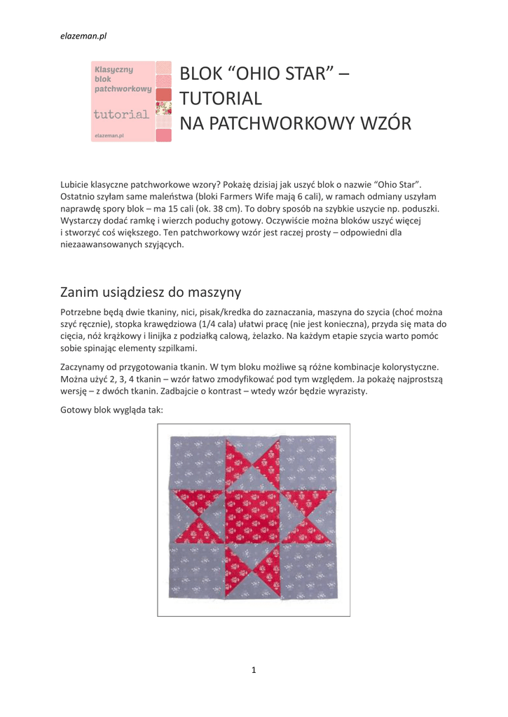 elazeman.pl BLOK “OHIO STAR” – TUTORIAL NA PATCHWORKOWY WZÓR Lubicie klasyczne patchworkowe wzory? Pokażę dzisiaj jak uszyć blok o nazwie “Ohio Star”. Ostatnio szyłam same maleństwa (bloki Farmers Wife mają 6 cali), w ramach odmiany uszyłam naprawdę spory blok – ma 15 cali (ok. 38 cm). To dobry sposób na szybkie uszycie np. poduszki. Wystarczy dodać ramkę i wierzch poduchy gotowy. Oczywiście można bloków uszyć więcej i stworzyć coś większego. Ten patchworkowy wzór jest raczej prosty – odpowiedni dla niezaawansowanych szyjących. Zanim usiądziesz do maszyny Potrzebne będą dwie tkaniny, nici, pisak/kredka do zaznaczania, maszyna do szycia (choć można szyć ręcznie), stopka krawędziowa (1/4 cala) ułatwi pracę (nie jest konieczna), przyda się mata do cięcia, nóż krążkowy i linijka z podziałką calową, żelazko. Na każdym etapie szycia warto pomóc sobie spinając elementy szpilkami. Zaczynamy od przygotowania tkanin. W tym bloku możliwe są różne kombinacje kolorystyczne. Można użyć 2, 3, 4 tkanin – wzór łatwo zmodyfikować pod tym względem. Ja pokażę najprostszą wersję – z dwóch tkanin. Zadbajcie o kontrast – wtedy wzór będzie wyrazisty. Gotowy blok wygląda tak: 1 elazeman.pl Jak widzicie to dziewięciołatka, czyli blok skonstruowany z dziewięciu kwadratów. Składa się z trzech rzędów w każdym po trzy kwadraty – u mnie o boku 5 cali (po wszyciu), co łącznie daje 15 cali (plus zapasy na szwy). Przygotowanie klepsydr Szycie zaczynamy od przygotowania czterech kwadratów – klepsydr. Aby uzyskać cztery kwadraty-klepsydry o boku 5 cali (po wszyciu) powinnam wyciąć 2 kwadraty czerwone i 2 szare w rozmiarze 6 i ¼ cala. Ponieważ sama sobie nie dowierzam z precyzyjnym cięciem (i słusznie) asekuracyjnie tnę kwadraty o boku 6 i ½ cala. Strata w materiale niewielka (po uszyciu trzeba odrobinę dociąć), a mam zapas w razie drobnych niedokładności w cięciu, czy szyciu. Oczywiście będziemy sprytnie szyć, ciąć, szyć i ciąć. Zaczniemy od złożenia ze sobą w dwie pary wyciętych kwadratów. Składamy prawymi stronami tkanin do środka, każda para to tkanina czerwona i szara. Teraz przyda się pisak znikający/kreda/coś do zaznaczania. 2 elazeman.pl Rysujemy trzy linie – przekątną i dwie równoległe do niej. Każda z nich w odległości ¼ cala, po obu stronach. Po tych równoległych liniach szyjemy. Środkowa pokazuje miejsce cięcia. Najpierw szyjemy potem tniemy. Efekt tych działań widać na zdjęciu powyżej. Uzyskałyśmy cztery kwadraty złożone z dwóch trójkątów (często używana nazwa – HST, czyli half square triangle). Lubicie jak elementy bloku schodzą się idealnie? Żeby uzyskać taki efekt w klepsydrze trzeba dobrze zaprasować szwy – zawsze na stronę jednej z tkanin (we wszystkich uzyskanych kwadratach). Zwykle wybiera się ciemniejszą tkaninę, żeby ciemna tkanina szwu nie prześwitywała przez jaśniejszą tkaninę. U mnie trudno było zdecydować, która jest ciemniejsza – wybrałam szarą i wszystkie cztery 3 elazeman.pl kwadraty HST zaprasowałam szwem na szarą stronę. Prasujemy ostrożnie – niezbyt gorącym żelazkiem (na dwie kropki wystarczy), raczej przykładamy żelazko, nie przesuwamy energicznie, bo łatwo kwadraty “zwichrować” (naciągnąć tkaninę). Kolejny etap wygląda podobnie do poprzedniego. Składamy kwadraty szarym do czerwonego. Środkowy szew w obu kwadratach powinien leżeć jeden na drugim. Precyzyjnie przykładamy do siebie kwadraty. Zobaczcie na zdjęciu jak układają się szwy. I znowu rysujemy trzy linie – przekątną i dwie równoległe do niej. Każda z nich w odległości ¼ cala, po obu stronach. Po tych równoległych liniach szyjemy. Środkowa pokazuje miejsce cięcia. Najpierw szyjemy potem tniemy. Teraz rozprasowujemy nasze klepsydry i wyrównujemy brzegi do rozmiaru 5 i ½ cala. Robimy to starannie i pilnujemy kątów 45 stopni (przekątne kwadratów). Ułożenie trójkątów musi być symetryczne, a punkt przecięcia linii szwów dokładnie po środku kwadratu. 4 elazeman.pl Teraz już z górki, bo najtrudniejsza część za nami Do całości bloku brakuje nam jeszcze pięciu kwadratów o boku 5 i ½ cala. Cztery wycięłam z tkaniny szarej, jeden z czerwonej. Układamy wszystkie dziewięć kwadratów: Edit: na fotce poniżej jest błąd, mam nadzieję, że widzicie jaki. Zszywanie zaczniemy od połączenia pasów poziomych ze sobą. Jeśli posiadasz stopkę krawędziową (krawędź ¼ cala) czas ją zamontować do maszyny. 5 elazeman.pl Dalszy etap ułatwi prawidłowe zaprasowanie szwów – proponuję na stronę “pełnych” kwadratów (nie klepsydr). Zwróćcie uwagę, że przy zszywaniu pasów na ich krawędzi wyraźnie widoczny jest zapas na szwy. Krawędzie wszytych klepsydr nie stykają się z brzegiem pasa, ale kończą się (prawidłowo) w odległości ¼ cala od brzegu. To będzie miejsce zszywania pasów. Na brzegach bloku również powinien być zapas na wszycie szerokości ¼ cala. Gotowy blok ma więc 15 i ½ cala, czyli zawiera zapas na wszycie. I jak Wam się podoba? 6 elazeman.pl Kilka uwag na zakończenie W założeniu to jest instrukcja dla początkujących. Mam nadzieję, że wszystko jest zrozumiałe. Jeśli nie – pytajcie śmiało w komentarzach lub na maila elazeman(małpka)o2.pl Chciałabym publikować co jakiś czas tego typu instrukcje, dlatego wszelkie uwagi są dla mnie ważne. Będzie mi również miło jeśli zechcecie dać mi znać jak Wam poszło szycie według tego tuto rialu. Ela Zeman 7