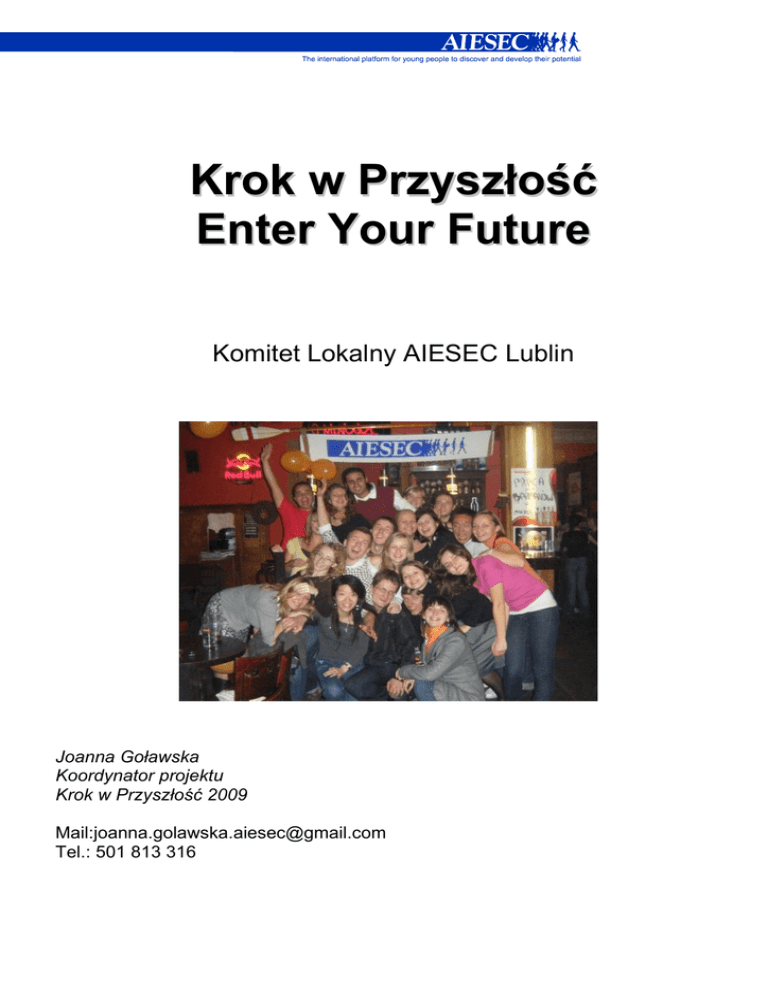 Krok w Przyszłość Enter Your Future Komitet Lokalny AIESEC Lublin Joanna Goławska Koordynator projektu Krok w Przyszłość 2009 Mail:[email protected] Tel.: 501 813 316 Idea i cele projektu Krok w Przyszłość jest projektem realizowanym przez Komitet Narodowy AIESEC Polska po raz pierwszy. Skierowany jest do uczniów szkół ponadgimnazjalnych, na terenie całego kraju. Ideą projektu jest szerzenie idei kreatywnej przedsiębiorczości oraz uczenie polskiej młodzieży tolerancji wobec innych kultur i religii świata. Chcemy, aby Krok w Przyszłość był impulsem dla licealistów, który zachęci ich do bycia pro-aktywnym, wychodzenia z własną inicjatywą. W młodych ludziach tkwi ogromny potencjał, który mogą wykorzystać jako młodzi „biznesmeni”, a z którego rzadko sobie zdają sprawę. Naszą misją jest pomoc młodym ludziom w odkrywaniu swojego potencjału i wzbudzenie w Kilka słów o AIESEC nich chęci jego realizacji. Dzięki przybliżeniu im w praktyczny i atrakcyjny AIESEC jest międzynarodową platformą dla młodych ludzi, którzy chcą odkrywać i rozwijać sposób zagadnienia przedsiębiorczości, chcielibyśmy pobudzić chęć działania. Równie ważnym celem projektu jest umożliwienie młodym ludziom swój potencjał, wpływając przy tym kontaktu z kulturami i religiami, które istnieją na całym świecie. pozytywnie W każdym zakątku naszego globu żyją ludzie o różnych tradycjach na społeczeństwo. Jesteśmy i sposobach bycia. Każda z tych osób ma inne spojrzenie na świat i żyje stowarzyszeniem według innych wartości. Polskie realia nie dostarczają wielu możliwości, aby o charakterze edukacyjnym, móc samemu doświadczyć, czym faktycznie są różnice kulturowe. niedochodowym To zrozumienie i poznanie nieznanego uczy tolerancji, a nie tylko mówienie i prowadzącym na skalę globalną unikatowy Program Międzynarodowej Wymiany Praktyk. Jesteśmy obecni na 800 uczelniach w ponad 100 krajach. status AIESEC posiada organizacji pożytku o niej. Dlatego też chcemy umożliwić uczniom szkół średnich obcowanie w prawdziwie międzynarodowym środowisku. Wspaniałą okazją do lepszego poznania będzie Global Village, w centrum Warszawy, która zapoczątkuje nowy cykl warsztatów, a oprócz tego przebywanie z praktykantami przez cały tydzień, mając możliwość goszczenia ich we własnych domach. Nic innego niż wspólna zabawa, rozmowy, wymiana poglądów publicznego. z praktykantami nie wpływa w takim stopniu na poszerzenie horyzontów, otwarcie się na świat oraz pogłębianie wiedzy młodzieży. Usłyszeć język togo, porozmawiać o kulturze dalekiego wschodu, przymierzyć afrykańskie stroje ludowe – tak Krok w Przyszłość pomaga przełamywać bariery kulturowe. Edycja Lubelska II. Szkolenia w liceach i. Zamierzamy przeprowadzić warsztaty rozwijające przedsiębiorczość w 18 liceach na terenie województwa lubelskiego, co daje nam możliwość dotarcia do grupy 1620 uczniów. ii. Szkolenia będą prowadzone przez trzyosobowe grupy praktykantów z różnych krajów i kontynentów. Każdy z nich zajmie się jedną 25-30 osobową grupą uczniów. iii. Projekt zostanie przeprowadzony na przestrzeni trzech miesięcy: Warsztaty będą odbywały się od 2 marca do 15 maja przez tydzień w każdej szkole. iv. Pierwsze trzy dni warsztatów są poświęcone tematyce przedsiębiorczości, postaw przedsiębiorczych, praw konsumenckich w Unii Europejskiej. Marzec-Maj 2009 v. W wiosennej edycji projektu udział weźmie 6 praktykantów, odwiedzając 18 szkół. Łącznie zamierzamy dotrzeć do około 1620 uczniów. Kolejne dwa dni są przeznaczone dla najbardziej aktywnych członków warsztatów, wybranych w dniach wcześniejszych. Ta grupa uczniów będzie zasięgać wiedzy z zakresu generowania pomysłów biznesowych, źródeł finansowania, strategii marketingowych czy umiejętności liderskich. III. Szerzenie tolerancji poprzez kreowanie świadomości o innych kulturach i religiach z całego świata i. Podczas szkoleń część czasu zostanie poświęcona tematyce wrażliwości i otwartości kulturowej. Uczniowie będą mieli możliwość poznania studentów – przedstawicieli różnych kontynentów, kultur i religii oraz wezmą udział w grach międzykulturowych i zabawach integracyjnych. III. Praktyczną naukę języka angielskiego. i. Warsztaty będą prowadzone w języku angielskim, co poprawi jego znajomość wśród uczniów oraz pozwoli poznać fachowe słownictwo biznesowe ii. Kontakt ze studentami z zagranicy będzie impulsem oraz motywacją dla młodych ludzi do dalszej nauki języka. iii. Goszczenie praktykantów w swoich domach jest niesamowitą atrakcją i niecodziennym przeżyciem, dlatego też skorzystanie z takiej możliwości wpłynie w ogromnym stopniu na rozwój języka. Nasze oczekiwania: Szkoła na czas trwania projektu powinna zapewnić: i. Salę do przeprowadzenia warsztatów ii. Materiały – markery, plakaty, kartki papieru iii. Zakwaterowanie praktykantów w domach uczniów; iv. Posiłek podczas warsztatów v. Opiekę nauczyciela, najlepiej anglisty, który będzie odpowiedzialny za sferę logistyczną w szkole vi. Grupę uczniów reprezentujących szkołę podczas Gali zamykającej cały projekt, która odbędzie się w maju.
