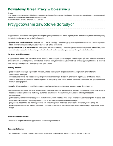 Powiatowy Urząd Pracy w Bolesławcu Źródło: http://www.pupboleslawiec.pl/bol/dla-pracodawcow-i-przed/formy-wsparcia-dla-prac/informacje-ogolne/przygotowanie-zawod owe/60,Przygotowanie-zawodowe-doroslych.html Wygenerowano: Piątek, 3 marca 2017, 00:01 Przygotowanie zawodowe dorosłych Przygotowanie zawodowe dorosłych oznacza praktyczną i teoretyczną naukę wykonywania zawodu lub przyuczenie do pracy dorosłych. Realizowane jest w dwóch formach: ● praktycznej nauki zawodu – trwającej od 12 do 18 miesięcy i umożliwiającej przystąpienie do egzaminu kwalifikacyjnego, który potwierdzi uzyskanie tytułu zawodowego lub tytułu czeladnika. ● przyuczenia do pracy dorosłych - trwającego od 3 do 6 miesięcy i umożliwiającego zdobycie wybranych kwalifikacji lub umiejętności niezbędnych do wykonywania określonych zadań zawodowych, potwierdzonych zaświadczeniem. Do kogo jest skierowane? Przygotowanie zawodowe jest skierowane do osób bezrobotnych posiadających kwalifikacje częściowo zdezaktualizowane przez przerwę w wykonywaniu zawodu lub do tych, których kwalifikacje zawodowe wymagają uzupełnienia o nabycie specyficznych umiejętności wymaganych na rynku pracy. Zasady naboru: ● pracodawca musi złożyć odpowiedni wniosek, wraz z niezbędnymi załącznikami m.in. programem przygotowania zawodowego dorosłych, ● wyznaczyć opiekuna dla uczestników przygotowania zawodowego dorosłych, przy czym organizując praktyczną naukę zawodu opiekun musi posiadać kwalifikacje instruktora praktycznej nauki zawodu (tytuł mistrza w zawodzie, przygotowanie lub kurs pedagogiczny). Korzyści dla pracodawcy wynikające ze zorganizowania przygotowania zawodowego dorosłych to: ● refundacja wydatków do 2% przeciętnego wynagrodzenia za każdy pełny miesiąc realizacji poniesionych przez pracodawcę kosztów, w szczególności na materiały i surowce, eksploatację maszyn i urządzeń, odzież roboczą oraz posiłki regeneracyjne; ● jednorazowa premia w wysokości ponad 460 zł (kwota premii każdego roku ulega zwiększeniu) za każdy pełny miesiąc, pod warunkiem ukończenia i zdania egzaminu przez uczestnika przygotowania zawodowego; ● pozyskanie pracownika bez nawiązywania z nim stosunku pracy, możliwość przyuczenia do wykonywania pracy na konkretnym stanowisku a także stypendium i koszty dojazdu dla uczestnika przygotowania zawodowego, wypłacane przez Urząd. Wymagane dokumenty: ● wniosek o zorganizowanie przygotowania zawodowego dorosłych Dane kontaktowe: Pani Bogusława Piechota – starszy specjalista ds. rozwoju zawodowego, pok. 211, tel. 75 732 66 01 w. 144 e-mail: [email protected] Podstawa prawna: ● Ustawa z dnia 20 kwietnia 2004 r. o promocji zatrudnienia i instytucjach rynku pracy (jedn. tekst Dz. U. z 2016 r. poz. 645 z późn. zm.). Metryka strony Data publikacji 04.12.2012 Obowiązuje od 04.12.2012 Data modyfikacji 16.06.2016Rejestr zmian Osoba publikująca: Mariusz Rogala Autor: Katarzyna Hudyma CAZ Liczba wejść: 1810 Drukuj Generuj PDF Powiadom znajomego Wstecz
