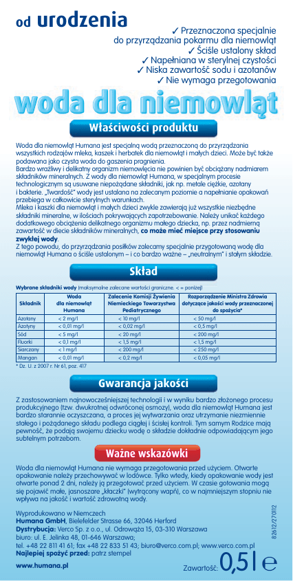 od urodzenia i Przeznaczona specjalnie do przyrządzania pokarmu dla niemowląt i Ściśle ustalony skład i Napełniana w sterylnej czystości i Niska zawartość sodu i azotanów i Nie wymaga przegotowania woda dla niemowląt Właściwości produktu Woda dla niemowląt Humana jest specjalną wodą przeznaczoną do przyrządzania wszystkich rodzajów mleka, kaszek i herbatek dla niemowląt i małych dzieci. Może być także podawana jako czysta woda do gaszenia pragnienia. Bardzo wrażliwy i delikatny organizm niemowlęcia nie powinien być obciążany nadmiarem składników mineralnych. Z wody dla niemowląt Humana, w specjalnym procesie technologicznym są usuwane niepożądane składniki, jak np. metale ciężkie, azotany i bakterie. „Twardość” wody jest ustalana na zalecanym poziomie a napełnianie opakowań przebiega w całkowicie sterylnych warunkach. Mleka i kaszki dla niemowląt i małych dzieci zwykle zawierają już wszystkie niezbędne składniki mineralne, w ilościach pokrywających zapotrzebowanie. Należy unikać każdego dodatkowego obciążenia delikatnego organizmu małego dziecka, np. przez nadmierną zawartość w diecie składników mineralnych, co może mieć miejsce przy stosowaniu zwykłej wody. Z tego powodu, do przyrządzania posiłków zalecamy specjalnie przygotowaną wodę dla niemowląt Humana o ściśle ustalonym – i co bardzo ważne – „neutralnym” i stałym składzie. Skład Wybrane składniki wody (maksymalne zalecane wartości graniczne. < = poniżej) Woda Składnik dla niemowląt Humana Azotany < 2 mg/l Azotyny < 0,01 mg/l Sód < 5 mg/l Fluorki < 0,1 mg/l Siarczany < 1 mg/l Mangan < 0,01 mg/l * Dz. U. z 2007 r. Nr 61, poz. 417 Zalecenie Komisji Żywienia Niemieckiego Towarzystwa Pediatrycznego < 10 mg/l < 0,02 mg/l < 20 mg/l < 1,5 mg/l < 200 mg/l < 0,2 mg/l Rozporządzenie Ministra Zdrowia dotyczące jakości wody przeznaczonej do spożycia* < 50 mg/l < 0,5 mg/l < 200 mg/l < 1,5 mg/l < 250 mg/l < 0,05 mg/l Gwarancja jakości Z zastosowaniem najnowocześniejszej technologii i w wyniku bardzo złożonego procesu produkcyjnego (tzw. dwukrotnej odwróconej osmozy), woda dla niemowląt Humana jest bardzo starannie oczyszczana, a proces jej wytwarzania oraz utrzymanie niezmiennie stałego i pożądanego składu podlega ciągłej i ścisłej kontroli. Tym samym Rodzice mają pewność, że podają swojemu dziecku wodę o składzie dokładnie odpowiadającym jego subtelnym potrzebom. Ważne wskazówki Wyprodukowano w Niemczech Humana GmbH, Bielefelder Strasse 66, 32046 Herford Dystrybucja: Verco Sp. z o.o., ul. Odrowąża 15, 03-310 Warszawa biuro: ul. E. Jelinka 48, 01-646 Warszawa; tel. +48 22 811 41 61; fax +48 22 833 51 43; [email protected]; www.verco.com.pl Najlepiej spożyć przed: patrz stempel www.humana.pl Zawartość: 0,5 l 82612/270112 Woda dla niemowląt Humana nie wymaga przegotowania przed użyciem. Otwarte opakowanie należy przechowywać w lodówce. Tylko wtedy, kiedy opakowanie wody jest otwarte ponad 2 dni, należy ją przegotować przed użyciem. W czasie gotowania mogą się pojawić małe, jasnoszare „kłaczki” (wytrącony wapń), co w najmniejszym stopniu nie wpływa na jakość i wartość zdrowotną wody.
