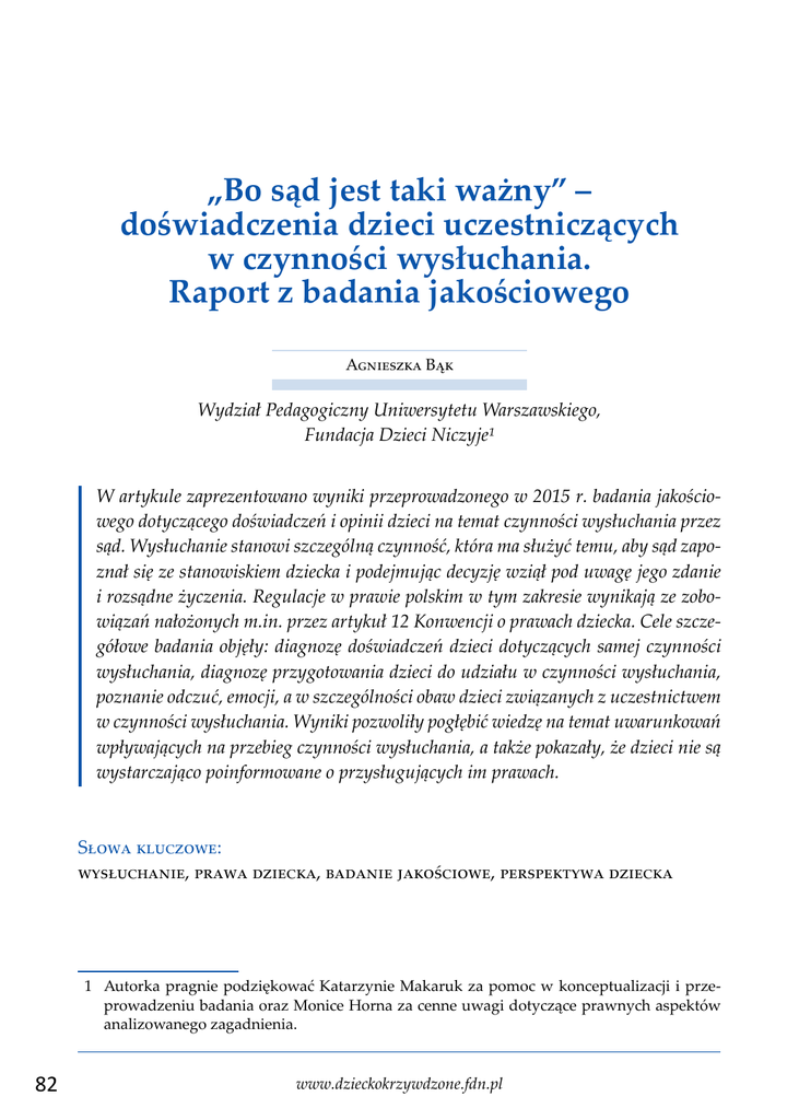 „Bo sąd jest taki ważny” – doświadczenia dzieci uczestniczących w czynności wysłuchania. Raport z badania jakościowego Agnieszka Bąk Wydział Pedagogiczny Uniwersytetu Warszawskiego, Fundacja Dzieci Niczyje1 W artykule zaprezentowano wyniki przeprowadzonego w 2015 r. badania jakościowego dotyczącego doświadczeń i opinii dzieci na temat czynności wysłuchania przez sąd. Wysłuchanie stanowi szczególną czynność, która ma służyć temu, aby sąd zapoznał się ze stanowiskiem dziecka i podejmując decyzję wziął pod uwagę jego zdanie i rozsądne życzenia. Regulacje w prawie polskim w tym zakresie wynikają ze zobowiązań nałożonych m.in. przez artykuł 12 Konwencji o prawach dziecka. Cele szczegółowe badania objęły: diagnozę doświadczeń dzieci dotyczących samej czynności wysłuchania, diagnozę przygotowania dzieci do udziału w czynności wysłuchania, poznanie odczuć, emocji, a w szczególności obaw dzieci związanych z uczestnictwem w czynności wysłuchania. Wyniki pozwoliły pogłębić wiedzę na temat uwarunkowań wpływających na przebieg czynności wysłuchania, a także pokazały, że dzieci nie są wystarczająco poinformowane o przysługujących im prawach. Słowa kluczowe: wysłuchanie, prawa dziecka, badanie jakościowe, perspektywa dziecka 1 Autorka pragnie podziękować Katarzynie Makaruk za pomoc w konceptualizacji i przeprowadzeniu badania oraz Monice Horna za cenne uwagi dotyczące prawnych aspektów analizowanego zagadnienia. 82 www.dzieckokrzywdzone.fdn.pl Agnieszka Bąk Wstęp Z godnie z Konwencją o prawach dziecka, Europejską Konwencją o wykonywaniu praw dzieci oraz Konstytucją Rzeczpospolitej Polskiej dzieci mają prawo do bycia wysłuchanym i do wyrażania swoich poglądów we wszystkich sprawach ich dotyczących. Konkretyzacją tych zasad są m.in. art. 2161 § 1 i art. 576 § 2 Kodeksu postępowania cywilnego, które wprowadziły instytucję wysłuchania dziecka w sprawach istotnych dla niego lub jego majątku. Wysłuchanie stanowi szczególną czynność, która ma służyć temu, aby sąd zapoznał się ze stanowiskiem dziecka i podejmując decyzję wziął pod uwagę – stosownie do okoliczności, rozwoju umysłowego, stanu zdrowia i stopnia dojrzałości małoletniego – zdanie dziecka i jego rozsądne życzenia. Wysłuchanie nie jest więc dowodem w sprawie, a ma charakter informacyjny. Rozmowa dziecka z sądem jest bardzo istotna, gdyż daje możliwość bezpośredniego kontaktu i uwzględnienia przez sędziego dziecięcej perspektywy (Borkowska, 2014; Cieśliński, 2012). Przestrzeganie prawa dziecka do wysłuchania w ramach postępowań sądowych było analizowane m.in. przez Helsińską Fundację Praw Człowieka. W 2012 r. ta fundacja, wraz z Agencją Praw Podstawowych Unii Europejskiej, przeprowadziła badania dotyczące udziału dzieci w postępowaniach karnych i cywilnych. Przegląd praktyk w państwach należących do Unii Europejskiej2 wykazał m.in. brak wystarczającego wsparcia dla dzieci w trakcie postępowania sądowego, a także niedostateczne uwzględnienie potrzeb dziecka. Jak zauważono w raporcie Child-friendly justice – Perspectives and experiences of professionals on children’s participation in civil and criminal judicial proceedings in 10 EU Member States, do realizacji prawa do wysłuchania i pełnego, świadomego uczestnictwa dziecka w postępowaniu sądowym potrzebne jest nie tylko samo zapoznanie się z poglądami dziecka, ale również zapewnienie bezpiecznych i przyjaznych okoliczności spotkania z sądem oraz dostosowanie sposobu prowadzenia rozmowy do etapu rozwoju i stanu emocjonalnego dziecka. W większości badanych państw przepisy regulujące udział dziecka w postępowaniu karnym i cywilnym były odmienne. Zaobserwowano, że o ile w sprawach karnych prawo dziecka do wysłuchania było realizowane częściej niż w przeszłości, to w sprawach cywilnych było to nadal sporadyczne. Dysproporcja ta była charakterystyczna również dla Polski. 2 Na potrzeby badania w 10 krajach zrealizowano wywiady ze specjalistami, którzy na co dzień stykają się z dziećmi w postępowaniach cywilnych lub karnych. Były to: Bułgaria, Chorwacja, Estonia, Finlandia, Francja, Niemcy, Polska, Rumunia, Hiszpania i Wielka Brytania. Dziecko krzywdzone. Teoria, badania, praktyka Vol. 14 Nr 4 (2015) 83 „BO SĄD JEST TAKI WAŻNY” – DOŚWIADCZENIA DZIECI UCZESTNICZĄCYCH W CZYNNOŚCI… Na niski poziom udziału dzieci w sprawach cywilnych w Polsce wskazują przeprowadzone dotychczas analizy akt sądowych. Na ich podstawie można szacować, że sąd bezpośrednio wysłuchuje opinii dzieci w kilku procentach spraw, które ich dotyczą. Długoszewska przebadała 300 spraw o ograniczenie lub pozbawienie władzy rodzicielskiej wszczętych w latach 2006–2007, które obejmowały postępowaniem 575 dzieci. Wysłuchanie dziecka miało miejsce w 6% analizowanych przypadków (Długoszewska, 2012). Spośród 62 przebadanych w 2012 r. przez Holewińską-Łapińską (2013) spraw o pozbawienie władzy rodzicielskiej, które dotyczyły 96 małoletnich, w zaledwie 7,3% przypadków odbyło się wysłuchanie dziecka bezpośrednio przez sąd, a w 24% – stanowisko dziecka ustalili biegli z rodzinnego ośrodka diagnostyczno-konsultacyjnego. Przeanalizowała ona również 341 spraw o przysposobienie rozwiązywalne3 rozstrzygniętych w ostatnim kwartale 2013 r., które dotyczyły 425 dzieci. W badaniu wykazano, że wysłuchanie dziecka było bardzo rzadkie i odbyło się w zaledwie 4,7% spraw, a w 3,5% przypadków sąd pośrednio zapoznał się ze stanowiskiem dziecka. W opinii badaczki jedynym, ale tylko częściowym, uzasadnieniem takiej sytuacji mógł być młody wiek dużej części dzieci, który uzasadniał domniemanie, że nie są one w stanie zrozumieć znaczenia przysposobienia jako konstrukcji prawnej, co stanowiło podstawę do odstąpienia od wysłuchania (Holewińska-Łapińska, 2014). Słyk (20