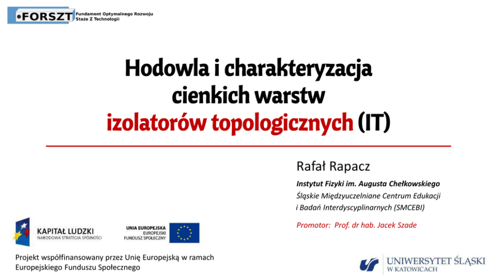 Hodowla i charakteryzacja cienkich warstw izolatorów topologicznych (IT) Rafał Rapacz Instytut Fizyki im. Augusta Chełkowskiego Śląskie Międzyuczelniane Centrum Edukacji i Badań Interdyscyplinarnych (SMCEBI) Promotor: Prof. dr hab. Jacek Szade Projekt współfinansowany przez Unię Europejską w ramach Europejskiego Funduszu Społecznego Czym są Izolatory Topologiczne (IT)? Conductance channel with up-spin charge carries[1] E.T. [2] Quantum well Conductance channel with downcharge carries [1] Bjorn Carey, Stanford News Service, August 10, 2012 [2] http://www.infinitehollywood.com/e-t-galactic-friend-figure-review/ Rys historyczny - czyli kto to zrobił? Laureaci nagrody europejskiego Towarzystwa Fizycznego. Z dyplomami od lewej stoją profesorowie:      Shoucheng Zhang Laurens Molenkamp Eugene Mele Charles Kane Hartmut Buhmann[1] [1] Fot. Tomasz Pietrzak, zdjecie z archiwum Instytutu Problemów Jadrowych Jak wyglądałby dzisiejszy świat bez elektroniki? [1] Fot. Tomasz Pietrzak, zdjecie z archiwum Instytutu Problemów Jadrowych Aspiryna dla Pana Gordon E. Moore? IT Gordon E. Moore[2]. Twórca empirycznego prawa Moore’a (1965r). Współzałożyciel korporacji Intel. Zmieniające się parametry układów scalonych na przestrzeni lat[1] [1] The Free Lunch Is Over, Herb Sutter, http://www.gotw.ca/publications/concurrency-ddj.htm [2] Transistor made using single atom may help beat Moore’s Law, http://www.livemint.com/Industry Dlaczego Izolatory Topologiczne? Układy scalone produkowane w obecnej technologii[1] Tak mogą wyglądać układy scalone produkowane w przyszłości[1] Ponadto IT mogą wprowadzić dodatkowy stopień swobody w technologii przesyłania informacji, który będzie związany już nie tylko z ładunkiem elektronu, ale także z jego spinem. [1] S. Zhang, Topological insulators and their potential applications http://www.aip.org/industry/ipf/2011/ Potencjalne zastosowania  Elektronika  Elektroniczne manipulowanie w pamięciach magnetycznych  Spintronika  Komputery kwantowe      Efekt termoelektryczny (niektóre materiały) Przewodnictwo balistyczne Spinowy efekt Halla Nadprzewodnictwo Fermiony Majorany [1] L. Andrew Wray et al., Observation of topological order in a superconducting doped topological insulator. Nature Physics 6, 855–859 (2010) Materiały wykazujące właściwości IT Bi2Te3 – tellurek bizmutu[1] Bi2Se3 – selenek bizmutu[2] Sb2Te3 – tellurek antymonu[3] i inne:  Sb2Se3 – selenek antymonu ZnS/Bi2Se3 ZnSe/Bi2Se3 Bi2(Te,Se)2(Se,S) – kawazulit[4] Pb0.77Sn0.23Se[4] [1] Yao-Yi Li, Intrinsic Topological Insulator Bi2Te3 Thin Films on Si , Adv. Mater. 2010, 22, 4002–4007 [2] X. F. Kou, Epitaxial growth of high mobility Bi2Se3 thin films on CdS Appl. Phys. Lett. 98, 242102 2011 [3] Guang Wang, Atomically Smooth Ultrathin Films of Topological Insulator Sb2Te3, Nano Res. 2010, 3(12): 874–880 [4] Nano Letters http://pubs.acs.org/doi/abs/10.1021/nl304583m [5] P. Dziawa, Topological crystalline insulator states in Pb1−xSnxSe, Nature Materials 11, 1023–1027 (2012) Unit cell 3,04nm (c-axis) Bi2Te3 - Jak to jest zbudowane? QL Te (1) Bi Te (2) Bi Te (1) masa molowa: 800.761 g/mol występowanie: grey powder gęstość: 7.7 g/cm3 temp. topnienia: 585 C wymiary komórki: a = 4.375, c = 30.39 układ krystalograficzny: trygonalny (heksagonalny) grupa przestrzenna: (R3m) komórka oraz rzut w kierunku (111) pierwszej strefy Brillouina[1] [1] By Yao-Yi Li , Guang Wang, Intrinsic Topological Insulator Bi 2 Te 3 Thin Films on Si and Their Thickness Limit, Adv. Mater. 2010, 22, 4002–4007 Pasmowa teoria przewodnictwa Charles Kane, Joel Moore, Topological insulators, Physics World February 2011 Struktura elektronowa Bi2Te3 Pierwsza strefa Brillouina[1] wewnętrzna struktura IT jest: półprzewodnikiem na powierzchni IT jest: metalem Energy (Ry.) obliczenia teoretyczne Pasmowa struktura elektronowa Bi2Te3 obliczona metodą LMTO-LDA z uwzględnieniem sprzężenia spin-orbita[1] [1] S K Mishra, Electronic structure and thermoelectric properties of bismuth telluride and bismuth selenide, 1997 J. Phys.: Condens. Matter 9 461 Struktura elektronowa Bi2Te3 dane doświadczalne (ARPES) Dyspersja pasm energii w pobliżu punktu Γ (BZ). SS - surface states (czerwona) VB - valence band (różowa) CB - conduction band (zielona) EF - Fermi level (niebieska) Widmo ARPES (Angle Resolved Photoemission Spectroscopy) dla Bi2Se3. Zmiany energii w zależności od ilości QL[2] [1] Yao-Yi Li, Intrinsic Topological Insulator Bi2Te3 Thin Films on Si , Adv. Mater. 2010, 22, 4002–4007 [2] Yi Zhang, Crossover of the three-dimensional topological insulator Bi2Se3 Nature Physics 6, 584–588 (2010) Laboratorium Fizyki Powierzchni Zespół badawczy:  Prof. dr hab. Jacek Szade  Dr Katarzyna Balin  Mgr Anna Nowak  Mgr Rafał Rapacz  Mateusz Weis Klaster badawczy (UHV):  spektrometr fotoelektronów XPS + UPS,  skaningowy spektrometr elektronów Auger  mikroskop elektronowym SEM  dyfraktometr elektronów RHEED  dyfraktometr elektronów LEED  mikroskop SPM (AFM/STM)  napylarka (MBE)  komory preparacyjne ponadto:  spektrometr masowy TOF-SIMS kontrolery spektrometr Laboratorium Fizyki Powierzchni kwadrupolowy AFM, STM, LC-AFM, MFM spektroskopia Auger’a LL RHEED komora MBE mikroskop skaningowy SPM Laboratorium Fizyki Powierzchni LEED mikroskop skaningowy komora preparacyjna UPS LL komora XPS SPM Laboratorium Fizyki Powierzchni XPS ToF - SIMS Produkcja rusza na całego - MBE 1) Przygotowanie podłoża :  montaż na nośniku Si (100)  paterowanie (jony Ar+),  wygrzewanie (500oC) 2) Napylanie próbki:  temp podkładu (Si) 130oC  tryb kodepozycji  temp. Te: 200oC - 230oC  temp. Bi: 390°C - 450°C Charakterystyka cienkich warstw Bi-Te 156,85 eV 162,15 eV Te (1) Si Bi2Te3 Te (2) Te(1) Bi2Te3 Bi2Te3 Bi2Te3 tilted Bi2Te3 tilted Podsumowanie 1) Co zostało zrobione:  uzyskanie ultra czystych polikrystalicznych warstw Bi2Te3 z wykorzystaniem techniki MBE na podkładzie krzemowym  uzyskanie monokryst