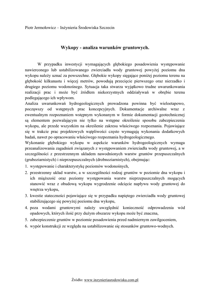 Piotr Jermołowicz – Inżynieria Środowiska Szczecin Wykopy - analiza warunków gruntowych. W przypadku inwestycji wymagających głębokiego posadowienia występowanie nawierconego lub ustabilizowanego zwierciadła wody gruntowej powyżej poziomu dna wykopu należy uznać za powszechne. Głębokie wykopy sięgające poniżej poziomu terenu na głębokość kilkunastu i więcej metrów, powodują przecięcie pierwszego oraz nierzadko i drugiego poziomu wodonośnego. Sytuacja taka stwarza wyjątkowo trudne uwarunkowania realizacji prac i może być źródłem niekorzystnych oddziaływań w obrębie terenu podlegającego ich wpływom. Analiza uwarunkowań hydrogeologicznych prowadzona powinna być wieloetapowo, począwszy od wstępnych prac koncepcyjnych. Dokumentacje archiwalne wraz z ewentualnym rozpoznaniem wstępnym wykonanym w formie dokumentacji geotechnicznej są elementem pozwalającym nie tylko na wstępne określenie sposobu zabezpieczenia wykopu, ale przede wszystkim na określenie zakresu właściwego rozpoznania. Pojawiające się w trakcie prac projektowych wątpliwości często wymagają wykonania dodatkowych badań, nawet po opracowaniu właściwego rozpoznania hydrogeologicznego. Wykonanie głębokiego wykopu w aspekcie warunków hydrogeologicznych wymaga przeanalizowania zagadnień związanych z występowaniem zwierciadła wody gruntowej, a w szczególności z przestrzennym układem nawodnionych warstw gruntów przepuszczalnych (gruboziarnistych) i nieprzepuszczalnych (drobnoziarnistych), obejmując: 1. występowanie i charakterystykę poziomów wodonośnych, 2. przestrzenny układ warstw, a w szczególności rodzaj gruntów w poziomie dna wykopu i ich miąższość oraz poziomy występowania warstw nieprzepuszczalnych mogących stanowić wraz z obudową wykopu wygrodzenie odcięcie napływu wody gruntowej do wnętrza wykopu, 3. kwestie stateczności pojawiające się w przypadku napiętego zwierciadła wody gruntowej stabilizującego się powyżej poziomu dna wykopu, 4. poza wodami gruntowymi należy uwzględnić konieczność odprowadzenia wód opadowych, których ilość przy dużym obszarze wykopu może być znaczna, 5. zabezpieczenie gruntów w poziomie posadowienia przed nadmiernym zawilgoceniem, 6. wypór konstrukcji ze względu na ustabilizowanie się stosunków gruntowo-wodnych. Źródło: www.inzynieriasrodowiska.com.pl Rys. 1. Sposoby zabezpieczenia wykopów przed napływem wody gruntowej. A) studnie depresyjne, B) przesłona iniekcyjna, C) zagłębienie obudowy w podłoże nieprzepuszczalne [1] Dla zabezpieczenia wykopu przed napływem wód gruntowych stosujemy następujące zabiegi: 1. doraźne lub trwałe obniżenie zwierciadła wody gruntowej z wykorzystaniem drenażu pionowego (studni depresyjnych), 2. wykonanie w dnie wykopu przesłony iniekcyjnej, tzw. korka dennego, 3. wykonanie odpowiednio głębokiej obudowy wykopu zagłębionej do warstw nieprzepuszczalnych. Obniżenie zwierciadła wody gruntowej z wykorzystaniem drenażu pionowego zapewnia prowadzenie robót budowlanych przy „suchym" wykopie. W większości przypadków jest rozwiązaniem najprostszym oraz najtańszym, lecz nie pozbawionym wad. Odbierając wody z podłoża gruntowego wytwarza się lej depresji, którego zasięg wykracza zazwyczaj znacznie poza obszar objęty pracami. Wytworzeniu zwierciadła dynamicznego w obrębie posadowienia istniejących obiektów towarzyszą dodatkowe osiadania. Podczas obniżania zwierciadła wody gruntowej z wykorzystaniem studni depresyjnych należy tak prowadzić prace, aby ciśnienie spływowe skierowane było w dół. Jedynie w przypadku gruntów gruboziarnistych (żwiry) z uwagi na znaczne wymiary ziaren nie ma to większego znaczenia. Przyjmuje się, że zdepresjonowane zwierciadło wody gruntowej powinno znajdować się min. 0,5 m poniżej aktualnego bądź docelowego dna wykopu. Mając na uwadze zabudowany charakter terenu oraz licząc się z realnym zagrożeniem powstania uszkodzeń na skutek osiadań spowodowanych wytworzoną depresją poszukuje się zazwyczaj rozwiązań alternatywnych. Drugim z możliwych sposobów zabezpieczenia wykopu może być wykonanie przesłony filtracyjnej formowanej z wykorzystaniem technik iniekcyjnych. Wykonanie kolumn kształtowanych w technologii iniekcji strumieniowej „jet grouting" pozwala na wytworzenie sztucznej warstwy izolującej dno wykopu, przez co uzyskuje się odcięcie napływu wód gruntowych. Źródło: www.inzynieriasrodowiska.com.pl Przy szczegółowym rozpoznaniu podłoża gruntowego oraz ciągłych warstwach nieprzepuszczalnych wymagane minimalne zagłębienie obudowy w warstwie odcinającej należy przyjąć około 2,0 m (jednak nie mniej niż 1,0 m). Obok zapewniania odcięcia napływu wody gruntowej do wykopu każdorazowo należy przeanalizować możliwość utraty stateczności dna spowodowaną naporowym zwierciadłem wody gruntowej. Na skutek wykonywania wykopu, naturalnie istniejący stan równowagi zostaje zachwiany. Ciśnienie wywierane przez, pomniejszony wykopem nadkład gruntu może nie równoważyć naporu wody. W momencie przekroczenia stanu granicznego dochodzi do utraty stateczności dna i awarii. Informacje podane w dokumentacji geologiczno-inżynierskiej oraz hydrogeologicznej o charakterze, a w szczególności o poziomach nawierconego i ustabilizowanego, zwierciadła wody gruntowej dotyczą informacji zarejestrowanych podczas wierceń oraz obserwacji. Należy pamiętać, że w wyniku gwałtownych opadów atmosferycznych, wyjątkowo długich okresów deszczowych, spiętrzenia wody w pobliskiej rzece lub zbiorniku, czy też jego gwałtownego opróżnienia bądź wykonania głębokiego wykopu stan wód gruntowych może ulec zmianom. Zmiany te nie zawsze mogą być uchwycone W większości opracowań przyjmuje się jako miarodajne wahania poziomu wody gruntowej w przedziale ±1,0 m, co w przybliżeniu odpowiada około 70% przypadków zarejestrowanych amplitud w prowadzonych dotychc