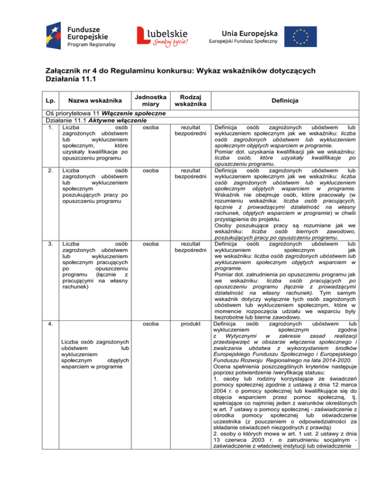 Załącznik nr 4 do Regulaminu konkursu: Wykaz wskaźników dotyczących Działania 11.1 Lp. Nazwa wskaźnika Jednostka miary Rodzaj wskaźnika Definicja Oś priorytetowa 11 Włączenie społeczne Działanie 11.1 Aktywne włączenie 1. Liczba osób zagrożonych ubóstwem lub wykluczeniem społecznym, które uzyskały kwalifikacje po opuszczeniu programu osoba rezultat bezpośredni 2. Liczba osób zagrożonych ubóstwem lub wykluczeniem społecznym poszukujących pracy po opuszczeniu programu osoba rezultat bezpośredni 3. Liczba osób zagrożonych ubóstwem lub wykluczeniem społecznym pracujących po opuszczeniu programu (łącznie z pracującymi na własny rachunek) osoba rezultat bezpośredni osoba produkt 4. Liczba osób zagrożonych ubóstwem lub wykluczeniem społecznym objętych wsparciem w programie Definicja osób zagrożonych ubóstwem lub wykluczeniem społecznym jak we wskaźniku: liczba osób zagrożonych ubóstwem lub wykluczeniem społecznym objętych wsparciem w programie. Pomiar dot. uzyskania kwalifikacji jak we wskaźniku: liczba osób, które uzyskały kwalifikacje po opuszczeniu programu. Definicja osób zagrożonych ubóstwem lub wykluczeniem społecznym jak we wskaźniku: liczba osób zagrożonych ubóstwem lub wykluczeniem społecznym objętych wsparciem w programie. Wskaźnik nie obejmuje osób, które pracowały (w rozumieniu wskaźnika: liczba osób pracujących, łącznie z prowadzącymi działalność na własny rachunek, objętych wsparciem w programie) w chwili przystąpienia do projektu. Osoby poszukujące pracy są rozumiane jak we wskaźniku: liczba osób biernych zawodowo, poszukujących pracy po opuszczeniu programu. Definicja osób zagrożonych ubóstwem lub wykluczeniem społecznym jak we wskaźniku: liczba osób zagrożonych ubóstwem lub wykluczeniem społecznym objętych wsparciem w programie. Pomiar dot. zatrudnienia po opuszczeniu programu jak we wskaźniku: liczba osób pracujących po opuszczeniu programu (łącznie z prowadzącymi działalność na własny rachunek). Tym samym wskaźnik dotyczy wyłącznie tych osób zagrożonych ubóstwem lub wykluczeniem społecznym, które w momencie rozpoczęcia udziału we wsparciu były bezrobotne lub bierne zawodowo. Definicja osób zagrożonych ubóstwem lub wykluczeniem społecznym zgodna z Wytycznymi w zakresie zasad realizacji przedsięwzięć w obszarze włączenia społecznego i zwalczania ubóstwa z wykorzystaniem środków Europejskiego Funduszu Społecznego i Europejskiego Funduszu Rozwoju Regionalnego na lata 2014-2020. Ocena spełnienia poszczególnych kryteriów następuje poprzez potwierdzenie /weryfikację statusu: 1. osoby lub rodziny korzystające ze świadczeń pomocy społecznej zgodnie z ustawą z dnia 12 marca 2004 r. o pomocy społecznej lub kwalifikujące się do objęcia wsparciem przez pomoc społeczną, tj. spełniające co najmniej jeden z warunków określonych w art. 7 ustawy o pomocy społecznej - zaświadczenie z ośrodka pomocy społecznej lub oświadczenie uczestnika (z pouczeniem o odpowiedzialności za składanie oświadczeń niezgodnych z prawdą) 2. osoby o których mowa w art. 1 ust. 2 ustawy z dnia 13 czerwca 2003 r. o zatrudnieniu socjalnym zaświadczenie z właściwej instytucji lub oświadczenie uczestnika (z pouczeniem o odpowiedzialności za składanie oświadczeń niezgodnych z prawdą) 3. osoby przebywające w pieczy zastępczej lub opuszczające pieczę zastępczą, rodziny przeżywające trudności w pełnieniu funkcji opiekuńczowychowawczych, o których mowa w ustawie z dnia 9 czerwca 20111 r. o wspieraniu rodziny i systemie pieczy zastępczej - zaświadczenie z właściwej instytucji, zaświadczenie od kuratora, wyrok sądu, oświadczenie uczestnika (z pouczeniem o odpowiedzialności za składanie oświadczeń niezgodnych z prawdą) 4. osoby nieletnie, wobec których zastosowano środki zapobiegania i zwalczania demoralizacji i przestępczości zgodnie z ustawą z dnia 26 października 1982 r. o postępowaniu w sprawach nieletnich - zaświadczenie od kuratora; zaświadczenie z zakładu poprawczego lub innej instytucji czy organizacji społecznej zajmującej się pracą z nieletnimi o charakterze wychowawczym, terapeutycznym lub szkoleniowym; kopia postanowienia sądu; inny dokument potwierdzający zastosowanie środków zapobiegania i zwalczania demoralizacji i przestępczości 5. osoby przebywające w młodzieżowych ośrodkach wychowawczych i młodzieżowych ośrodkach socjoterapii, o których mowa w ustawie z dnia 7 września 1991 r. o systemie oświaty (Dz. U. 1991 Nr 95 poz. 425 z późn. zm.) - zaświadczenie z ośrodka wychowawczego/ młodzieżowego/ socjoterapii 6. osoby z niepełnosprawnością - odpowiednie orzeczenie lub innym dokument poświadczający stan zdrowia 7. rodziny z dzieckiem z niepełnosprawnością, o ile co najmniej jeden z rodziców lub opiekunów nie pracuje ze względu na konieczność sprawowania opieki nad dzieckiem z niepełnosprawnością - odpowiednie orzeczenie lub innym dokument poświadczający stan zdrowia oraz oświadczenie uczestnika (z pouczeniem o odpowiedzialności za składanie oświadczeń niezgodnych z prawdą) 8. osoby zakwalifikowane do III profilu pomocy zgodnie z ustawą z dnia 20 kwietnia 2004 r. o promocji zatrudnienia i instytucjach rynku pracy - zaświadczenie z urzędu pracy 9. osoby niesamodzielne ze względu na podeszły wiek, niepełnosprawność lub stan zdrowia - zaświadczenie od lekarza; odpowiednie orzeczenie lub innym dokument poświadczający stan zdrowia, oświadczenie uczestnika (z pouczeniem o odpowiedzialności za składanie oświadczeń niezgodnych z prawdą) 10. osoby bezdomne lub dotknięte wykluczeniem z dostępu do mieszkań - zaświadczenie od właściwej instytucji lub inny dokument potwierdzający ww. sytuację np. kopia wyroku sądowego, pismo ze spółdzielni o zadłużeniu, oświadczenie uczestnika (z pouczeniem o odpowiedzialności za składanie oświadczeń niezgodnych z p