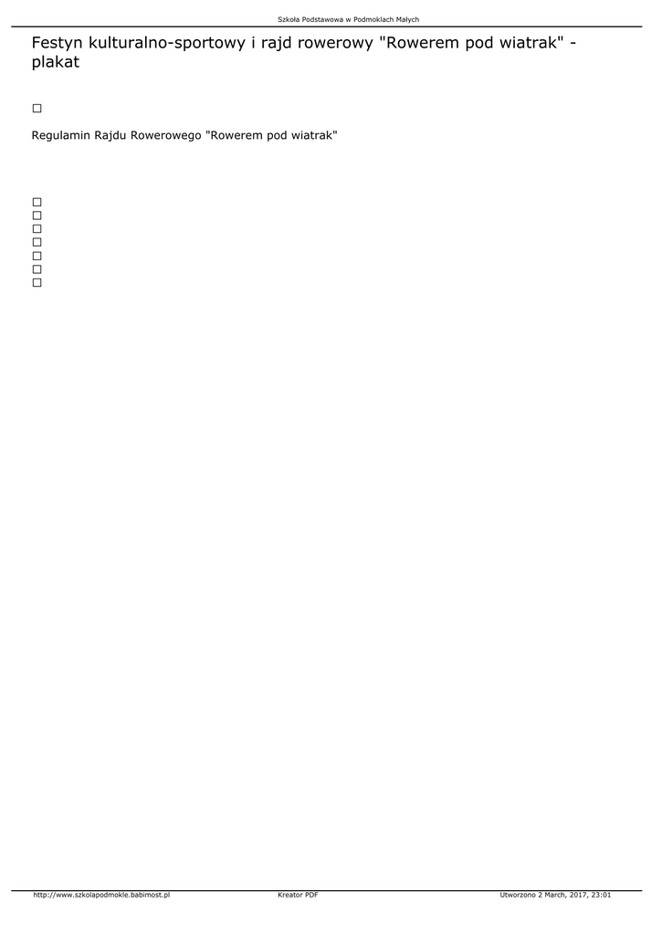 Szkoła Podstawowa w Podmoklach Małych Festyn kulturalno-sportowy i rajd rowerowy "Rowerem pod wiatrak" plakat Regulamin Rajdu Rowerowego "Rowerem pod wiatrak" http://www.szkolapodmokle.babimost.pl Kreator PDF Utworzono 2 March, 2017, 23:01