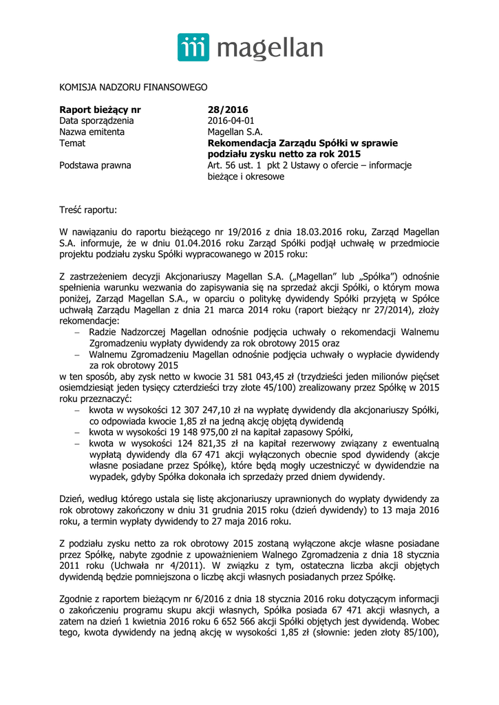 KOMISJA NADZORU FINANSOWEGO Raport bieżący nr Data sporządzenia Nazwa emitenta Temat Podstawa prawna 28/2016 2016-04-01 Magellan S.A. Rekomendacja Zarządu Spółki w sprawie podziału zysku netto za rok 2015 Art. 56 ust. 1 pkt 2 Ustawy o ofercie – informacje bieżące i okresowe Treść raportu: W nawiązaniu do raportu bieżącego nr 19/2016 z dnia 18.03.2016 roku, Zarząd Magellan S.A. informuje, że w dniu 01.04.2016 roku Zarząd Spółki podjął uchwałę w przedmiocie projektu podziału zysku Spółki wypracowanego w 2015 roku: Z zastrzeżeniem decyzji Akcjonariuszy Magellan S.A. („Magellan” lub „Spółka”) odnośnie spełnienia warunku wezwania do zapisywania się na sprzedaż akcji Spółki, o którym mowa poniżej, Zarząd Magellan S.A., w oparciu o politykę dywidendy Spółki przyjętą w Spółce uchwałą Zarządu Magellan z dnia 21 marca 2014 roku (raport bieżący nr 27/2014), złoży rekomendacje: Radzie Nadzorczej Magellan odnośnie podjęcia uchwały o rekomendacji Walnemu Zgromadzeniu wypłaty dywidendy za rok obrotowy 2015 oraz Walnemu Zgromadzeniu Magellan odnośnie podjęcia uchwały o wypłacie dywidendy za rok obrotowy 2015 w ten sposób, aby zysk netto w kwocie 31 581 043,45 zł (trzydzieści jeden milionów pięćset osiemdziesiąt jeden tysięcy czterdzieści trzy złote 45/100) zrealizowany przez Spółkę w 2015 roku przeznaczyć: kwota w wysokości 12 307 247,10 zł na wypłatę dywidendy dla akcjonariuszy Spółki, co odpowiada kwocie 1,85 zł na jedną akcję objętą dywidendą kwota w wysokości 19 148 975,00 zł na kapitał zapasowy Spółki, kwota w wysokości 124 821,35 zł na kapitał rezerwowy związany z ewentualną wypłatą dywidendy dla 67 471 akcji wyłączonych obecnie spod dywidendy (akcje własne posiadane przez Spółkę), które będą mogły uczestniczyć w dywidendzie na wypadek, gdyby Spółka dokonała ich sprzedaży przed dniem dywidendy. Dzień, według którego ustala się listę akcjonariuszy uprawnionych do wypłaty dywidendy za rok obrotowy zakończony w dniu 31 grudnia 2015 roku (dzień dywidendy) to 13 maja 2016 roku, a termin wypłaty dywidendy to 27 maja 2016 roku. Z podziału zysku netto za rok obrotowy 2015 zostaną wyłączone akcje własne posiadane przez Spółkę, nabyte zgodnie z upoważnieniem Walnego Zgromadzenia z dnia 18 stycznia 2011 roku (Uchwała nr 4/2011). W związku z tym, ostateczna liczba akcji objętych dywidendą będzie pomniejszona o liczbę akcji własnych posiadanych przez Spółkę. Zgodnie z raportem bieżącym nr 6/2016 z dnia 18 stycznia 2016 roku dotyczącym informacji o zakończeniu programu skupu akcji własnych, Spółka posiada 67 471 akcji własnych, a zatem na dzień 1 kwietnia 2016 roku 6 652 566 akcji Spółki objętych jest dywidendą. Wobec tego, kwota dywidendy na jedną akcję w wysokości 1,85 zł (słownie: jeden złoty 85/100), jaka zostanie zaproponowana przez Zarząd Spółki w ww. projekcie uchwały, uwzględnia pominięcie tych 67 471 akcji własnych. Uwzględniając możliwość zbycia akcji własnych przez Spółkę zgodnie z upoważnieniem Walnego Zgromadzenia z dnia 18 stycznia 2011 roku (Uchwała nr 4/2011), Spółka zaproponuje w projekcie uchwały Walnego Zgromadzenia postanowienie, zgodnie z którym w sytuacji, w której Spółka do dnia dywidendy określonego w uchwale Walnego Zgromadzenia Magellan S.A. o podziale zysku zbędzie akcje własne Spółki, kwota ustalona jako iloczyn liczby akcji własnych zbytych przez Spółkę i kwoty 1,85 zł na jedną akcję, pomniejszy kwotę przeznaczoną na kapitał rezerwowy związany z ewentualną wypłatą dywidendy i odpowiednio zwiększy kwotę przeznaczoną na wypłatę dywidendy. Mając na uwadze powyższe, projekt uchwały o podziale zysku za 2015 roku Zwyczajnego Walnego Zgromadzenia Magellan S.A. jakie będzie zwołane przez Zarząd Magellan S.A. na dzień 29 kwietnia 2016 roku uwzględniać będzie wskazane powyżej założenia. Zgodnie z treścią wezwania do zapisywania się na sprzedaż akcji Magellan ogłoszonego w dniu 8 stycznia 2016 r. przez Mediona Sp. z o.o. („Mediona”) jednym z warunków wezwania (pkt 25 ppkt c) wezwania) jest podjęcie przez Walne Zgromadzenie Spółki uchwały o przeznaczeniu całego zysku za rok obrotowy zakończony w dniu 31 grudnia 2015 r. na kapitał zapasowy, przy czym Mediona zastrzegła prawo do nabycia akcji mimo nieziszczenia się warunku. W konsekwencji, w przypadku podjęcia przez Walne Zgromadzenie Spółki uchwały o wypłacie dywidendy (w wysokości rekomendowanej przez Zarząd Magellan lub w innej wysokości), warunek, o którym mowa powyżej, nie będzie spełniony i Mediona nie będzie zobowiązana do nabycia akcji w wezwaniu (nawet w przypadku, gdy spełnią się pozostałe warunki wezwania). Podstawa prawna: § 38 ust. 1 pkt 11 Rozporządzenia Ministra Finansów z dnia 19 lutego 2009 r. w sprawie informacji bieżących i okresowych. Wiceprezes Zarządu Grzegorz Grabowicz Członek Zarządu Rafał Karnowski