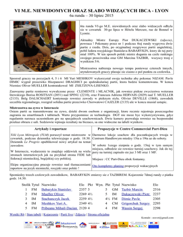 VI M.E. NIEWIDOMYCH ORAZ SŁABO WIDZĄCYCH IBCA - LYON 6a runda – 30 lipiec 2015 6ta runda VI-go M.E. niewidomych oraz slabo widzacych odbyla sie w czwartek 30-go lipca w Hôtelu Mercure, rue de Bonnel w Lyonie. Aktualny Mistrz Europy Pior DUKACZEWSKI (zdjecie), powraca ! Pokonany przez nr 1 podczas 4tej rundy wygrywa dwie partie z rzedu. Dzis, po oryginalnej rozgrywce partii angielskiej, pobil ledera rosyjskiego Stanislava BABARYKIN, ktory do tej pory mial 100%. W ten sposob polski mistrz dogania na czele rankingu swojego przeciwnika oraz GM Marcina TAZBIR, wszyscy trzej z wynikiem 5/6. Mistrzostwa nabieraja nowego tempa poniewaz czterech innych, utytulowanych graczy plasuje sie ciasno o pol punkta za czolowka. Sposrod graczy na pozycjach 4, 5 i 6 MI Yuri MESHKOV wykorzystal swoja technike aby pokonac NIZAM. Pavle DIMIC wygral przeciwko Hiszpanowi DRAGHICI po spektakularnej partii, ktora bedzie komentowana. W koncu Niemiec Oliver MUELLER kontratakowal MI ZSILTZOVA-LISENKO. Zauwazmy partie remisowe wywalczone przez CLEMENTE i MLACNIK, jak rowniez piekne zwyciestwa weterana litewskiego Borisa ROSITSAN (2051) nad SPINU (2210), oraz Francuza Adriena HERVAIS (2029) nad T. MUELLER (2133). Belg DALSCHAERT kontynuuje rowniez zawody w pieknym stylu. Olivier DEVILLE (1868), zawodnik szczebla regionalnego, rozegral solidna partie przeciwko Chorwatowi CAJZLER (2135) ale w koncu musial ustapic. Mistrzostwa na zywo w Internecie Osiem partii sa transmitowane na zywo, dzieki dwom osobom z organizacji, ktore recznie rejestruja poszczegolne zagrania na smartfonach i tabletach. Warto przypomniec ze technologia DGT nie moze byc wykorzystywana, gdyz regulamin narzuca uczestnikom gre na specjalnych szachownicach. Dwie kamery pozwalaja rowniez na bezposredni przekaz obrazu z sali. Sedziowie wpisuja rezultaty na biezaco, sa one widoczne na tabeli wynikow. Artykuly i reportaze Propozycje w Centre Commercial Part-Dieu Télé Lyon Métropole (TLM) poruszyl temat mistrzostw w Darmowe lekcje szachow dla poczatkujacych trwaja w czwartek, podczas dziennika telewizyjego o godz. 18.30. Centrum Handlowym miedzy 15ta a 19ta az do soboty. Dziennik Le Progrès opublikowal nowy artykul na temat W sobote 1szego sierpnia o godz. 15tej w tym samym zawodow. miejscu, odbedzie sie rowniez turniej szachowy. Jak do tej W Internecie, wydarzenie to znajduje oddzwiek na wielu pory na turniej zapisalo sie juz 3 MI oraz 1 MF. stronach internetowych jak na przyklad strona FIDE lub federacji niemieckiej, begijskiej czy polskiej. Miejsce : CC Part-Dieu obok fontanny. Ekipa organizacyjna pracuje rowniez nad tlumaczeniami Oto kompletny planing propozycji wakacyjnych raportow na jezyk niemiecki, rosyjski oraz polski ! Spomiedzy trzech czolowych zawodnikow, BABARYKIN zmierzy sie z TAZBIREM. Kojarzenie 7dmej rundy z piatku godz. 14.30: Stolik Tytul 1 FM 2 FM 3 IM 4 IM 5 FM Nazwisko Babarykin Stanislav Mueller Oliver Stachanczyk Jacek Meshkov Yuri A. Pribeanu Mihail-Dacian Elo 2357 2269 2259 2349 2120 Pkt Wyn. Pkt 5 5 4½ 5 4½ 4½ 4½ 4 4 4 Tytul GM IM FM CM FM Nazwisko Tazbir Marcin Dukaczewski Piotr Dimic Pavle Grigorchuk Sergey Wassin Sergej Elo 2516 2237 2305 2295 2298 Wyniki R6 | Stan tabeli | Kojarzenie | Parti live | Zdjecia | Strona oficjalna Kontakt : [email protected]