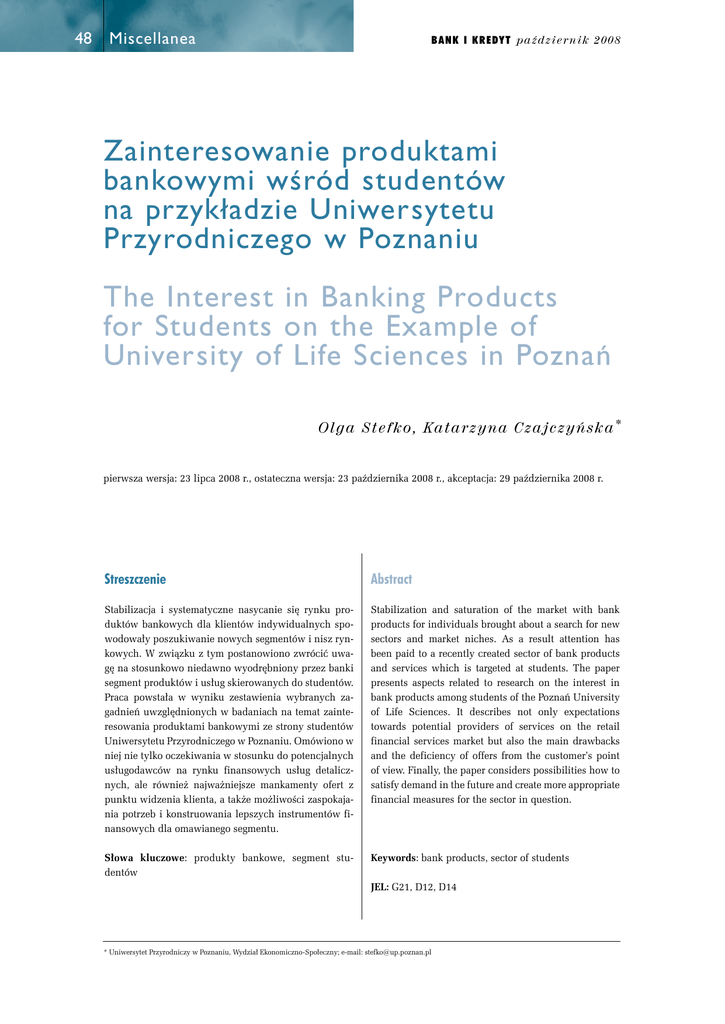 48 Produkty Miscellanea i Techniki Bankowe Bank i Kredyt październik 2008 Zainteresowanie produktami bankowymi wÊród studentów na przykładzie Uniwersytetu Przyrodniczego w Poznaniu The Interest in Banking Products for Students on the Example of University of Life Sciences in Poznaƒ Olga Stefko, Katarzyna Czajczyńska * pierwsza wersja: 23 lipca 2008 r., ostateczna wersja: 23 października 2008 r., akceptacja: 29 października 2008 r. Streszczenie Abstract Stabilizacja i systematyczne nasycanie się rynku produktów bankowych dla klientów indywidualnych spowodowały poszukiwanie nowych segmentów i nisz rynkowych. W związku z tym postanowiono zwrócić uwagę na stosunkowo niedawno wyodrębniony przez banki segment produktów i usług skierowanych do studentów. Praca powstała w wyniku zestawienia wybranych zagadnień uwzględnionych w badaniach na temat zainteresowania produktami bankowymi ze strony studentów Uniwersytetu Przyrodniczego w Poznaniu. Omówiono w niej nie tylko oczekiwania w stosunku do potencjalnych usługodawców na rynku finansowych usług detalicznych, ale również najważniejsze mankamenty ofert z punktu widzenia klienta, a także możliwości zaspokajania potrzeb i konstruowania lepszych instrumentów finansowych dla omawianego segmentu. Stabilization and saturation of the market with bank products for individuals brought about a search for new sectors and market niches. As a result attention has been paid to a recently created sector of bank products and services which is targeted at students. The paper presents aspects related to research on the interest in bank products among students of the Poznań University of Life Sciences. It describes not only expectations towards potential providers of services on the retail financial services market but also the main drawbacks and the deficiency of offers from the customer’s point of view. Finally, the paper considers possibilities how to satisfy demand in the future and create more appropriate financial measures for the sector in question. Słowa kluczowe: produkty bankowe, segment studentów Keywords: bank products, sector of students JEL: G21, D12, D14 * Uniwersytet Przyrodniczy w Poznaniu, Wydział Ekonomiczno-Społeczny; e-mail: [email protected] B a n k i K r e dy t p a ź d z i e r n i k 2 0 0 8 1. Wstęp Banki jako instytucje finansowe odgrywają coraz większą rolę w życiu gospodarczym i społecznym kraju. Te, które obsługują głównie przedsiębiorców, w dobie nasilającej się konkurencji coraz bardziej rozszerzają swoją ofertę również dla klientów indywidualnych, nieprowadzących działalności gospodarczej. Zachodzące zmiany dotyczą przede wszystkim rodzaju usług i produktów bankowych, jak również poszerzenia zakresu już istniejących instrumentów finansowych, co niejednokrotnie opisano w literaturze przedmiotu (m.in.: Grzegorczyk 2001; Janc 2001; Niczyporuk, Talecka 2004; Iwanicz-Drozdowska 2005; Dobosiewicz 2007). Powolne, ale systematyczne nasycanie się rynku produktów bankowych dla klientów indywidualnych spowodowało konieczność podjęcia działań innowacyjnych i poszukiwanie nowych segmentów i nisz rynkowych. W konsekwencji nastąpiło wiele zmian w środowisku bankowym przekładających się na liczne udogodnienia dla klientów, takie jak akceptowanie rozliczeń za pomocą kart płatniczych, wzrost liczby bankomatów, łatwiejszy dostęp do transakcji przez Internet (Kisiel, Korenik 2006). Mimo to, jak podaje Smaga (2007), posiadanie konta osobistego deklaruje jedynie 57% Polaków powyżej 15. roku życia, co stawia polską bankowość w bardzo niekorzystnej sytuacji w stosunku do reszty Europy. Z kont bankowych aktywnie korzysta 16% klientów. Są to głównie ludzie młodzi, w wieku od dwudziestu do trzydziestu kilku lat, mający wykształcenie na poziomie licencjatu i wyższe. Ze względu na te dane, jak również szybki rozwój usług świadczonych drogą internetową nie dziwi, że w poszukiwaniu nowych rozwiązań strategicznych banki zdecydowały się na wyodrębnienie segmentu: produktów i usług przeznaczonych dla studentów. Jest to interesująca i przyszłościowa grupa klientów. Obecnie w większość dorosłych osób w Polsce korzysta z usług przynajmniej jednego banku (Raport o produktach bankowych 2004). Założono więc, że dzięki dbałości o młodego klienta i jego potrzeby zdobędzie się jego lojalność także w przyszłości, kiedy być może znacznie wzrosną zarówno jego przychody, jak i możliwości alokacji posiadanych dóbr. Oferty bankowych usług dla studentów są zjawiskiem stosunkowo nowym i w bardzo małym stopniu omówionym w literaturze. Dlatego celem artykułu jest przeanalizowanie zakresu obecnie dostępnych ofert pod kątem zainteresowania nimi studentów i oceny trafności działań banków w celu pozyskania większej liczby klientów. Zebrane dane pozwoliły zestawić i porównać oferty banków kierowane do studentów, a także opinie studentów Uniwersytetu Przyrodniczego w Poznaniu na temat wykorzystywanych produktów bankowych. Poza rozdziałem „Proces badawczy”, w którym zaprezentowano metodykę badań, artykuł zawiera rów- Produkty i Techniki Bankowe Miscellanea 49 nież część poświęconą porównaniu bankowych ofert skierowanych do studentów z ich oczekiwaniami w stosunku do potencjalnych usługodawców na rynku finansowych usług detalicznych. W kolejnym rozdziale przedstawiono zainteresowanie produktami bankowymi wśród studentów. Rozważania zamyka rozdział, w którym wskazano najważniejsze mankamenty ofert z punktu widzenia klientów, jak również możliwości lepszego zaspokajania ich potrzeb i konstruowania instrumentów finansowych dla omawianego segmentu. 2. Proces badawczy Proces badawczy składał się z dwóch głównych części – skompletowania i porównania z sobą materiałów wtórnych oraz zebrania i analizy materiałów źródłowych. Analiza materiałów wtórnych miała prz