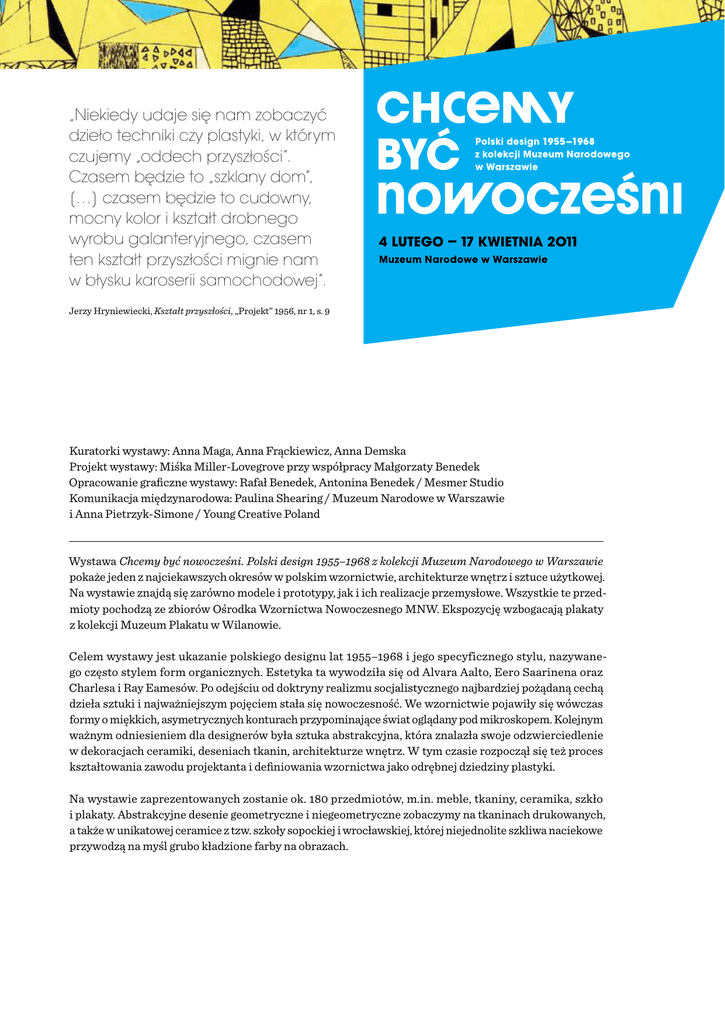 „Niekiedy udaje się nam zobaczyć dzieło techniki czy plastyki, w którym czujemy „oddech przyszłości”. Czasem będzie to „szklany dom”, […] czasem będzie to cudowny, mocny kolor i kształt drobnego wyrobu galanteryjnego, czasem ten kształt przyszłości mignie nam w błysku karoserii samochodowej”. Jerzy Hryniewiecki, Kształt przyszłości, „Projekt” 1956, nr 1, s. 9 Kuratorki wystawy: Anna Maga, Anna Frąckiewicz, Anna Demska Projekt wystawy: Miśka Miller-Lovegrove przy współpracy Małgorzaty Benedek Opracowanie graficzne wystawy: Rafał Benedek, Antonina Benedek / Mesmer Studio Komunikacja międzynarodowa: Paulina Shearing / Muzeum Narodowe w Warszawie i Anna Pietrzyk-Simone / Young Creative Poland Wystawa Chcemy być nowocześni. Polski design 1955–1968 z kolekcji Muzeum Narodowego w Warszawie pokaże jeden z najciekawszych okresów w polskim wzornictwie, architekturze wnętrz i sztuce użytkowej. Na wystawie znajdą się zarówno modele i prototypy, jak i ich realizacje przemysłowe. Wszystkie te przedmioty pochodzą ze zbiorów Ośrodka Wzornictwa Nowoczesnego MNW. Ekspozycję wzbogacają plakaty z kolekcji Muzeum Plakatu w Wilanowie. Celem wystawy jest ukazanie polskiego designu lat 1955–1968 i jego specyficznego stylu, nazywanego często stylem form organicznych. Estetyka ta wywodziła się od Alvara Aalto, Eero Saarinena oraz Charlesa i Ray Eamesów. Po odejściu od doktryny realizmu socjalistycznego najbardziej pożądaną cechą dzieła sztuki i najważniejszym pojęciem stała się nowoczesność. We wzornictwie pojawiły się wówczas formy o miękkich, asymetrycznych konturach przypominające świat oglądany pod mikroskopem. Kolejnym ważnym odniesieniem dla designerów była sztuka abstrakcyjna, która znalazła swoje odzwierciedlenie w dekoracjach ceramiki, deseniach tkanin, architekturze wnętrz. W tym czasie rozpoczął się też proces kształtowania zawodu projektanta i definiowania wzornictwa jako odrębnej dziedziny plastyki. Na wystawie zaprezentowanych zostanie ok. 180 przedmiotów, m.in. meble, tkaniny, ceramika, szkło i plakaty. Abstrakcyjne desenie geometryczne i niegeometryczne zobaczymy na tkaninach drukowanych, a także w unikatowej ceramice z tzw. szkoły sopockiej i wrocławskiej, której niejednolite szkliwa naciekowe przywodzą na myśl grubo kładzione farby na obrazach. Jedną z istotnych tendencji epoki była fascynacja nowymi tworzywami. Dzięki rozwijającej się technologii, która dawała projektantom nieosiągalne wcześniej możliwości kształtowania przedmiotu, można było tworzyć meble o wyrafinowanej formie z nowoczesnych mas plastycznych. W Polsce syntetyki były bardzo trudno dostępne, ale jednak kilku projektantom, m.in. Romanowi Modzelewskiemu czy Czesławowi Knothemu udało się, wbrew wszelkim przeciwnościom, stworzyć pod koniec lat 50. fotele i krzesła z tych materiałów (patrz zdjęcie). Roman Modzelewski, fotel, 1958 Najczęściej stosowanym substytutem materiałów syntetycznych była sklejka, która prowokowała do tworzenia różnego rodzaju form łupinowych, charakterystycznych dla stylistyki organicznej, dawała ogromne pole do eksperymentowania z konstrukcją mebla, a także pozwalała na tworzenie sprzętów niewielkich, lekkich, dostosowanych do bardzo ograniczonych przestrzeni ówczesnych mieszkań. W 2. połowie lat 50. powstało wiele takich krzeseł; kilka z nich, autorstwa m.in. Teresy Kruszewskiej, Marii Chomentowskiej czy Jana Kurzątkowskiego, będzie można zobaczyć na wystawie. Ważną częścią ekspozycji będą meble eksperymentalne – rzeźbiarskie konstrukcje tworzone z wykorzystaniem wikliny, siatki metalowej, stelaży z prętów wypełnionych sznurkiem, linką nylonową. Kolejnym zagadnieniem są nowatorskie jak na owe czasy, często niezwykle udane, projekty urządzeń technicznych, takich jak aparat fotograficzny czy telefoniczny. Na wystawie zostaną także pokazane dwa fragmenty wnętrz. Pierwsze zaprojektowane zostało w 1. połowie lat 60. XX wieku przez Mariana Sigmunda; jest to umeblowany pokój mieszkalny, który uzupełniony zostanie o tkaniny i ceramikę. Wnętrze przetrwało do naszych czasów bez żadnym zmian, co stwarza wyjątkową możliwość odtworzenia autentycznego wystroju. Drugie urządzone jest modnymi sprzętami z końca lat 50., takimi jak np. meble i lampy z metalu i tworzyw sztucznych. Ekspozycję wzbogacą liczne materiały dokumentacyjne – fotosy i fragmenty z ówczesnych filmów, plakaty i okładki czasopism, powiększenia fotografii archiwalnych, przedstawiających przedmioty, wystawy, wnętrza mieszkalne i użyteczności publicznej. Ważnym elementem wystawy będzie czasopismo „Projekt” pokazujące najpełniej zainteresowania, osiągnięcia i tendencje epoki. Prezentowane na wystawie prace powstały w różnych ośrodkach, takich jak: Instytut Wzornictwa Przemysłowego w Warszawie, Zakłady Artystyczno-Badawcze Akademii Sztuk Pięknych w Warszawie, Spółdzielnia Artystów „Ład”, PWSSP we Wrocławiu, PWSSP w Sopocie, zakłady przemysłowe (fabryki ceramiki we Włocławku, Ćmielowie, Pruszkowie, fabryka mebli w Jasienicy). Wystawie towarzyszyć będzie polsko-angielska ilustrowana publikacja. Wystawa została zorganizowana we współpracy z Young Creative Poland, która jest inicjatywą Miśki Miller-Lovegrove i Anny Pietrzyk-Simone mającą na celu promocję polskiego designu. Szczegółowy program imprez towarzyszących wystawie (spotkania i warsztaty z projektantami, projekcje filmowe, spotkania muzyczne) znajdą Państwo na stronie: www.mnw.art.pl Zdjęcia do pobrania pod adresem: ftp://ftp.mnw.art.pl login: prasa hasło: mnw138 folder: design