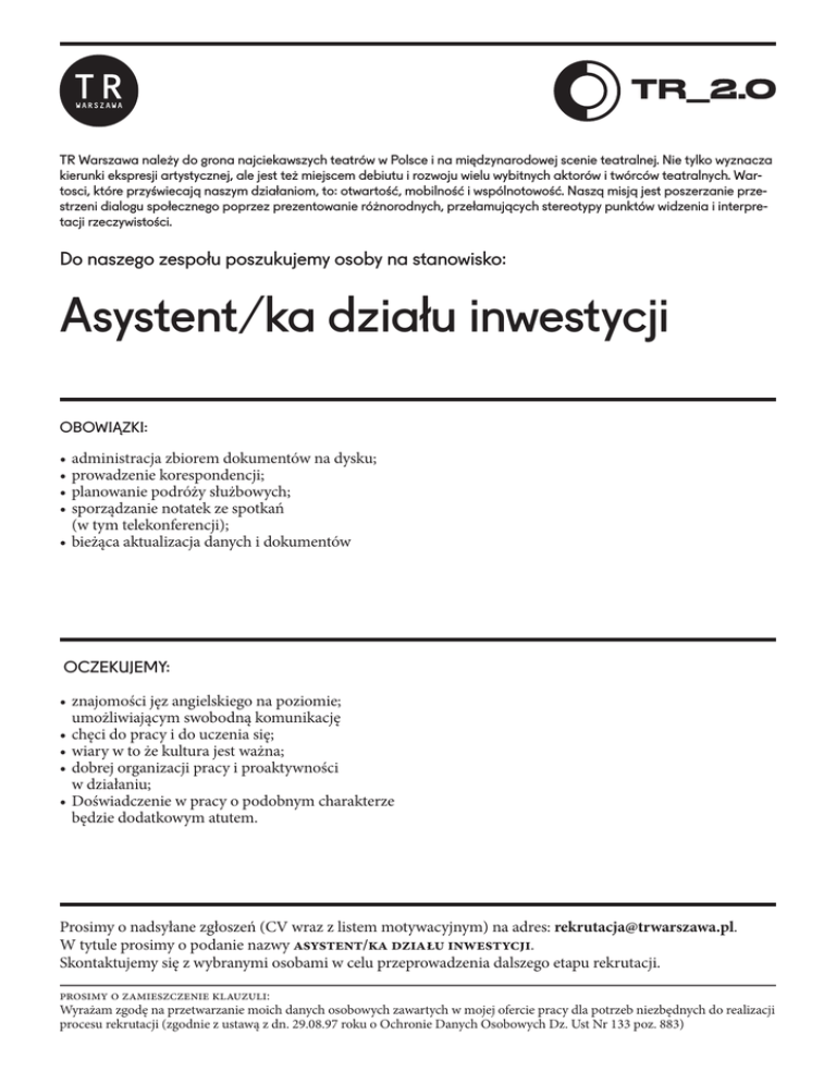 TR Warszawa należy do grona najciekawszych teatrów w Polsce i na międzynarodowej scenie teatralnej. Nie tylko wyznacza kierunki ekspresji artystycznej, ale jest też miejscem debiutu i rozwoju wielu wybitnych aktorów i twórców teatralnych. Wartosci, które przyświecają naszym działaniom, to: otwartość, mobilność i wspólnotowość. Naszą misją jest poszerzanie przestrzeni dialogu społecznego poprzez prezentowanie różnorodnych, przełamujących stereotypy punktów widzenia i interpretacji rzeczywistości. Do naszego zespołu poszukujemy osoby na stanowisko: Asystent/ka działu inwestycji Obowiązki: • administracja zbiorem dokumentów na dysku; • prowadzenie korespondencji; • planowanie podróży służbowych; • sporządzanie notatek ze spotkań (w tym telekonferencji); • bieżąca aktualizacja danych i dokumentów Oczekujemy: • znajomości jęz angielskiego na poziomie; umożliwiającym swobodną komunikację • chęci do pracy i do uczenia się; • wiary w to że kultura jest ważna; • dobrej organizacji pracy i proaktywności w działaniu; • Doświadczenie w pracy o podobnym charakterze będzie dodatkowym atutem. Prosimy o nadsyłane zgłoszeń (CV wraz z listem motywacyjnym) na adres: [email protected]. W tytule prosimy o podanie nazwy asystent/ka działu inwestycji. Skontaktujemy się z wybranymi osobami w celu przeprowadzenia dalszego etapu rekrutacji. prosimy o zamieszczenie klauzuli: Wyrażam zgodę na przetwarzanie moich danych osobowych zawartych w mojej ofercie pracy dla potrzeb niezbędnych do realizacji procesu rekrutacji (zgodnie z ustawą z dn. 29.08.97 roku o Ochronie Danych Osobowych Dz. Ust Nr 133 poz. 883)