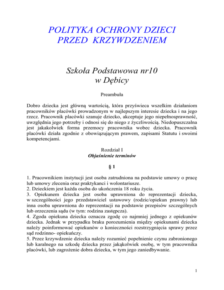 POLITYKA OCHRONY DZIECI PRZED KRZYWDZENIEM Szkoła Podstawowa nr10 w Dębicy Preambuła Dobro dziecka jest główną wartością, która przyświeca wszelkim działaniom pracowników placówki prowadzonym w najlepszym interesie dziecka i na jego rzecz. Pracownik placówki szanuje dziecko, akceptuje jego niepełnosprawność, uwzględnia jego potrzeby i odnosi się do niego z życzliwością. Niedopuszczalna jest jakakolwiek forma przemocy pracownika wobec dziecka. Pracownik placówki działa zgodnie z obowiązującym prawem, zapisami Statutu i swoimi kompetencjami. Rozdział I Objaśnienie terminów §1 1. Pracownikiem instytucji jest osoba zatrudniona na podstawie umowy o pracę lub umowy zlecenia oraz praktykanci i wolontariusze. 2. Dzieckiem jest każda osoba do ukończenia 18 roku życia. 3. Opiekunem dziecka jest osoba uprawniona do reprezentacji dziecka, w szczególności jego przedstawiciel ustawowy (rodzic/opiekun prawny) lub inna osoba uprawniona do reprezentacji na podstawie przepisów szczególnych lub orzeczenia sądu (w tym: rodzina zastępcza). 4. Zgoda opiekuna dziecka oznacza zgodę co najmniej jednego z opiekunów dziecka. Jednak w przypadku braku porozumienia między opiekunami dziecka należy poinformować opiekunów o konieczności rozstrzygnięcia sprawy przez sąd rodzinno- opiekuńczy. 5. Przez krzywdzenie dziecka należy rozumieć popełnienie czynu zabronionego lub karalnego na szkodę dziecka przez jakąkolwiek osobę, w tym pracownika placówki, lub zagrożenie dobra dziecka, w tym jego zaniedbywanie. 1 6. Osoba odpowiedzialna za Internet to wyznaczony przez dyrektora instytucji pracownik, sprawujący nadzór nad korzystaniem z Internetu przez dzieci na terenie instytucji oraz nad bezpieczeństwem dzieci w Internecie. 7. Osoba odpowiedzialna za Politykę ochrony dzieci to wyznaczony przez dyrektora instytucji pracownik sprawujący nadzór nad realizacją Polityki ochrony dzieci w szkole. 8. Dane osobowe dziecka to każda informacja umożliwiająca identyfikację dziecka. Rozdział II Rozpoznawanie i reagowanie na czynniki ryzyka krzywdzenia dzieci §1 1. Pracownicy placówki posiadają wiedzę i w ramach wykonywanych obowiązków zwracają uwagę na czynniki ryzyka krzywdzenia dzieci. 2. W przypadku zidentyfikowania czynników ryzyka, pracownicy placówki podejmują rozmowę z rodzicami, przekazując informacje na temat dostępnej oferty wsparcia i motywując ich do szukania dla siebie pomocy. 3. Pracownicy monitorują sytuację i dobrostan dziecka poprzez rozmowy monitorujące z dzieckiem, rodzicem i obserwację dziecka. Rozdział III Procedury interwencji w przypadku krzywdzenia dziecka §1 W przypadku podjęcia przez pracownika instytucji podejrzenia, że dziecko jest krzywdzone, pracownik ma obowiązek sporządzenia notatki służbowej i przekazania uzyskanej informacji pedagogowi szkolnemu lub dyrektorowi placówki. §2 1. Pedagog wzywa opiekunów dziecka, którego krzywdzenie podejrzewa oraz informuje ich o podejrzeniu. 2. Pedagog sporządza opis sytuacji rodzinnej dziecka na podstawie rozmów z dzieckiem, nauczycielami, wychowawcą i rodzicami oraz plan pomocy dziecku. 3. Plan pomocy dziecku powinien zawierać wskazania dotyczące: a) podjęcia przez instytucję działań w celu zapewnienia dziecku bezpieczeństwa, w tym zgłoszenie podejrzenia krzywdzenia do odpowiedniej instytucji; b) wsparcia, jakie placówka zaoferuje dziecku; c) skierowania dziecka do specjalistycznej placówki pomocy dziecku, jeżeli istnieje taka potrzeba. 2 W przypadku ustalenia krzywdzenia dziecka przez pracownika, po wyjaśnieniach, zastosowane mogą być przez dyrektora środki dyscyplinarne (pracownicy pedagogiczni) lub przewidziane w Kodeksie Pracy (pracownicy pozostali). Jeżeli istnieje podejrzenie, że pracownik szkoły popełnił na szkodę dziecka przestępstwo, po rozpatrzeniu sprawy, dyrektor zobowiązany jest do niezwłocznego zawiadomienia o powyższym Policji lub prokuratury. W przypadku krzywdzenia ucznia przez inne dziecko na terenie szkoły lub poza nią, pracownik szkoły, który był świadkiem zdarzenia lub pozyskał informację o powyższym, zobowiązany jest poinformować o zdarzeniu wychowawcę lub pedagoga. W razie konieczności udzielenia pomocy medycznej, niezwłocznie zawiadamia pielęgniarkę szkolną oraz dyrektora szkoły. Wyjaśnienia dotyczące sytuacji uzyskuje się z rozmowy z poszkodowanym, ofiarą i świadkiem. W powyższych przepadkach stosuje się procedurę z § 1. §3 1. W przypadkach bardziej skomplikowanych (dotyczących wykorzystywania seksualnego oraz znęcania się fizycznego i psychicznego o dużym nasileniu) dyrektor powołuje zespół interwencyjny, w skład którego mogą wejść: pedagog/psycholog, wychowawca dziecka, dyrektor, inni pracownicy mający wiedzę o krzywdzeniu dziecka lub o dziecku (dalej jako: zespół interwencyjny). 2. Zespół interwencyjny sporządza plan pomocy dziecku, spełniający wymogi określone w §2 pkt 3 Polityki, na podstawie opisu sporządzonego przez pedagoga szkolnego oraz innych, uzyskanych przez członków zespołu, informacji. 3. W przypadku, gdy podejrzenie krzywdzenia zgłosili opiekunowie dziecka, powołanie zespołu jest obligatoryjne. Zespół interwencyjny wzywa opiekunów dziecka na spotkanie wyjaśniające, podczas którego może zaproponować opiekunom zdiagnozowanie zgłaszanego podejrzenia w zewnętrznej, bezstronnej instytucji. Ze spotkania sporządza się protokół. §4 1. Plan pomocy dziecku jest przedstawiany przez pedagoga/psychologa rodzicom/opiekunom z zaleceniem współpracy przy jego realizacji. 2. Pedagog/psycholog informuje rodziców/opiekunów o obowiązku placówki zgłoszenia podejrzenia krzywdzenia dziecka do odpowiedniej instytucji (prokuratura/policja lub sąd rodzinno-opiekuńczy, lub przewodniczący zespołu interdyscyplinarnego – procedura („Niebieskie Karty”). 3. Po poinformowaniu rodziców przez pedagoga/psychologa – zgodnie z punktem poprzedzającym –