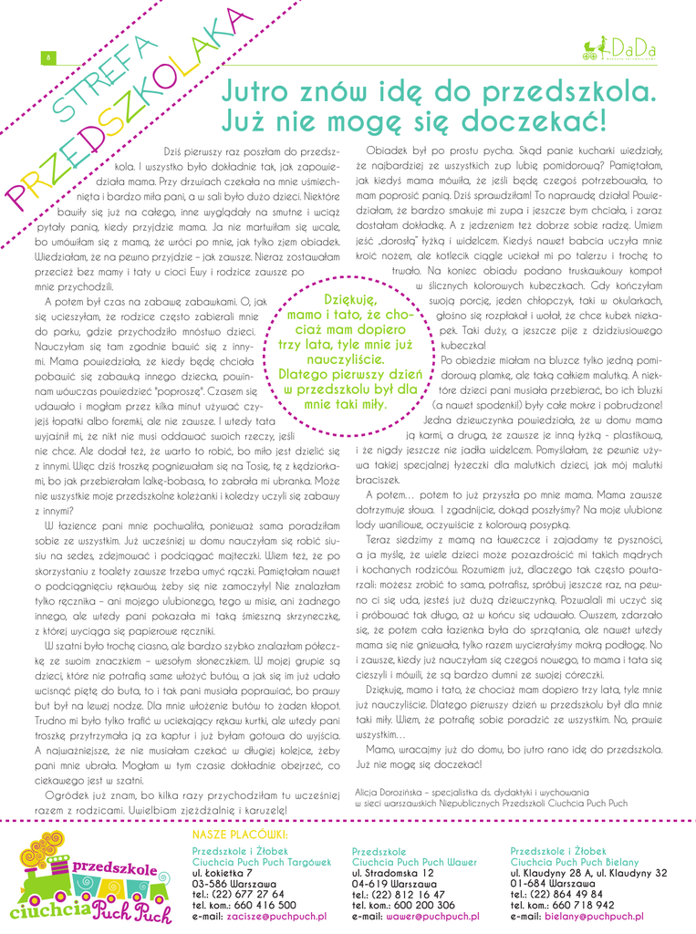 A K FA LA RE KO Jutro znów idę do przedszkola. T Z S Już nie mogę się doczekać! S D E Z R P 8 Obiadek był po prostu pycha. Skąd panie kucharki wiedziały, Dziś pierwszy raz poszłam do przedszże najbardziej ze wszystkich zup lubię pomidorową? Pamiętałam, kola. I wszystko było dokładnie tak, jak zapowiejak kiedyś mama mówiła, że jeśli będę czegoś potrzebowała, to działa mama. Przy drzwiach czekała na mnie uśmiechmam poprosić panią. Dziś sprawdziłam! To naprawdę działa! Powienięta i bardzo miła pani, a w sali było dużo dzieci. Niektóre działam, że bardzo smakuje mi zupa i jeszcze bym chciała, i zaraz bawiły się już na całego, inne wyglądały na smutne i wciąż dostałam dokładkę. A z jedzeniem też dobrze sobie radzę. Umiem pytały panią, kiedy przyjdzie mama. Ja nie martwiłam się wcale, jeść „dorosłą” łyżką i widelcem. Kiedyś nawet babcia uczyła mnie bo umówiłam się z mamą, że wróci po mnie, jak tylko zjem obiadek. kroić nożem, ale kotlecik ciągle uciekał mi po talerzu i trochę to Wiedziałam, że na pewno przyjdzie – jak zawsze. Nieraz zostawałam trwało. Na koniec obiadu podano truskawkowy kompot przecież bez mamy i taty u cioci Ewy i rodzice zawsze po w ślicznych kolorowych kubeczkach. Gdy kończyłam mnie przychodzili. Dziękuję, swoją porcję, jeden chłopczyk, taki w okularkach, A potem był czas na zabawę zabawkami. O, jak mamo i tato, że chogłośno się rozpłakał i wołał, że chce kubek niekasię ucieszyłam, że rodzice często zabierali mnie ciaż mam dopiero pek. Taki duży, a jeszcze pije z dzidziusiowego do parku, gdzie przychodziło mnóstwo dzieci. trzy lata, tyle mnie już kubeczka! Nauczyłam się tam zgodnie bawić się z innynauczyliście. Po obiedzie miałam na bluzce tylko jedną pomimi. Mama powiedziała, że kiedy będę chciała Dlatego pierwszy dzień dorową plamkę, ale taką całkiem malutką. A niekpobawić się zabawką innego dziecka, powinw przedszkolu był dla tóre dzieci pani musiała przebierać, bo ich bluzki nam wówczas powiedzieć "poproszę". Czasem się mnie taki miły. (a nawet spodenki!) były całe mokre i pobrudzone! udawało i mogłam przez kilka minut używać czyJedna dziewczynka powiedziała, że w domu mama jejś łopatki albo foremki, ale nie zawsze. I wtedy tata ją karmi, a druga, że zawsze je inną łyżką - plastikową, wyjaśnił mi, że nikt nie musi oddawać swoich rzeczy, jeśli i że nigdy jeszcze nie jadła widelcem. Pomyślałam, że pewnie użynie chce. Ale dodał też, że warto to robić, bo miło jest dzielić się wa takiej specjalnej łyżeczki dla malutkich dzieci, jak mój malutki z innymi. Więc dziś troszkę pogniewałam się na Tosię, tę z kędziorkabraciszek. mi, bo jak przebierałam lalkę-bobasa, to zabrała mi ubranka. Może A potem… potem to już przyszła po mnie mama. Mama zawsze nie wszystkie moje przedszkolne koleżanki i koledzy uczyli się zabawy dotrzymuje słowa. I zgadnijcie, dokąd poszłyśmy? Na moje ulubione z innymi? lody waniliowe, oczywiście z kolorową posypką. W łazience pani mnie pochwaliła, ponieważ sama poradziłam Teraz siedzimy z mamą na ławeczce i zajadamy te pyszności, sobie ze wszystkim. Już wcześniej w domu nauczyłam się robić siua ja myślę, że wiele dzieci może pozazdrościć mi takich mądrych siu na sedes, zdejmować i podciągać majteczki. Wiem też, że po i kochanych rodziców. Rozumiem już, dlaczego tak często powtaskorzystaniu z toalety zawsze trzeba umyć rączki. Pamiętałam nawet rzali: możesz zrobić to sama, potrafisz, spróbuj jeszcze raz, na pewo podciągnięciu rękawów, żeby się nie zamoczyły! Nie znalazłam no ci się uda, jesteś już dużą dziewczynką. Pozwalali mi uczyć się tylko ręcznika – ani mojego ulubionego, tego w misie, ani żadnego i próbować tak długo, aż w końcu się udawało. Owszem, zdarzało innego, ale wtedy pani pokazała mi taką śmieszną skrzyneczkę, się, że potem cała łazienka była do sprzątania, ale nawet wtedy z której wyciąga się papierowe ręczniki. mama się nie gniewała, tylko razem wycierałyśmy mokrą podłogę. No W szatni było trochę ciasno, ale bardzo szybko znalazłam półeczi zawsze, kiedy już nauczyłam się czegoś nowego, to mama i tata się kę ze swoim znaczkiem – wesołym słoneczkiem. W mojej grupie są cieszyli i mówili, że są bardzo dumni ze swojej córeczki. dzieci, które nie potrafią same włożyć butów, a jak się im już udało Dziękuję, mamo i tato, że chociaż mam dopiero trzy lata, tyle mnie wcisnąć piętę do buta, to i tak pani musiała poprawiać, bo prawy już nauczyliście. Dlatego pierwszy dzień w przedszkolu był dla mnie but był na lewej nodze. Dla mnie włożenie butów to żaden kłopot. taki miły. Wiem, że potrafię sobie poradzić ze wszystkim. No, prawie Trudno mi było tylko trafić w uciekający rękaw kurtki, ale wtedy pani wszystkim… troszkę przytrzymała ją za kaptur i już byłam gotowa do wyjścia. Mamo, wracajmy już do domu, bo jutro rano idę do przedszkola. A najważniejsze, że nie musiałam czekać w długiej kolejce, żeby Już nie mogę się doczekać! pani mnie ubrała. Mogłam w tym czasie dokładnie obejrzeć, co ciekawego jest w szatni. Ogródek już znam, bo kilka razy przychodziłam tu wcześniej razem z rodzicami. Uwielbiam zjeżdżalnię i karuzelę! Alicja Dorozińska – specjalistka ds. dydaktyki i wychowania w sieci warszawskich Niepublicznych Przedszkoli Ciuchcia Puch Puch NASZE PLACÓWKI: Przedszkole i Żłobek Ciuchcia Puch Puch Targówek ul. Łokietka 7 03-586 Warszawa tel.: (22) 677 27 64 tel. kom.: 660 416 500 e-mail: [email protected] Przedszkole Ciuchcia Puch Puch Wawer ul. Stradomska 12 04-619 Warszawa tel.: (22) 812 16 47 tel. kom.: 600 200 306 e-mail: [email protected] Przedszkole i Żłobek Ciuchcia Puch Puch Bielany ul. Klaudyny 28 A, ul. Klaudyny 32 01-684 Warszawa tel.: (22) 864 49 84 tel. 