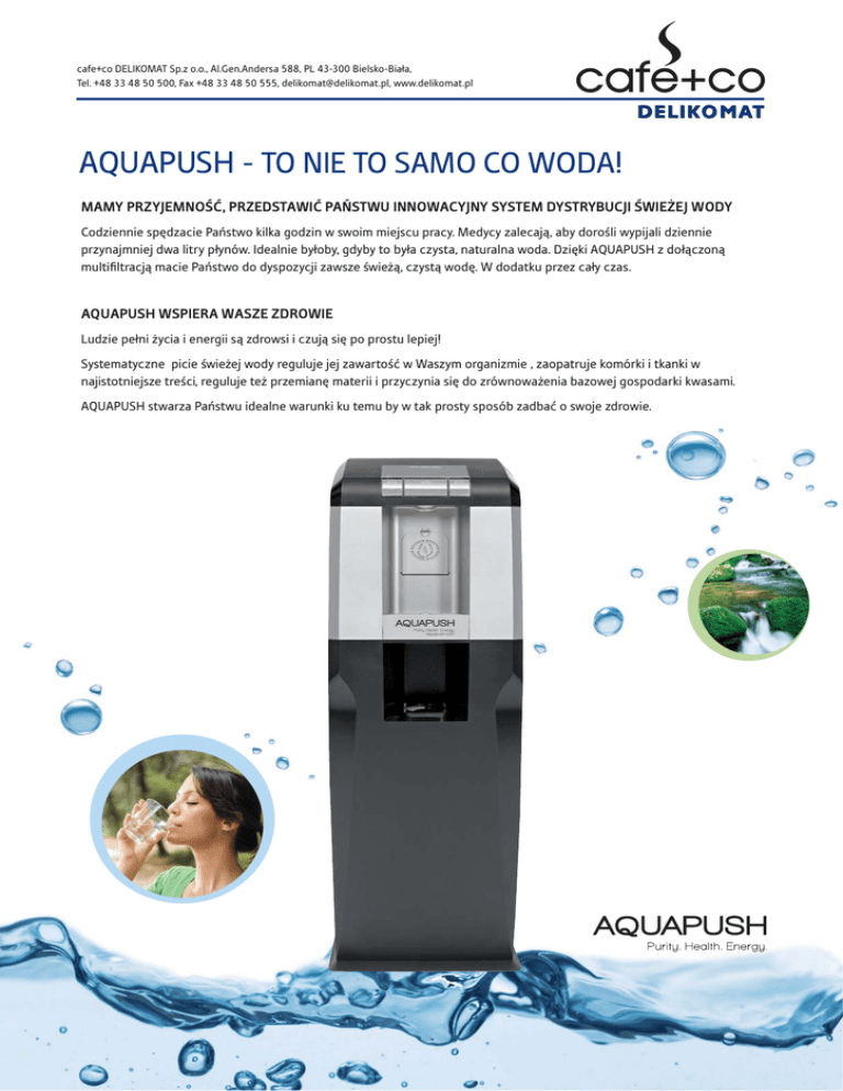 cafe+co DELIKOMAT Sp.z o.o., Al.Gen.Andersa 588, PL 43-300 Bielsko-Biała, Tel. +48 33 48 50 500, Fax +48 33 48 50 555, [email protected], www.delikomat.pl AQUAPUSH - TO NIE TO SAMO CO WODA! MAMY PRZYJEMNOŚĆ, PRZEDSTAWIĆ PAŃSTWU INNOWACYJNY SYSTEM DYSTRYBUCJI ŚWIEŻEJ WODY Codziennie spędzacie Państwo kilka godzin w swoim miejscu pracy. Medycy zalecają, aby dorośli wypijali dziennie przynajmniej dwa litry płynów. Idealnie byłoby, gdyby to była czysta, naturalna woda. Dzięki AQUAPUSH z dołączoną multifiltracją macie Państwo do dyspozycji zawsze świeżą, czystą wodę. W dodatku przez cały czas. AQUAPUSH WSPIERA WASZE ZDROWIE Ludzie pełni życia i energii są zdrowsi i czują się po prostu lepiej! Systematyczne picie świeżej wody reguluje jej zawartość w Waszym organizmie , zaopatruje komórki i tkanki w najistotniejsze treści, reguluje też przemianę materii i przyczynia się do zrównoważenia bazowej gospodarki kwasami. AQUAPUSH stwarza Państwu idealne warunki ku temu by w tak prosty sposób zadbać o swoje zdrowie. cafe+co DELIKOMAT Sp.z o.o., Al.Gen.Andersa 588, PL 43-300 Bielsko-Biała, Tel. +48 33 48 50 500, Fax +48 33 48 50 555, [email protected], www.delikomat.pl AQUAPUSH TO WIĘKSZE MOŻLIWOŚCI Woda dostarcza siły i energii i – co udowodniono – podnosi Waszą wydajność. Ten eliksir życia jest lepszym środkiem pobudzającym niż jakikolwiek inny napój. Wiadomo, że niedostateczna ilość świeżej wody prowadzi do negatywnych oddziaływań na Wasze zdrowie i osobiste samopoczucie. AQUAPUSH dostarcza energii każdego dnia ! AQUAPUSH JEST DODATKOWĄ WARTOŚCIĄ DLA PRZEDSIĘBIORSTWA, WSPÓŁPRACOWNIKÓW I ŚRODOWISKA NATURALNEGO. Dzięki stałemu podłączeniu wody AQUAPUSH , zbędne stają się kosztowne i czasochłonne działania przy zamówieniu, składowaniu i transporcie butelek z wodą, względnie galonów. Dzięki starannemu obchodzeniu się z wodą za pomocą AQUAPUSH jesteście Państwo odpowiedzialni za środowisko naturalne. DANE TECHNICZNE dwustopniowa filtracja wody (filtracja za pomocą węgla aktywnego i technologii UV) możliwość regulacji temperatury (3 – 12 °C) Wydajność chłodzenia na godzinę: ca. 36l Wymiary: szer. 41,8 cm / wys. 123,8 cm / głęb.47 cm Okres serwisowania lampy UV i filtrów z węglem aktywnym: 12 miesięcy Zasilanie elektryczne: 230V/50Hz – 200W Podłączenie wody 3/8 cali, maks. 5 barów, możliwość odcięcia z zewnątrz Na przycisku 3 różne warianty napojów: Hot-woda gorąca / Cool – woda zwykła, schłodzona / Sparkling – woda gazowana, schłodzona Wyposażenie dodatkowe: Filtr z aktywnym węglem wzbogaca wodę i filtruje zanieczyszczenia o średnicy pow. 10 μm, Lampa UV Szczególnie dobra przydatność do napełniania butelek i dzbanków. Zapewniamy bieżący serwis urządzeń. Świeża woda z AQUAPUSH cenna jest nie tylko dla Państwa i Waszych współpracowników – ma ona wiele zalet także dla Waszego przedsiębiorstwa. Oszczędzicie Państwo czas, pieniądze i miejsce.