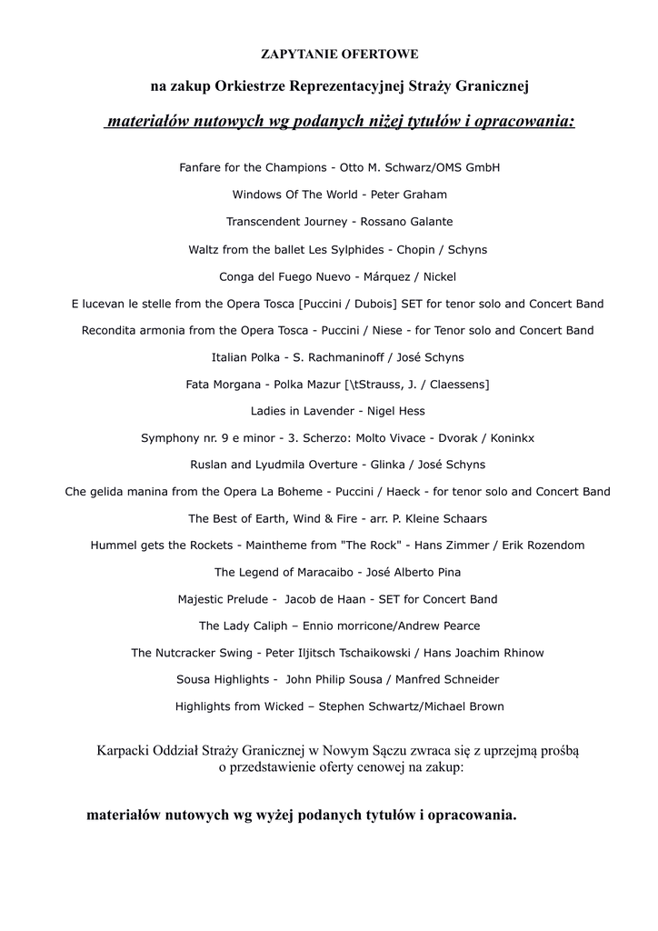 ZAPYTANIE OFERTOWE na zakup Orkiestrze Reprezentacyjnej Straży Granicznej materiałów nutowych wg podanych niżej tytułów i opracowania: Fanfare for the Champions - Otto M. Schwarz/OMS GmbH Windows Of The World - Peter Graham Transcendent Journey - Rossano Galante Waltz from the ballet Les Sylphides - Chopin / Schyns Conga del Fuego Nuevo - Márquez / Nickel E lucevan le stelle from the Opera Tosca [Puccini / Dubois] SET for tenor solo and Concert Band Recondita armonia from the Opera Tosca - Puccini / Niese - for Tenor solo and Concert Band Italian Polka - S. Rachmaninoff / José Schyns Fata Morgana - Polka Mazur [\tStrauss, J. / Claessens] Ladies in Lavender - Nigel Hess Symphony nr. 9 e minor - 3. Scherzo: Molto Vivace - Dvorak / Koninkx Ruslan and Lyudmila Overture - Glinka / José Schyns Che gelida manina from the Opera La Boheme - Puccini / Haeck - for tenor solo and Concert Band The Best of Earth, Wind & Fire - arr. P. Kleine Schaars Hummel gets the Rockets - Maintheme from "The Rock" - Hans Zimmer / Erik Rozendom The Legend of Maracaibo - José Alberto Pina Majestic Prelude - Jacob de Haan - SET for Concert Band The Lady Caliph – Ennio morricone/Andrew Pearce The Nutcracker Swing - Peter Iljitsch Tschaikowski / Hans Joachim Rhinow Sousa Highlights - John Philip Sousa / Manfred Schneider Highlights from Wicked – Stephen Schwartz/Michael Brown Karpacki Oddział Straży Granicznej w Nowym Sączu zwraca się z uprzejmą prośbą o przedstawienie oferty cenowej na zakup: materiałów nutowych wg wyżej podanych tytułów i opracowania. a.) Termin realizacji – do 30 grudnia 2016r. b.) Warunki płatności – przelew 7 dni c.) Termin składania ofert – do 19 grudnia 2016r. do godz.10.00 d.) o wyborze oferty decydować będzie najniższa cena całości zamówienia e.) Oferty należy składać na adres poczty internetowej: [email protected] lub pisemnie na nr FAX 18 415 37 23 f.) Zamawiający – Karpacki Oddział Straży Granicznej w Nowym Sączu, ul I Pułku Strzelców Podhalańskich 5 , 33-300 Nowy Sącz ( tel.kontaktowy 18 415 31 32, 501-158-184)