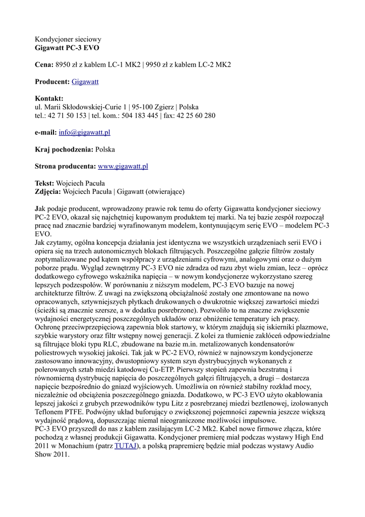 Kondycjoner sieciowy Gigawatt PC-3 EVO Cena: 8950 zł z kablem LC-1 MK2 | 9950 zł z kablem LC-2 MK2 Producent: Gigawatt Kontakt: ul. Marii Skłodowskiej-Curie 1 | 95-100 Zgierz | Polska tel.: 42 71 50 153 | tel. kom.: 504 183 445 | fax: 42 25 60 280 e-mail: [email protected] Kraj pochodzenia: Polska Strona producenta: www.gigawatt.pl Tekst: Wojciech Pacuła Zdjęcia: Wojciech Pacuła | Gigawatt (otwierające) Jak podaje producent, wprowadzony prawie rok temu do oferty Gigawatta kondycjoner sieciowy PC-2 EVO, okazał się najchętniej kupowanym produktem tej marki. Na tej bazie zespół rozpoczął pracę nad znacznie bardziej wyrafinowanym modelem, kontynuującym serię EVO – modelem PC-3 EVO. Jak czytamy, ogólna koncepcja działania jest identyczna we wszystkich urządzeniach serii EVO i opiera się na trzech autonomicznych blokach filtrujących. Poszczególne gałęzie filtrów zostały zoptymalizowane pod kątem współpracy z urządzeniami cyfrowymi, analogowymi oraz o dużym poborze prądu. Wygląd zewnętrzny PC-3 EVO nie zdradza od razu zbyt wielu zmian, lecz – oprócz dodatkowego cyfrowego wskaźnika napięcia – w nowym kondycjonerze wykorzystano szereg lepszych podzespołów. W porównaniu z niższym modelem, PC-3 EVO bazuje na nowej architekturze filtrów. Z uwagi na zwiększoną obciążalność zostały one zmontowane na nowo opracowanych, sztywniejszych płytkach drukowanych o dwukrotnie większej zawartości miedzi (ścieżki są znacznie szersze, a w dodatku posrebrzone). Pozwoliło to na znaczne zwiększenie wydajności energetycznej poszczególnych układów oraz obniżenie temperatury ich pracy. Ochronę przeciwprzepięciową zapewnia blok startowy, w którym znajdują się iskierniki plazmowe, szybkie warystory oraz filtr wstępny nowej generacji. Z kolei za tłumienie zakłóceń odpowiedzialne są filtrujące bloki typu RLC, zbudowane na bazie m.in. metalizowanych kondensatorów poliestrowych wysokiej jakości. Tak jak w PC-2 EVO, również w najnowszym kondycjonerze zastosowano innowacyjny, dwustopniowy system szyn dystrybucyjnych wykonanych z polerowanych sztab miedzi katodowej Cu-ETP. Pierwszy stopień zapewnia bezstratną i równomierną dystrybucję napięcia do poszczególnych gałęzi filtrujących, a drugi – dostarcza napięcie bezpośrednio do gniazd wyjściowych. Umożliwia on również stabilny rozkład mocy, niezależnie od obciążenia poszczególnego gniazda. Dodatkowo, w PC-3 EVO użyto okablowania lepszej jakości z grubych przewodników typu Litz z posrebrzanej miedzi beztlenowej, izolowanych Teflonem PTFE. Podwójny układ buforujący o zwiększonej pojemności zapewnia jeszcze większą wydajność prądową, dopuszczając niemal nieograniczone możliwości impulsowe. PC-3 EVO przyszedł do nas z kablem zasilającym LC-2 Mk2. Kabel nowe firmowe złącza, które pochodzą z własnej produkcji Gigawatta. Kondycjoner premierę miał podczas wystawy High End 2011 w Monachium (patrz TUTAJ), a polską prapremierę będzie miał podczas wystawy Audio Show 2011. Testowanie produktów związanych z siecią obarczone jest swego rodzaju „grzechem” pierworodnym – każda instalacja domowa i każdy zasilany system reaguje na filtry (a tym produkty o których mówię są) w nieco inny sposób. Nie ma możliwości, żeby posłuchać, jak wpływają na dźwięk w systemie „idealnym”, czy chociażby „reprezentatywnym”, bo takiego nie ma. Dlatego testując je trzeba się opierać na tym, co słychać w systemie odniesienia, systemie recenzenta. Dlatego też w przypadku produktów „sieciowych” tak ważny jest samodzielny odsłuch w swoim systemie i weryfikacja tego, co recenzentowi udało się ustalić w czasie testu. Mimo to są pewne cechy, które występują zawsze i wszędzie i założywszy, że w instalacji domowej nie ma poważniejszych błędów, że urządzenia audio są wysokiej klasy, można na nie wskazać jako na te, które konstytuują zmiany w dźwięku wnoszone przez kabel czy kondycjoner. Równie ważny jest punkt odniesienia. Najprostszą metodą badania kondycjonera , takiego jak PC-3 EVO jest wpięcie kabla danego urządzenia bezpośrednio do gniazdka ściennego, a potem do kondycjonera (a kabel sieciowy tego ostatniego do tego samego gniazdka w ścianie). Można to zrobić i w pewnym sensie będzie to uprawomocnione. Kumulacja różnych testów, doświadczeń i wiedzy mówi mi jednak, że będzie to porównanie wadliwe, bo różnica będzie duża, ale nieprzewidywalna. Często bowiem uwypukla problemy z samym systemem, przerzucane automatycznie na kondycjoner. Dlatego wolę porównywać elementy sieciowe z innymi elementami. W tym przypadku rzecz idzie o bardzo wyrafinowany zestaw. Porównanie przeprowadziłem z głównymi urządzeniami mojego systemu, tj. odtwarzaczem CD, przedwzmacniaczem i wzmacniaczem mocy. A bezpośrednim punktem odniesienia były dwa systemy zasilające, oparte na kablach sieciowych i listwach: • listwa sieciowa Acoustic Revive RTP-4eu Ultimate (18 000 zł; recenzja TUTAJ) + kabel sieciowy Acrolink Mexcel 7N-PC9300 (21 900 zł/2 m; recenzja TUTAJ), • listwa sieciowa Oyaide MTS-4e (2900 zł) + kabel sieciowy Tunami GPX-Re (2590 zł). Obydwa, a także Gigawatt wpięte były do gniazdka Furutecha FT-SWS (patrz TUTAJ). Do gniazdka napięcie doprowadzane jest dedykowaną linią, kablem Oyaide Tunami, z bezpiecznikiem sieciowym firmy AHP. Do tej pory testowaliśmy następujące produkty Gigawatta: • Kondycjoner sieciowy AC + kabel sieciowy AC PC-2 EVO + LS-1 + LC-2 mkII + LC-1 mkII; test TUTAJ • Listwa sieciowa PF-2; test TUTAJ, Nagroda Roku 2008; uzasadnienie TUTAJ • Listwa sieciowa PF-1 (w systemie), test TUTAJ • Kondycjoner sieciowy PC-4, test TUTAJ; Nagroda Roku 2010 ODSŁUCH Nagrania wykorzystane w teście (wybór): • • • • • • • • • • • Audiofeels, Uncovered, Penguin Records, 5865033, CD. Beck, Sea Change, Geefen Records/Mobile Fidelity, UDCD 780, No. 1837, 2009, g