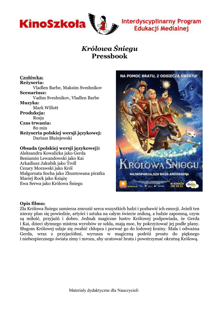 Królowa Śniegu Pressbook Czołówka: Reżyseria: Vladlen Barbe, Maksim Sveshnikov Scenariusz: Vadim Sveshnikov, Vladlen Barbe Muzyka: Mark Willott Produkcja: Rosja Czas trwania: 80 min Reżyseria polskiej wersji językowej: Dariusz Błażejewski Obsada (polskiej wersji językowej): Aleksandra Kowalicka jako Gerda Beniamin Lewandowski jako Kai Arkadiusz Jakubik jako Troll Cezary Morawski jako Król Małgorzata Socha jako Zbuntowana piratka Maciej Rock jako Książę Ewa Serwa jako Królowa Śniegu Opis filmu: Zła Królowa Śniegu zamierza zmrozić serca wszystkich ludzi i pozbawić ich emocji. Jeżeli ten niecny plan się powiedzie, artyści i sztuka na całym świecie znikną, a ludzie zapomną, czym są miłość, przyjaźń i dobro. Jednak magiczne lustro Królowej podpowiada, że Gerda i Kai, dzieci słynnego mistrza wyrobów ze szkła, mają moc, by pokrzyżować jej podłe plany. Sługom Królowej udaje się zwabić chłopca i porwać go do lodowej krainy. Mała i odważna Gerda, wraz z przyjaciółmi, wyrusza w magiczną podróż prosto do pięknego i niebezpiecznego świata zimy i mrozu, aby uratować brata i powstrzymać okrutną Królową. Materiały dydaktyczne dla Nauczycieli O PRODUKCJI: Pełna magii i humoru przygodowa animacja dla całej rodziny na podstawie jednej z najpiękniejszych baśni Hansa Christiana Andersena. W polskiej wersji językowej filmu będzie można usłyszeć Małgorzatę Sochę w roli zbuntowanej piratki (aktorka ma na swoim koncie rewelacyjne role dubbingowe w takich filmach jak „Smerfy”, „Tedi i poszukiwacze zaginionego miasta” czy „Alvin i wiewiórki”), Arkadiusza Jakubika jako trolla (podkładał swój głos m.in. w „Madagaskarze”, „Muppetach” oraz „Gdzie jest Nemo?”) jak również gwiazdę telewizji - Macieja Rocka jako rozkapryszonego księcia. POSTACIE: GERDA Gerda jest siostrą Kaja – a oboje są potomstwem twórcy magicznych zwierciadeł o niespotykanej mocy – mistrza Vergarda. Ma dobre serce, jest uczciwa, a co najważniejsze, nie straszna jej żadna przygoda! Potrafi zagrać zimie na nosie a swoją dobrocią rozgrzeje każde zmarznięte serce. Wyposażona w magiczne lusterko, które dostała od kochającego ojca, wyrusza do pięknej i niebezpiecznej krainy wiecznego mrozu, aby odnaleźć swojego zaginionego brata. KAJ Kaj to brat Gerdy. Wbrew powszechnym przypuszczeniom, nie jest spokrewniony z sokołem z odległej Zambezii o tym samym imieniu... aczkolwiek obie postaci przyznają się do bycia animowanymi. Kaj jest typem młodego artysty, który potrafi przyglądać się światu z nieustającym zachwytem. Rysuje tak pięknie, że namalowany przez niego bukiet na kartce papieru chciałoby się wręczyć najukochańszej osobie. W niewyjaśnionych okolicznościach chłopiec znika bez śladu. To właśnie na poszukiwania Kaja wyruszy Gerda. ŁASICZKA ZUZIA Zuzia, podobnie jak lalka z popularnej piosenki, jest nieduża, ale za to bardzo zwinna, sprytna i waleczna. Jako nieodłączna towarzyszka Gerdy potrafi stanąć oko w oko z każdym niebezpieczeństwem. Ten sprytny gryzoń, pomimo niewielkich rozmiarów, potrafi powalić nawet…trolla! Lepiej z nią nie zadzierajcie… chyba, że lubicie wywinąć orła na śniegu. Sama niewiele mówi, ale jej ostre pazurki mówią wszystko za nią. Jednak spokojnie, Zuzia jest zadziorna tylko w stosunku do złych postaci – dla przyjaciół zrobi wszystko, a dobrego człowieka wyczuje swoim noskiem na odległość siedmiu gór, siedmiu lasów i siedmiu rzek. TROLL ORM W dzisiejszych czasach nie łatwo jest być trollem… i to w dodatku ostatnim żyjącym trollem! Zwłaszcza, jeżeli w łapy ciągle zimno od lodowatej podłogi w pałacu Królowej Śniegu, której służy Orm. Całe szczęście jest najsilniejszym, najsprytniejszym i zabójczo przystojnym trollem. Przynajmniej tak to sobie tłumaczy. Mimo, że początkowo staje po złej stronie mrozu i śniegu, to w głębi duszy jest idealnym materiałem na najlepszego przyjaciela. Orm nie zawsze też potrafi utrzymać w ryzach swój „przystojny” wygląd. Czasami za sprawą magicznej sztuczki potrafi zamienić się w gryzoniowatego sierściucha, a innym razem… w dostojnego białego niedźwiedzia. Materiały dydaktyczne dla Nauczycieli KRÓLOWA ŚNIEGU Jest zimna jak sopel lodu, zła jak dziecko, które nie dostało prezentu pod choinkę, a jej życiowym celem jest sprowadzenie wiecznej zimy na całym świecie 24 godziny na dobę, 7 dni w tygodniu i 365 dni w roku. Do tego nie znosi artystów wszelkiej maści i rodzaju, w tym: muzyków (być może ma kiepski słuch i wstydzi się do tego przyznać), malarzy (tutaj pomogłyby pewnie okulary, których nie chce nosić), czy rzeźbiarzy (po prostu jest zazdrosna, że nikt nie wykuł jej pomnika z lodowej bryły). Być może jednak pod tą mroźną i groźną powłoką złej królowej kryje się mała wystraszona dziewczynka? Kto wie… ZBUNTOWANA PIRATKA Chociaż nie ma przepaski na oku, drewnianej nogi czy haka zamiast dłoni – to uważa się za pełnoprawną władczynię mórz i oceanów. Szkoda tylko, że jej rodzinny statek jest „zacumowany” na bezkresnej lodowej pustyni, a w związku z wieczną zimą - wody i fal szukać tutaj próżno. To jednak nie przeszkadza młodej piratce żyć zgodnie z duchem swoich walecznych kompanów. Uzbrojona w zabójczy temperament i ostrą gadkę potrafi podbić każdą przygodę! Jej najlepszym przyjacielem jest Renifer Pędziwiatr, któremu jednak nie zawsze spieszy się do galopu. TWÓRCY O FILMIE: Gdy rozpoczynałem pracę nad scenariuszem "Królowej Śniegu", nie marzyłem nawet o tym, że sam również ten film wyreżyseruję Miałem być tylko scenarzystą... Im dalej jednak posuwała się praca, tym więcej detali pojawiało się w mojej głowie, tym więcej inspiracji i pomysłów przebiegało przez moje myśli. Postacie ożywały, nabierały nowych barw. Pojawiały się kolejne fascynujące szczegóły, dowcipne dialogi. C