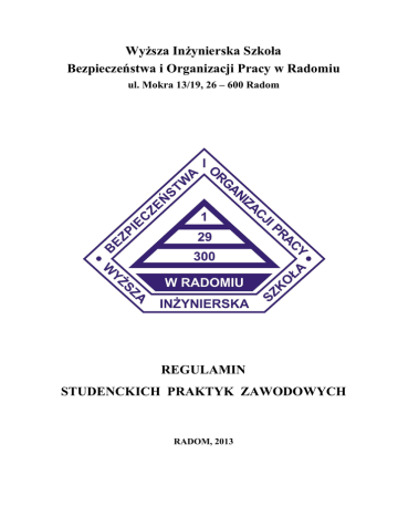 Wyższa Inżynierska Szkoła Bezpieczeństwa i Organizacji Pracy w Radomiu ul. Mokra 13/19, 26 – 600 Radom REGULAMIN STUDENCKICH PRAKTYK ZAWODOWYCH RADOM, 2013 Podstawa prawna §1 Podstawowa jednostka organizacyjna Wyższej Inżynierskiej Szkoły Bezpieczeństwa i Organizacji Pracy w Radomiu organizuje w ramach programu kształcenia studenckie praktyki zawodowe, jako integralną część studiów działając na podstawie: 1. art.160 ust. 2, art.166 ust. 2,2a,3 oraz art. 189.ust. 2 ustawy z dnia 27 lipca 2005 roku Prawo o szkolnictwie wyższym (Dz.U. Nr 164, poz. 1365 z późn. zm). 2. Rozporządzenia z dnia 5 października 2011 roku w sprawie Warunków prowadzenia studiów na określonym kierunku i poziomie kształcenia (Dz. U. Nr 243, poz. 1445 z późn. zm.). 3. Rozporządzenia z dnia 23 sierpnia 2012 roku zmieniającego rozporządzenie w sprawie warunków prowadzenia studiów na określonym kierunku i poziomie kształcenia (Dz. U. z 2012 r., poz. 938). 4. Rozporządzenia z dnia 2 listopada 2011 roku w sprawie Krajowych Ram Kwalifikacji dla Szkolnictwa Wyższego (Dz. U. Nr 253, poz. 1520 z późn. zm.). 5. Rozporządzenia z dnia 4 listopada 2011 roku w sprawie wzorcowych efektów kształcenia (Dz. U. Nr 253, poz. 1521 z późn. zm.). 6. Statutu i Regulaminu Studiów Wyższej Inżynierskiej Szkoły Bezpieczeństwa i Organizacji Pracy w Radomiu. Postanowienia ogólne §2 1. Studenckie praktyki zawodowe są obowiązkowe i stanowią integralną część kształcenia studentów studiów stacjonarnych i niestacjonarnych, ujętego w planie studiów i programie kształcenia danego kierunku/specjalności. 2. Zaliczenie praktyki zawodowej jest warunkiem uzyskania przez studenta zaliczenia semestru, w trakcie którego realizowana jest praktyka. 3. Studenckie praktyki zawodowe podlegają zaliczeniu zgodnie z planem studiów i programem kształcenia. 4. Studenckie praktyki zawodowe obowiązują w wymiarze i w formie zgodnej z określonymi efektami kształcenia dla danego poziomu i kierunku kształcenia. 5. Studenckie praktyki zawodowe realizowane są na podstawie Ramowego programu studenckich praktyk zawodowych, zawierającego program i plan studenckich praktyk zawodowych określony dla poszczególnych kierunków. 6. Studenckie praktyki zawodowe realizowane są w podmiotach gospodarczych krajowych i zagranicznych, w sektorze państwowym lub prywatnym, w organach administracji państwowej, organach administracji samorządowej lub innych jednostkach organizacyjnych – zwanych dalej „zakładem pracy”, pod warunkiem, że zadania zawodowe wykonywane przez studenta w zakładzie pracy będą zgodne z Ramowym programem studenckich praktyk zawodowych. 2 7. Student odbywa praktykę zawodową na podstawie zawartego pomiędzy Uczelnią a zakładem pracy porozumienia w/s odbywania i organizacji studenckich praktyk zawodowych i skierowania studenta na praktykę wydanego przez Uczelnię. 8. Studencka praktyka zawodowa może być zorganizowana w ramach programów Unii Europejskiej realizujących projekty praktyk zawodowych oraz wymian zagranicznych skierowanych do studentów. Cele studenckich praktyk zawodowych 1. 2. 3. 4. 5. §3 Zadaniem studenckich praktyk zawodowych jest umożliwienie kształtowania umiejętności i kompetencji społecznych oraz pogłębiania wiedzy przekazywanej w toku zajęć dydaktycznych i konfrontowania jej z praktyką życia gospodarczego. Zadaniem studenckich praktyk zawodowych jest nabycie przewidywanych efektów kształcenia opisanych w karcie przedmiotu w poszczególnych etapach praktyki. Studenckie praktyki zawodowe mają przyczynić się do rozwijania aktywności i przedsiębiorczości studentów, gdyż cechy te stanowią ważny składnik kompetencji społecznych. Studenckie praktyki zawodowe mają przyczynić się do nawiązania przez Uczelnię bliższej współpracy ze środowiskiem społeczno - gospodarczym i uwzględniania potrzeb rynku pracy w kształceniu studentów. A ponadto służą: 1) weryfikacji, doskonaleniu, poszerzeniu i praktycznemu zastosowaniu wiedzy zdobytej na studiach i rozwijaniu umiejętności jej wykorzystywania, 2) zdobyciu doświadczenia i dokonaniu samooceny umiejętności studenta w celu zwiększenia możliwości skutecznego konkurowania na rynku pracy, 3) poznaniu struktur i mechanizmów funkcjonowania przedsiębiorstw, zakładów pracy, urzędów i instytucji, 4) kształtowaniu umiejętności niezbędnych w przyszłej pracy zawodowej, w tym między innymi umiejętności: analitycznych, organizacyjnych, pracy w zespole, nawiązania kontaktów, prowadzenia negocjacji itp., 5) przygotowaniu studenta do samodzielności i odpowiedzialności za powierzone mu zadania, 6) wdrożeniu do wykonywania zadań zawodowych na stanowisku pracy odpowiadających kierunkowi studiów, 7) określeniu tematyki lub zakresu pracy dyplomowej oraz zdobywaniu materiałów niezbędnych lub wspomagających w napisaniu pracy dyplomowej. 3 Organizacja i formy studenckich praktyk zawodowych §4 1. Organizacją studenckich praktyk zawodowych zajmuje się wydział Uczelni. 2. Nadzór nad organizacją i przebiegiem studenckich praktyk zawodowych sprawuje powołany przez dziekana wydziału opiekun studenckich praktyk zawodowych. 3. Przed skierowaniem studenta na praktykę zawodową Uczelnia zawiera z zakładem pracy porozumienie w sprawie odbywania i organizacji studenckich praktyk zawodowych określające zobowiązania obu stron i zawierające informacje dotyczące czasu trwania praktyki oraz programu praktyk. 4. Na czas odbywania praktyk zakład pracy wyznacza zakładowego opiekuna, nadzorującego ich przebieg. 5. Ustala się następujące formy studenckich praktyk zawodowych: 1) praktyka indywidualna – student odbywa praktykę zawodową w samodzielnie wskazanym przez siebie zakładzie pracy po uzyskaniu zgody tego zakładu pracy i pozytywnym zweryfikowaniu przez uczelnianego opiekuna praktyk spełnienia przez ten zakład pracy warunków do odbywania praktyki. 2) praktyka zorgan
