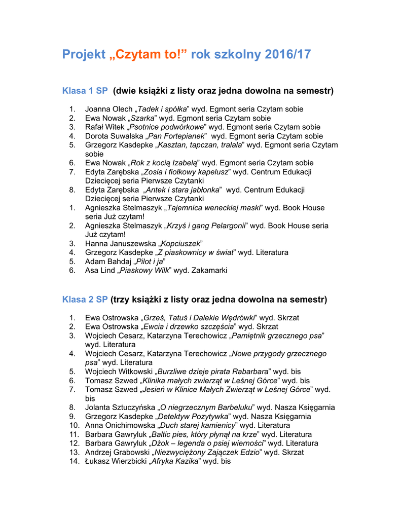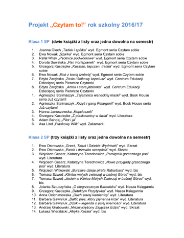 Projekt „Czytam to!” rok szkolny 2016/17 Klasa 1 SP (dwie książki z listy oraz jedna dowolna na semestr) 1. 2. 3. 4. 5. 6. 7. 8. 1. 2. 3. 4. 5. 6. Joanna Olech „Tadek i spółka” wyd. Egmont seria Czytam sobie Ewa Nowak „Szarka” wyd. Egmont seria Czytam sobie Rafał Witek „Psotnice podwórkowe” wyd. Egmont seria Czytam sobie Dorota Suwalska „Pan Fortepianek” wyd. Egmont seria Czytam sobie Grzegorz Kasdepke „Kasztan, tapczan, tralala” wyd. Egmont seria Czytam sobie Ewa Nowak „Rok z kocią Izabelą” wyd. Egmont seria Czytam sobie Edyta Zarębska „Zosia i fiołkowy kapelusz” wyd. Centrum Edukacji Dziecięcej seria Pierwsze Czytanki Edyta Zarębska „Antek i stara jabłonka” wyd. Centrum Edukacji Dziecięcej seria Pierwsze Czytanki Agnieszka Stelmaszyk „Tajemnica weneckiej maski” wyd. Book House seria Już czytam! Agnieszka Stelmaszyk „Krzyś i gang Pelargonii” wyd. Book House seria Już czytam! Hanna Januszewska „Kopciuszek” Grzegorz Kasdepke „Z piaskownicy w świat” wyd. Literatura Adam Bahdaj „Pilot i ja” Asa Lind „Piaskowy Wilk” wyd. Zakamarki Klasa 2 SP (trzy książki z listy oraz jedna dowolna na semestr) 1. 2. 3. 4. 5. 6. 7. 8. 9. 10. 11. 12. 13. 14. Ewa Ostrowska „Grześ, Tatuś i Dalekie Wędrówki” wyd. Skrzat Ewa Ostrowska „Ewcia i drzewko szczęścia” wyd. Skrzat Wojciech Cesarz, Katarzyna Terechowicz „Pamiętnik grzecznego psa” wyd. Literatura Wojciech Cesarz, Katarzyna Terechowicz „Nowe przygody grzecznego psa” wyd. Literatura Wojciech Witkowski „Burzliwe dzieje pirata Rabarbara” wyd. bis Tomasz Szwed „Klinika małych zwierząt w Leśnej Górce” wyd. bis Tomasz Szwed „Jesień w Klinice Małych Zwierząt w Leśnej Górce” wyd. bis Jolanta Sztuczyńska „O niegrzecznym Barbeluku” wyd. Nasza Księgarnia Grzegorz Kasdepke „Detektyw Pozytywka” wyd. Nasza Księgarnia Anna Onichimowska „Duch starej kamienicy” wyd. Literatura Barbara Gawryluk „Baltic pies, który płynął na krze” wyd. Literatura Barbara Gawryluk „Dżok – legenda o psiej wierności” wyd. Literatura Andrzej Grabowski „Niezwyciężony Zajączek Edzio” wyd. Skrzat Łukasz Wierzbicki „Afryka Kazika” wyd. bis 15. Wanda Chotomska „Pięciopsiaczki” 16. Roksana Jędrzejewska-Wróbel „Humory Hipolita Kabla” wyd. Adamada 17. Mariusz Niemycki „Zuzia na zamku Białej Damy” Klasa 3 SP (trzy książki z listy oraz jedna dowolna na semestr) 1. 2. 3. 4. 5. 6. 7. 8. 9. 10. 11. 12. 13. 14. 15. 16. 17. Astrid Lindgren „Madika z Czerwcowego Wzgórza” wyd. Literatura Astrid Lindgren „Mio, mój Mio” Astrid Lindgren „Emil ze Smalandii” Barbara Stenka „Oj, Hela” wyd. Literatura Roald Dahl „Matylda” Elżbieta Leszczyńska „Stara Chata i Czarownica” wyd. Skrzat Marcin Wicha „Klara: Proszę tego nie czytać!” Mary Norton „Gałka od łóżka” Barbara Gawryluk „Zuzanka z pistacjowego domu” wyd. Literatura Rafał Kosik „Amelia i Kuba. Kuba i Amelia” Janusz Korczak „Bankructwo Małego Dżeka” Łukasz Wierzbicki „Machiną przez Chiny” Łukasz Wierzbicki „Wyprawa niesłychana Benedykta i Jana” Kenneth Grahame „O czym szumią wierzby” Eugenio Carmi, Umberto Eco „Trzy opowieści” Anne-Cath. Vestly „8+2 i ciężarówka” Rafał Skarżycki, Tomasz Lew Leśniak “Hej, Jędrek! Kto tu rządzi?” Klasa 4 SP (trzy książki z listy oraz jedna dowolna na semestr) 1. 2. 3. 4. 5. 6. 7. 8. 9. 10. 11. 12. 13. 14. 15. 16. 17. Marcin Wicha „Klara: Słowo na „Szy” wyd. Czarna Owieczka Barbara Stenka „Masło Przygodowe” wyd. Literatura Anna Kamieńska „Dom w domu” Martin Widmark „Antykwariat pod Błękitnym Lustrem” wyd. Zakamarki Rudyard Kipling „Księga Dżungli” Grey Owl „Przygody Sajo i małych bobrów” Renata Piątkowska „Zbój: opowiadania o koniach i konikach” wyd. Literatura Astrid Lindgren „Ronja, córka zbójnika” Seweryna Szmaglewska „Czarne stopy” Janusz Korczak „Kajtuś czarodziej” Roald Dahl „Charlie i fabryka czekolady” Roald Dahl „Charlie i wielka szklana winda” Ferdynand Antoni Ossendowski „Słoń Birara” Marcin Szczygielski „Czarny młyn” Ulysses Moore „Wrota czasu” Jacob Grey „Zwierzomówcy. Znak pająka” Agnieszka Stelmaszyk „Tajemnica klejnotu Nefertiti” Klasy 5-6 SP (dwie książki z listy oraz dwie dowolne na semestr) 1. 2. 3. 4. 5. 6. 7. 8. 9. 10. 11. 12. 13. 14. 15. 16. 17. 18. 19. 20. Jules Verne „Piętnastoletni kapitan” Joanna Olech „Dynastia Niziołków” Michael Ende „Momo” Roberto Piumini „Migotnik” Jack London „Biały kieł” Ursula K. Le Guin „Czarnoksiężnik z Archipelagu” Katherine Paterson „Most do Terabithii” Zbigniew Nienacki „Księga Strachów” Zbigniew Nienacki „Księga urwisów” Eleanor H. Poter „Pollyanna” R. J. Palacio „Cud chłopak” Maciej Wojtyszko „Bromba i inni” R. L. Stevenson „Wyspa Skarbów” Kornel Makuszyński „Panna z mokrą głową” Dorota Terakowska „Władca Lewawu” Jose Mauro de Vasconcelos „Moje drzewko pomarańczowe” Dan Gemeinhart „Cała prawda” Anna Piwkowska „Franciszka” Ben Rice „Pobby i Dingan” Marianne Malone “68 pokojów”