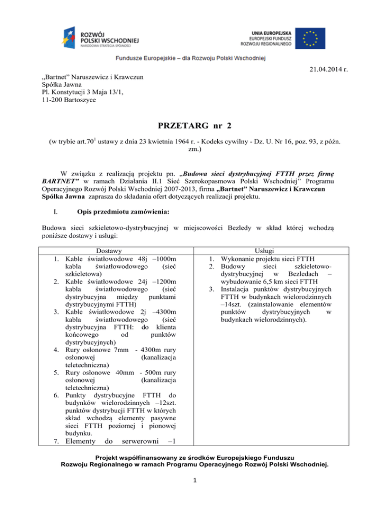 21.04.2014 r. „Bartnet” Naruszewicz i Krawczun Spółka Jawna Pl. Konstytucji 3 Maja 13/1, 11-200 Bartoszyce PRZETARG nr 2 (w trybie art.701 ustawy z dnia 23 kwietnia 1964 r. - Kodeks cywilny - Dz. U. Nr 16, poz. 93, z późn. zm.) W związku z realizacją projektu pn. „Budowa sieci dystrybucyjnej FTTH przez firmę BARTNET” w ramach Działania II.1 Sieć Szerokopasmowa Polski Wschodniej” Programu Operacyjnego Rozwój Polski Wschodniej 2007-2013, firma „Bartnet” Naruszewicz i Krawczun Spółka Jawna zaprasza do składania ofert dotyczących realizacji projektu. I. Opis przedmiotu zamówienia: Budowa sieci szkieletowo-dystrybucyjnej w miejscowości Bezledy w skład której wchodzą poniższe dostawy i usługi: Usługi 1. Wykonanie projektu sieci FTTH 2. Budowy sieci szkieletowodystrybucyjnej w Bezledach – wybudowanie 6,5 km sieci FTTH 3. Instalacja punktów dystrybucyjnych FTTH w budynkach wielorodzinnych –14szt. (zainstalowanie elementów punktów dystrybucyjnych w budynkach wielorodzinnych). Dostawy 1. Kable światłowodowe 48j –1000m kabla światłowodowego (sieć szkieletowa) 2. Kable światłowodowe 24j –1200m kabla światłowodowego (sieć dystrybucyjna między punktami dystrybucyjnymi FTTH) 3. Kable światłowodowe 2j –4300m kabla światłowodowego (sieć dystrybucyjna FTTH: do klienta końcowego od punktów dystrybucyjnych) 4. Rury osłonowe 7mm - 4300m rury osłonowej (kanalizacja teletechniczna) 5. Rury osłonowe 40mm - 500m rury osłonowej (kanalizacja teletechniczna) 6. Punkty dystrybucyjne FTTH do budynków wielorodzinnych –12szt. punktów dystrybucji FTTH w których skład wchodzą elementy pasywne sieci FTTH poziomej i pionowej budynku. 7. Elementy do serwerowni –1 Projekt współfinansowany ze środków Europejskiego Funduszu Rozwoju Regionalnego w ramach Programu Operacyjnego Rozwój Polski Wschodniej. 1 zestaw elementów do serwerowni (szafa rakowa dystrybucyjna, przełącznica światłowodowa, organizatory kabli poziome i pionowe) 8. OLT koncentrator GPON –1 szt. urządzeń w technologii GPON pozwalających świadczyć usługę FTTH dla beneficjentów projektu. 9. Zasilanie awaryjne DC 10. Zewnętrzne punkty dystrybucji FTTH z wyposażeniem –2 szt. zewnętrznych punktów dystrybucji FTTH umożliwiających podłączenie beneficjentów końcowych projektu. 11. Oprogramowanie do paszportyzacji sieci – 1 szt. 12. Urządzenia abonenckie FTTH –100 urządzeń abonenckich Szczegółowy zakres ilościowy oraz opisowy prac znajduje się w zał. nr 2 do niniejszego zapytania. Złożenie oferty jest równoznaczne z akceptacją przedmiotu zamówienia i potwierdzeniem, że przedmiot oferty jest zgodny z wymaganym zakresem. II. Termin wykonania zamówienia: 30.06.2015 r. Złożenie oferty jest równoznaczne z akceptacją wskazanego terminu wykonania. III. Warunki udziału w postępowaniu: 1) O zamówienie mogą ubiegać się Wykonawcy, którzy potwierdzą spełnienie poniższych warunków: a) Posiadają uprawnienia do wykonywania działalności lub czynności, jeżeli prawo nakłada obowiązek posiadania takich uprawnień.Warunek uznaje się za spełniony w przypadku powierzenia zadań podwykonawcom posiadającym wymagane prawem uprawnienia. b) Posiadają niezbędną wiedzę i doświadczenie oraz dysponują potencjałem technicznym, finansowym w celu prawidłowego wykonania niniejszego zamówienia. 2) Ocena spełniania warunków udziału w postępowaniu (określonych w pkt 1a-b) zostanie dokonana wg formuły „spełnia – nie spełnia” w oparciu o przedłożone oświadczenie oferenta. IV. Kryteria wyboru oferty najkorzystniejszej: 1) Najkorzystniejsza oferta zostanie wybrana w oparciu o następujące kryterium oceny: Cena – waga kryterium 100%; obliczana według wzoru: liczba punktów za kryterium cena oferty (C) = (najniższa cena netto/cena netto oferty) x 100 Maksymalnie oferta może uzyskać 100 punktów. Projekt współfinansowany ze środków Europejskiego Funduszu Rozwoju Regionalnego w ramach Programu Operacyjnego Rozwój Polski Wschodniej. 2 2) Sposób oceny ofert: Maksymalna ilośc pkt. – 100. Punkty zostaną obliczone z dokładnością do dwóch miejsc po przecinku. Oferta z największą ilością punktów zostanie wybrana jako najkorzystniejsza. V. Zakres rzeczowy i sposób złożenia oferty: 1) Złożona oferta musi zawierać: nazwę i adres oferenta; wartość oferty (netto, PLN,); termin realizacji; Ofertę należy przedstawić na formularzu stanowiącym załącznik nr 1 do zapytania. 2) Ofertę można złożyć w jeden z następujących sposobów: w formie elektronicznej za pośrednictwem poczty elektronicznej: [email protected], za pośrednictwem poczty lub osobiście na adres: Bartnet” Naruszewicz i Krawczun Spółka Jawna, Pl. Konstytucji 3 Maja 13/1, 11-200 Bartoszyce. VI. Termin składania ofert i otwarcia: Termin składania ofert upływa w dniu 19.05.2014 r. (decyduje data wpływu oferty). Oferty zostaną otwarte w dniu 20.05.2014 r. Zamawiający niezwłocznie powiadomi na piśmie uczestników przetargu o jego wyniku albo o zamknięciu przetargu bez dokonania wyboru. VII. Przesłanki odrzucenia ofert 1) Oferta będzie podlegać odrzuceniu jeśli: zostanie złożona po terminie składania ofert treść oferty będzie niezgodna z zapytaniem ofertowym, oferta bedzie zawierać rażąco niską cenę, zostanie złożona przez wykonawcę, który nie przedstawił oświadczenia o spełnianiu warunków udziału w postępowaniu. VIII. Pozostałe wytyczne i informacje: Nie dopuszcza się składania ofert częściowych. Zamawiający dopuszcza możliwość powierzenia przez Wykonawcę części zamówienia podwykonawcom. Zamawiający zastrzega sobie możliwość żądania od oferentów wyjaśnień dotyczących treści złożonych ofert. Zamawiający oświadcza, że nie dokona zmian warunków przetargu oraz ich nie odwoła. W przypadku złożenia przez jeden podmiot wiecej niż jednej oferty, wszystkie oferty złożone przez ten podmi