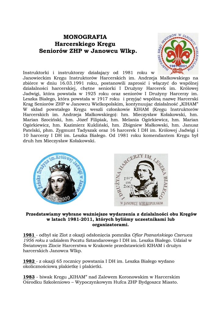 MONOGRAFIA Harcerskiego Kręgu Seniorów ZHP w Janowcu Wlkp. Instruktorki i instruktorzy działający od 1981 roku w Janowieckim Kręgu Instruktorów Harcerskich im. Andrzeja Małkowskiego na zbiórce w dniu 16.03.1991 roku, postanowili zaprosić i włączyć do wspólnej działalności harcerskiej, chętne seniorki I Drużyny Harcerek im. Królowej Jadwigi, która powstała w 1925 roku oraz seniorów I Drużyny Harcerzy im. Leszka Białego, która powstała w 1917 roku i przyjąć wspólną nazwę Harcerski Krąg Seniorów ZHP w Janowcu Wielkopolskim, kontynuując działalność „KIHAM” W skład powstałego Kręgu weszli członkowie KIHAM (Kręgu Instruktorów Harcerskich im. Andrzeja Małkowskiego): hm. Mieczysław Kołakowski, hm. Marian Szociński, hm. Józef Filipiak, hm. Melania Ogórkiewicz, hm. Marian Ogórkiewicz, hm. Kazimierz Kukliński, hm. Zbigniew Małkowski, hm. Janusz Patelski, phm. Zygmunt Tadyszak oraz 16 harcerek I DH im. Królowej Jadwigi i 10 harcerzy I DH im. Leszka Białego. Od 1981 roku komendantem Kręgu był druh hm Mieczysław Kołakowski. Przedstawiamy wybrane ważniejsze wydarzenia z działalności obu Kręgów w latach 1981-2011, których byliśmy uczestnikami lub organizatorami. 1981 - odbył się Zlot z okazji odsłonięcia pomnika Ofiar Poznańskiego Czerwca 1956 roku z udziałem Pocztu Sztandarowego I DH im. Leszka Białego. Udział w Światowym Zlocie Harcerstwa w Krakowie przedstawicieli KIHAM i drużyn harcerskich Janowca Wlkp. 1982 - z okazji 65 rocznicy powstania I DH im. Leszka Białego wydano okolicznościową plakietkę i plakietki. 1983 - biwak Kręgu „KIHAM” nad Zalewem Koronowskim w Harcerskim Ośrodku Szkoleniowo – Wypoczynkowym Hufca ZHP Bydgoszcz Miasto. 1987 – biwak Kręgu KIHAM nad Zalewem Koronowskim z okazji 70-lecia I DH im. Leszka Białego w Janowcu Wlkp. 1991 - 16 marca członkowie I DH im. Królowej Jadwigi i I DH im. Leszka Białego, powołali do życia Harcerski Krąg Seniorów w Janowcu Wlkp. Komendantem Kręgu wybrano hm Mariana Szocińskiego. 1992 – 75-lecie I DH im. Leszka Białego – wydano okolicznościowy medal Pamiątkowy wg projektu hm Bogdana Panasiewicza. 1997 – w dniu 80 rocznicy powstania I DH im. Leszka Białego została otwarta wystawa okolicznościowa 80 lat w służbie ZHP, wydano okolicznościowe broszury Dzieje I DH im .Królowej Jadwigi, Dzieje I DH im Leszka Białego , Wydarzenia z życia drużyny w fotografii, Kalendarium Historyczne Harcerstwa Janowieckiego , gazetę Harcerskie Wiadomości Janowieckie, dwie kartki pocztowe, datownik pocztowy, plakietki okolicznościowe, zapoczątkowano akcję Replika Sztandaru. Biwak Kręgu w Harcerskim Ośrodku Szkoleniowo – Wypoczynkowym Hufca ZHP Bydgoszcz w Pólku nad Zalewem Koronowskim. 1998 – w 80-rocznicę odzyskania niepodległości – została poświęcona replika sztandaru I DH im. Leszka Białego. Zorganizowano wystawę rzeźb druha Henryka Dąbrowskiego. 1999 – zakończenie akcji Replika Sztandaru wbiciem w drzewce gwoździ pamiątkowych, wydano broszury „Wierni idei harcerskiej przez całe życie” oraz „Sztandar I DH im. Leszka Białego w Janowcu Wielkopolskim”, autorka hm Janina Hojan. 2000 – 25.03. – Janowiec Wlkp. - zakończenie konkursu „Harcerska służba Ojczyźnie wczoraj, dziś, jutro” pokaz prac konkursowych. 22.02. – uroczysta zbiórka z okazji Dnia Myśli Braterskiej. 29 – 30.04.2000 - Skulsk - udział Kręgu w Patronalnym Dniu Skupienia oraz otwarciu Mauzoleum Harcerskiego przy Sanktuarium Matki Boskiej Bolesnej. 11.06. - Janowiec Wlkp. – inauguracja obchodów 75 rocznicy powstania I DH im. Królowej Jadwigi. Zorganizowano wystawę, wydano medal pamiątkowy, tablicę epitafijną „Janowieccy harcerze służąc Bogu i Polsce – oddali życie za ojczyznę” oraz odsłonięcie i poświęcenie obelisku pamięci Janowieckich harcerek, harcerzy i przyjaciół ZHP na cmentarzu parafialnym. Umieszczenie w Kościele Parafialnym i poświęcenie obrazu Królowej Jadwigi, patronki janowieckich harcerek. 4 – 6.08. – Bednary – Gniezno - udział Kręgu w Światowym Zlocie ZHP „Gniezno 2000”. 9.12. – Poznań – Buk - udział delegacji Kręgu w obchodach 50 rocznicy śmierci hm. Jana Poplewskiego, wydano medal pamiątkowy poświęcony 50 rocznicy śmierci hm Jana Poplewskiego. 2001 – 22.02. – uroczysta zbiórka z okazji Dnia Myśli Braterskiej.18 – 21.04. – Poznań – udział przedstawicieli Kręgu w zbiórce Wielkopolskiej Rady Harcerskich Kręgów Seniorów. 2.06. – Skulsk - członkowie Kręgu, uczestniczyli w Patronalnym Dniu Skupienia. 15.07. – Janowiec Wlkp. – otwarcie i poświęcenie Izby Harcerskiej im. druhny Meli zawierającej zbiory poświęcone harcerstwu. 7-8.09. – udział w biwaku Skulskiej Wspólnoty Seniorów ZHP w Ślesinie. 14 – 16.09. – Lublin - udział delegacji Kręgu w X Ogólnopolskim Złazie Seniorów. 1 – 6.10. - udział członków Kręgu w wycieczce do krajów Benelux organizowanej przez Wielkopolską Radę Harcerskich Kręgów Seniorów. 2002 - 20.01. – Janowiec Wlkp. - Dzień Myśli Braterskiej Msza św. w parafialnym kościele p.w. Św. Mikołaja za zmarłe harcerki i harcerzy janowieckich drużyn. 17.05. – Marcinkowo Dolne - w 85 rocznicę powstania I DH im. Leszka Białego – wycieczka członków Kręgu pod pomnik patrona do Marcinkowa. 15.08. - Janowiec Wlkp. - otwarcie drugiej części Izby Harcerskiej poświęconej Szarym Szeregom, Powstaniu Wielkopolskiemu oraz pamiątkom po Ogólnopolskich Złazach Seniorów ZHP. 25 -28.08. – Rzeszów - udział członków Kręgu w XI Złazie Seniorów ZHP z wyjazdem do Lwowa. 2003 - 4.01. – Poznań - udział delegacji Kręgu w spotkaniu opłatkowym organizowanym przez Harcerski Krąg Seniorów OWAR. 16.01. – Trzemeszno udział w zbiórce Skulskiej Rady Seniorów ZHP. 17.05. – Inowrocław - udział członków Kręgu w obchodach 90-lecia harcerstwa w Inowrocławiu. 31.05. Poznań - udział delegacji Krę