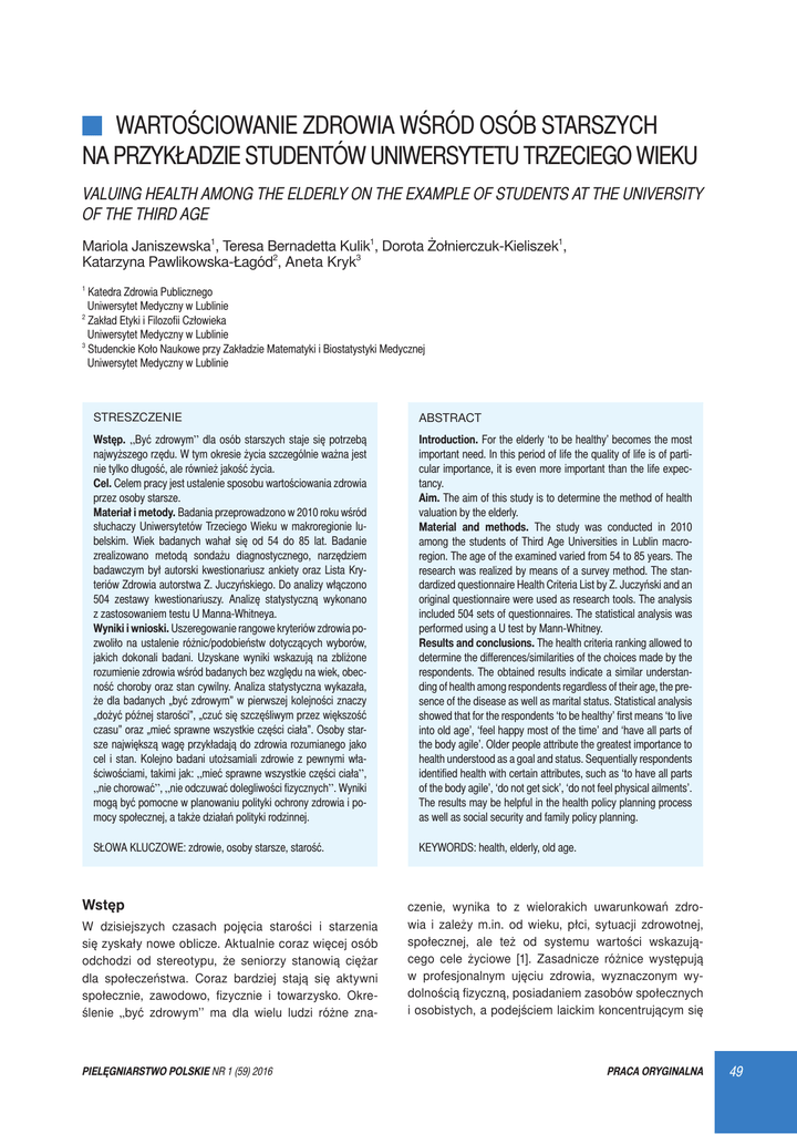 WARTOŚCIOWANIE ZDROWIA WŚRÓD OSÓB STARSZYCH NA PRZYKŁADZIE STUDENTÓW UNIWERSYTETU TRZECIEGO WIEKU VALUING HEALTH AMONG THE ELDERLY ON THE EXAMPLE OF STUDENTS AT THE UNIVERSITY OF THE THIRD AGE Mariola Janiszewska1, Teresa Bernadetta Kulik1, Dorota Żołnierczuk-Kieliszek1, Katarzyna Pawlikowska-Łagód2, Aneta Kryk3 1 Katedra Zdrowia Publicznego Uniwersytet Medyczny w Lublinie 2 Zakład Etyki i Filozofii Człowieka Uniwersytet Medyczny w Lublinie 3 Studenckie Koło Naukowe przy Zakładzie Matematyki i Biostatystyki Medycznej Uniwersytet Medyczny w Lublinie STRESZCZENIE ABSTRACT Wstęp. „Być zdrowym” dla osób starszych staje się potrzebą najwyższego rzędu. W tym okresie życia szczególnie ważna jest nie tylko długość, ale również jakość życia. Cel. Celem pracy jest ustalenie sposobu wartościowania zdrowia przez osoby starsze. Materiał i metody. Badania przeprowadzono w 2010 roku wśród słuchaczy Uniwersytetów Trzeciego Wieku w makroregionie lubelskim. Wiek badanych wahał się od 54 do 85 lat. Badanie zrealizowano metodą sondażu diagnostycznego, narzędziem badawczym był autorski kwestionariusz ankiety oraz Lista Kryteriów Zdrowia autorstwa Z. Juczyńskiego. Do analizy włączono 504 zestawy kwestionariuszy. Analizę statystyczną wykonano z zastosowaniem testu U Manna-Whitneya. Wyniki i wnioski. Uszeregowanie rangowe kryteriów zdrowia pozwoliło na ustalenie różnic/podobieństw dotyczących wyborów, jakich dokonali badani. Uzyskane wyniki wskazują na zbliżone rozumienie zdrowia wśród badanych bez względu na wiek, obecność choroby oraz stan cywilny. Analiza statystyczna wykazała, że dla badanych „być zdrowym” w pierwszej kolejności znaczy „dożyć późnej starości”, „czuć się szczęśliwym przez większość czasu” oraz „mieć sprawne wszystkie części ciała”. Osoby starsze największą wagę przykładają do zdrowia rozumianego jako cel i stan. Kolejno badani utożsamiali zdrowie z pewnymi właściwościami, takimi jak: „mieć sprawne wszystkie części ciała”, „nie chorować”, „nie odczuwać dolegliwości fizycznych”. Wyniki mogą być pomocne w planowaniu polityki ochrony zdrowia i pomocy społecznej, a także działań polityki rodzinnej. Introduction. For the elderly ‘to be healthy’ becomes the most important need. In this period of life the quality of life is of particular importance, it is even more important than the life expectancy. Aim. The aim of this study is to determine the method of health valuation by the elderly. Material and methods. The study was conducted in 2010 among the students of Third Age Universities in Lublin macroregion. The age of the examined varied from 54 to 85 years. The research was realized by means of a survey method. The standardized questionnaire Health Criteria List by Z. Juczyński and an original questionnaire were used as research tools. The analysis included 504 sets of questionnaires. The statistical analysis was performed using a U test by Mann-Whitney. Results and conclusions. The health criteria ranking allowed to determine the differences/similarities of the choices made by the respondents. The obtained results indicate a similar understanding of health among respondents regardless of their age, the presence of the disease as well as marital status. Statistical analysis showed that for the respondents ‘to be healthy’ first means ‘to live into old age’, ‘feel happy most of the time’ and ‘have all parts of the body agile’. Older people attribute the greatest importance to health understood as a goal and status. Sequentially respondents identified health with certain attributes, such as ‘to have all parts of the body agile’, ‘do not get sick’, ‘do not feel physical ailments’. The results may be helpful in the health policy planning process as well as social security and family policy planning. SŁOWA KLUCZOWE: zdrowie, osoby starsze, starość. KEYWORDS: health, elderly, old age. Wstęp W dzisiejszych czasach pojęcia starości i starzenia się zyskały nowe oblicze. Aktualnie coraz więcej osób odchodzi od stereotypu, że seniorzy stanowią ciężar dla społeczeństwa. Coraz bardziej stają się aktywni społecznie, zawodowo, fizycznie i towarzysko. Określenie „być zdrowym’’ ma dla wielu ludzi różne zna- PIELĘGNIARSTWO POLSKIE NR 1 (59) 2016 czenie, wynika to z wielorakich uwarunkowań zdrowia i zależy m.in. od wieku, płci, sytuacji zdrowotnej, społecznej, ale też od systemu wartości wskazującego cele życiowe [1]. Zasadnicze różnice występują w profesjonalnym ujęciu zdrowia, wyznaczonym wydolnością fizyczną, posiadaniem zasobów społecznych i osobistych, a podejściem laickim koncentrującym się PRACA ORYGINALNA 49 najczęściej na wymiarze fizycznym, a czasami także psychicznym. Dla aktywnych osób starszych zdrowie staje się potrzebą najwyższego rzędu. Wiek starszy to okres, w którym spodziewać się możemy złego stanu zdrowia. To, jakie będziemy mieli zdrowie, zależy tylko od nas, od tego, jak się szanowaliśmy przez całe nasze życie, od naszego nastawienia i podejścia do samej starości [2]. Należy więc wzmocnić instytucje wsparcia społecznego dla ludzi starszych, aby nie pozostali w ostatniej dekadzie swojego życia sami, niepotrzebni, odrzuceni. Takim rozwiązaniem może być Uniwersytet Trzeciego Wieku. Dla seniorów udział w zajęciach prowadzonych przez taką instytucję może być czynnikiem sprzyjającym zachowaniu przyjętego rytmu życia, kontaktów społecznych oraz większej dbałości o zdrowie [3]. Cel pracy Celem badań było ustalenie sposobu wartościowania zdrowia przez osoby starsze. Materiał i metody Badania przeprowadzono w okresie od kwietnia do lipca 2010 roku wśród słuchaczy Uniwersytetów Trzeciego Wieku w makroregionie lubelskim. Badanie zrealizowano metodą sondażu diagnostycznego, techniką był autorski kwestionariusz ankiety oraz Lista Kryter