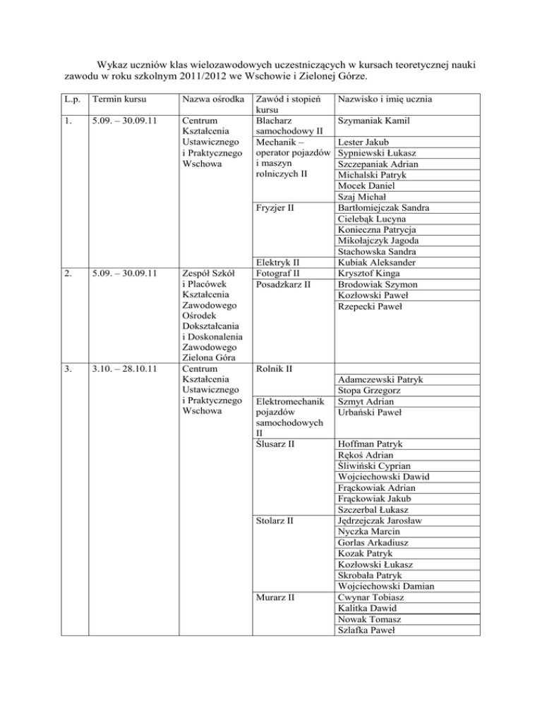 Wykaz uczniów klas wielozawodowych uczestniczących w kursach teoretycznej nauki zawodu w roku szkolnym 2011/2012 we Wschowie i Zielonej Górze. L.p. Termin kursu Nazwa ośrodka 1. 5.09. – 30.09.11 Centrum Kształcenia Ustawicznego i Praktycznego Wschowa Zawód i stopień kursu Blacharz samochodowy II Mechanik – operator pojazdów i maszyn rolniczych II Fryzjer II 2. 5.09. – 30.09.11 3. 3.10. – 28.10.11 Zespół Szkół i Placówek Kształcenia Zawodowego Ośrodek Dokształcania i Doskonalenia Zawodowego Zielona Góra Centrum Kształcenia Ustawicznego i Praktycznego Wschowa Elektryk II Fotograf II Posadzkarz II Nazwisko i imię ucznia Szymaniak Kamil Lester Jakub Sypniewski Łukasz Szczepaniak Adrian Michalski Patryk Mocek Daniel Szaj Michał Bartłomiejczak Sandra Cielebąk Lucyna Konieczna Patrycja Mikołajczyk Jagoda Stachowska Sandra Kubiak Aleksander Krysztof Kinga Brodowiak Szymon Kozłowski Paweł Rzepecki Paweł Rolnik II Elektromechanik pojazdów samochodowych II Ślusarz II Stolarz II Murarz II Adamczewski Patryk Stopa Grzegorz Szmyt Adrian Urbański Paweł Hoffman Patryk Rękoś Adrian Śliwiński Cyprian Wojciechowski Dawid Frąckowiak Adrian Frąckowiak Jakub Szczerbal Łukasz Jędrzejczak Jarosław Nyczka Marcin Gorlas Arkadiusz Kozak Patryk Kozłowski Łukasz Skrobała Patryk Wojciechowski Damian Cwynar Tobiasz Kalitka Dawid Nowak Tomasz Szlafka Paweł 4. 3.10. – 30.10.11 5. 2.11. – 25.11.11 6. 2.11.11 – 4.12.11 7. Zespół Szkół i Placówek Kształcenia Zawodowego Ośrodek Dokształcania i Doskonalenia Zawodowego Zielona Góra Centrum Kształcenia Ustawicznego i Praktycznego Wschowa Zespół Szkół i Placówek Kształcenia Zawodowego Ośrodek Dokształcania i Doskonalenia Zawodowego Zielona Góra 28.11.11 – 23.12.11 Centrum Kształcenia Ustawicznego i Praktycznego Wschowa Elektromechanik pojazdów samochodowych III Wojciechowski Dawid Samol Marek Fryzjer II Cicha Natalia Kortus Natalia Jankowiak Patrycja Suwiczak Anita Lisowska Katarzyna Szczerbal Anna Mechanik – Orłowski Marek operator pojazdów Roszkowiak Karol i maszyn Superlak Adrian rolniczych I Dreas Remigiusz Zamelski Dominik Malarz – tapeciarz Biały Leszek II Michalak Dominik Nowak Kamil Skoracki Łukasz Kasperski Mateusz Ludwiczak Michał Monter instalacji Wojciechowski Dawid i urządzeń Daszkiewicz Dominik sanitarnych II Domagała Karol Łukaszewicz Dawid Monter-elektronik Pryfer Andrzej III Ślusarz III Rzeźnikwędliniarz III Murarz III Frąckowiak Eryk Jakubowski Dariusz Mania Bartłomiej Borowski Tobiasz Klemenski Amadeusz Wiśniewski Piotr Skrobała Tomasz Pelec Damian Skrzypczak Kamil Zborowski Mateusz Andrzejewski Gracjan Dreas Leszek 8. 2.01.12 – 27.01.12 Centrum Kształcenia Ustawicznego i Praktycznego Wschowa Mechanik pojazdów samochodowych III Fryzjer III Lakiernik II 9. 30.01.12 – 9.03.12 Centrum Kształcenia Ustawicznego i Praktycznego Wschowa Cukiernik I Mechanikoperator pojazdów i maszyn rolniczych III Mechanik pojazdów samochodowych III Lakiernik I Murarz I 10. 12.03.12 – 6.04.12 Centrum Kształcenia Ustawicznego i Praktycznego Wschowa Monter instalacji i urządzeń sanitarnych I Ślusarz I Blacharzsamochodowy III Stolarz I Elektryk III Malcherek Daniel Matysiak Miłosz Melcer Hubert Skoracki Szymon Wojciechowski Wojciech Adamczewski Kamil Nowak Lukrecja Rozwalka Magdalena Szymaniak Kamila Drobnik Angelika Frąckowiak Joanna Maślanka Magdalena Andrzejewska Oliwia Kobus Kamila Koniorski Mariusz Nadolny Arkadiusz Wojciechowski Michał Cielebąk Dorota Kaminiarz Jan Adamczewski Kamil Bartkowiak Alan Galusik Marcin Kołcun Joachim Matysiak Mateusz Ratajczak Eryk Wojtkowiak Zbigniew Kochanek Adam Nowak Adam Nowak Przemysław Mania Paweł Han Jarosław Izydorczyk Patryk Superlak Paweł Witkiewicz Dominik Kaźmierczak Robert Kędziora Michał Grzelak Kamil Hałupka Patryk Hanusek Adrian Jankowski Tobiasz Kaźmierczak Sebastian Łakomy Przemysław Matysiak Karol Pryfer Michał Andrzejewski Maciej Jęsiek Mateusz Starzonek Daniel Karolczyk Dariusz 11. 16.04.12 – 18.05.12 Centrum Kształcenia Ustawicznego i Praktycznego Wschowa 12. 21.05.12 – 15.06.12 Centrum Kształcenia Ustawicznego i Praktycznego Wschowa Kubicki Dawid Szubert Augustyn Malarz-tapeciarz I Adamczewski Łukasz Kozłowski Sebastian Kozłowski Adrian Monter instalacji i Majorek Marcin urządzeń Mencel Dominik sanitarnych III Żurczak Cezary Mechanik Minta Szymon pojazdów Ranka Paweł samochodowych I Musiał Jacek Kajewski Marcin Nadolny Kacper Owczarczak Patryk Pieprzyk Przemysław Stolarz III Pieśniak Michał Cukiernik III Haryk Katarzyna Fryzjer I Bartkowiak Kamil Włodarczak Joanna Kołcun Aleksandra Śledź Anna Zamelska Joanna Piekarz I Zamelski Marcin Rolnik I Wojtkowiak Przemysław Ulichnowski Marcin Woźniczak Maciej Elektromechanik Wojdowski Daniel pojazdów Weinert Maciej samochodowych I