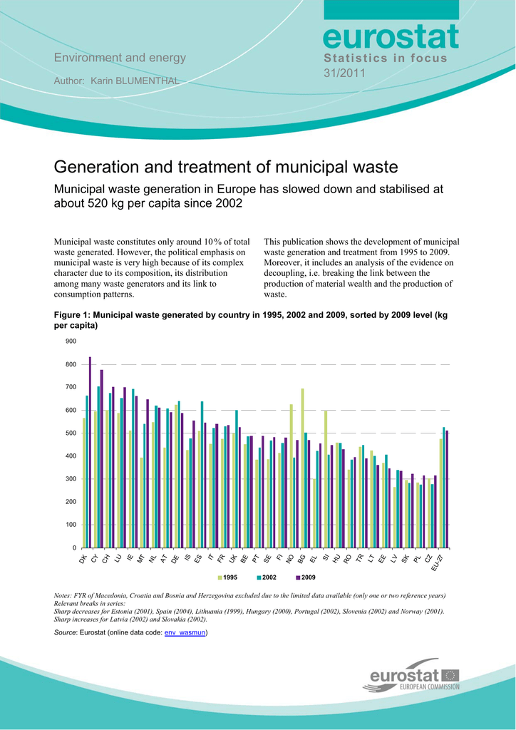 Environment and energy Statistics in focus 31/2011 Author: Karin BLUMENTHAL Generation and treatment of municipal waste Municipal waste generation in Europe has slowed down and stabilised at about 520 kg per capita since 2002 Municipal waste constitutes only around 10 % of total waste generated. However, the political emphasis on municipal waste is very high because of its complex character due to its composition, its distribution among many waste generators and its link to consumption patterns. This publication shows the development of municipal waste generation and treatment from 1995 to 2009. Moreover, it includes an analysis of the evidence on decoupling, i.e. breaking the link between the production of material wealth and the production of waste. Figure 1: Municipal waste generated by country in 1995, 2002 and 2009, sorted by 2009 level (kg per capita) 900 800 700 600 500 400 300 200 100 1995 2002 EU - 27 PL CZ LV SK LT EE TR RO SI HU EL BG FI NO SE PT UK BE IT FR IS ES AT DE IE MT NL LU CY CH DK 0 2009 Notes: FYR of Macedonia, Croatia and Bosnia and Herzegovina excluded due to the limited data available (only one or two reference years) Relevant breaks in series: Sharp decreases for Estonia (2001), Spain (2004), Lithuania (1999), Hungary (2000), Portugal (2002), Slovenia (2002) and Norway (2001). Sharp increases for Latvia (2002) and Slovakia (2002). Source: Eurostat (online data code: env_wasmun) Municipal waste generated by country Eurostat has been collecting and publishing data on municipal waste since 1995. These data are widely used for comparing municipal waste generation and treatment in different countries, and indicators on municipal waste are used to monitor European waste policies. The data on municipal waste expressed in kilogram per capita are part of a set of indicators which are compiled annually to monitor the EU’s sustainable development strategy. The data presented cover the period from 1995 to 2009 for the 27 EU Member States; for the Candidate Countries Croatia (only 2006 and 2008), the former Yugoslav Republic of Macedonia (only 2008) and Turkey, for the EFTA Countries Iceland, Norway and Switzerland, and the potential candidate country Bosnia and Herzegovina (only 2008 and 2009) data are presented as far as possible. Figure 1 shows municipal waste generation by country expressed in kilogram per capita. To illustrate the developments, the graph contains the waste amounts generated in 1995, 2002 and 2009. The figure includes the EU-27 aggregates for comparison and the countries are sorted in decreasing order by municipal waste generation in 2009. The totals of municipal waste generation in 2009 vary considerably, ranging from 831 kg per capita in Denmark to 316 kg per capita in the Czech Republic. The variation reflects differences in consumption patterns and economic wealth of the countries, but also depends greatly on the organisation of municipal waste collection and management. Differences between individual countries exist in particular with regard to the degree to which waste from commerce, trade and administration is collected and managed together with waste from households. In most countries, households generate between 60 % and 90 % of the municipal waste while the remainder can be attributed to commercial sources and administration. In 23 of the 31 countries, the amount of municipal waste generated per capita increased between 1995 and 2009, rising steadily in 14 of these countries, with the highest annual growth rates recorded for Malta (3.9 %), Greece (3.3 %) and Denmark (3.0 %). In the remaining nine countries the overall increasing trend was interrupted in the period around 2002. Of these, six countries showed an increase from 1995 to 2002, with the largest annual growth rates being in Austria, Ireland and Latvia, before the amounts stabilised or declined slightly between 2002 and 2009. Conversely, three countries (Slovakia, Czech Republic and Poland) report decreasing waste generation for the period from 1995 to 2002 followed by an increase between 2002 and 2008. Of the eight countries with an overall decrease from 1995 to 2009, only three (Bulgaria, Hungary, Lithuania) showed a decline in both periods before and after 2002. Bulgaria showed the largest reduction with a steady annual decline by 3.0 % while in Hungary waste generation did not change significantly throughout the whole period (-0.5 % per annum). In the five other cases the decline was not steady. The figures for Turkey and Germany show a small increase until 2002 by less than 0.5 % per annum, followed by annual decreases of 2.0 % and 1.2 %, respectively. Slovenia and Norway reported larger overall reductions; however, these developments are mainly due to a retrospective reassessment and methodological changes. Thus, the overall trend of these two countries is not assessable. From 2002 on, the evolution of the methodologies was finalised in most of the countries, so that the waste generation time series of 2002 and later is more accurate and stable than that between 1995 and 2001. Municipal waste treated in Europe In the following section, differences in the management of municipal waste are shown and the various countries’ treatment strategies are identified on the basis of the reported amounts of municipal waste landfilled, incinerated, recycled and composted. For incineration, the countries are asked for a distinction between incineration with and without energy recovery. However, as no clear classification criteria have been applied so far, the comparability of results among countries and over time remains fairly limited1. Therefore, the current data allow only analysis of the total amount incinerated. Table 1 shows the amounts of municipal waste treated in the European Union (EU-27) for the period 1995 to 2009 by treatment method in million tonnes and kg per capita. Figure 2 shows the amounts of waste generated at EU-27 level and the amounts of waste subject to the four treat