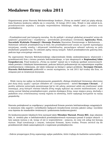 Medalowe firmy roku 2011 Organizowany przez Starostę Bełchatowskiego konkurs „Firma na medal" miał już piątą edycję. Gala finałowa konkursu odbyła się w czwartek, 16 lutego 2012 roku. Wzięli w niej udział m.in. przedstawiciele sejmiku i zarządu województwa łódzkiego, władz gmin i powiatu oraz przedsiębiorcy. - Przedsiębiorczość jest kategorią moralną. Na tle polityki i strategii globalnej prowadzić winna do spójności gospodarczej i współpracy - powiedziała prowadząca ceremonię Agnieszka First, Naczelnik Wydziału Promocji i Rozwoju Powiatu Starostwa Powiatowego w Bełchatowie. Natomiast człowiek przedsiębiorczy to ktoś, kto przedsiębiorczość uważa za czynnik wyzwalający inicjatywę, zasoby wiedzy i aktywność intelektualną, pozwalające odnosić sukcesy na polu działalności gospodarczej. To człowiek żądny rzeczy nowych. Takich przedsiębiorców gościmy dziś, podczas tego uroczystego wieczoru. Na zaproszenie Starosty Bełchatowskiego odpowiedziało blisko siedemdziesięciu właścicieli i przedstawicieli firm z terenu powiatu bełchatowskiego, w tym skupionych w Regionalnej Izbie Gospodarczej. Finał konkursu „Firma na medal" wpisał się w tradycję spotkań noworocznych władz powiatu z lokalnymi biznesmenami, podczas których podsumowuje się najważniejsze wspólne przedsięwzięcia i dokonania, ale także wskazuje na bieżące i palące problemy. Szczepan Chrzęst, Starosta Bełchatowski podkreślił w swoim wystąpieniu, że rok 2011 był trudny dla firm, co związane jest ze światowym kryzysem. - Wiele rzeczy ma wpływ na funkcjonowanie gospodarki, dlatego działalność biznesowa obarczona jest dużą dozą ryzyka i sporym wkładem sił i zaangażowania – mówił Szczepan Chrzęst. - Z punktu widzenia samorządu powiatowego był to rok udany, ponieważ udało się zrealizować wiele inwestycji, przy których również lokalne firmy mogły wykazać się swoimi możliwościami. A jak wiemy wzrost lokalnej przedsiębiorczości, prężnie działające firmy, nowe miejsca pracy, dochody z podatków oraz zrównoważony rozwój regionu to elementy, które wpływają korzystnie na naszą gospodarkę. Starosta podziękował za współpracę i pogratulował firmom powiatu bełchatowskiego osiągniętych w minionym roku nagród i certyfikatów będących świadectwem wzrostu jakości usług i wyrobów oraz dążenia do standardów światowych i podnoszenia konkurencyjności. Do konkurencyjności lokalnych firm nawiązał także Mirosław Marszał, Prezes RIG. Jego zdaniem fakt, iż średnia płac w bełchatowskich przedsiębiorstwach wynosząca ponad 4 tysiące złotych - i tym samym wyższa o ok. tysiąc zł niż w województwie - oznacza, że ceny ich usług też bywają wyższe. Stąd rywalizacja z innymi, tańszymi firmami, bywa trudna. Prezes zwrócił się do przedstawicieli władz samorządowych o wspieranie przedsiębiorców. - Dobrze prosperujące firmy zapewniają wpływ podatków, które trafiają do budżetów samorządów – mówił M. Marszał. - Warto zatem pomagać przedsiębiorczości, wspierać kreatywność i nowe inicjatywy, a tym bardziej, że zjawisko bezrobocia szybko nie zniknie, a nawet można się spodziewać jego wzrostu. Mimo trudnych warunków są firmy, które nie poddają się złym nastrojom globalnej gospodarki, są dobrze zarządzane, dbają o pracowników, poszukują efektywnych rozwiązań, pamiętają o ochronie środowiska. To one właśnie rywalizują o medale w powiatowym konkursie. W V edycji „Firmy na medal” wzięło udział 11 firm. Kapituła konkursu, której przewodniczył starosta Szczepan Chrzęst, zdecydowała o następującym podziale nagród i wyróżnień: - w kategorii: przedsiębiorcy prowadzący działalność do 2 lat tytuł „Firma na medal” otrzymała Firma "Adamczyk" s.c. - właściciel: Krzysztof Adamczyk (zdjęcie po prawo) (dystrybucja i sprzedaż materiałów budowlanych, usługi remontowo-budowlane); w kategorii: przedsiębiorcy prowadzący działalność powyżej 2 lat tytuł „Firma na medal" otrzymało Przedsiębiorstwo Energetyki Cieplnej Sp. z o.o. w Bełchatowie, Prezes Zarządu: Wojciech Gwoździk (zdjęcie po prawo) (przesył i dystrybucja ciepła w postaci gorącej wody, eksploatacja sieci i węzłów cieplnych, usługi w zakresie projektowania oraz budowy sieci i węzłów cieplnych). Kapituła przyznała Nagrodę Specjalną Piekarni „Jazon II" z Dobrzelowa – właściciel Paweł Poryzała. Pozostałe firmy, które brały udział w konkursie "Firma na medal" to: - w kategorii: przedsiębiorcy prowadzący działalność do 2 lat: 1. Salon Kosmetyczny, studio wizażu - właściciel: Monika Błoch; 2. Firma MAXJOB - właściciel: Małgorzata Szczepańska; - w kategorii: przedsiębiorcy prowadzący działalność powyżej 2 lat: 1. Centrum Języków Obcych PICCADILLY - właściciel: Marcin Koperek; 2. KONSTAK Sp. z o.o. - Prezes: Karol Dzieja; 3. Przedsiębiorstwo Produkcyjno-Usługowo-Handlowe STIVEX Zelów, właściciel: Szczepan Wrzesiak; 4. Business Solutions Bełchatów, właściciel: Wojciech Karłowski; 5. "Dekoria" Projektowanie i wykończenie wnętrz, Rasy, właściciel: Radosław Kamiński; 6. Bełchatowsko Kleszczowski Park Przemysłowo Technologiczny Sp. z o.o., Prezes Zarządu: Dariusz Stępczyński; 7. Ramb Sp. z o.o., Prezes: Krzysztof Głowacki. Nagrodzone firmy otrzymały statuetki, pozostałe – dyplomy, które wręczali starosta Sz. Chrzęst i Przewodniczący Rady Powiatu Edward Olszewski. Władzom powiatu - inicjatywy konkursu, a przedsiębiorcom - sukcesów pogratulowali: Marek Mazur – przewodniczący Sejmiku Województwa Łódzkiego i Dariusz Klimczak – członek Zarządu Województwa Łódzkiego. W części artystycznej wystąpiła Sylwia Strugińska – Wochowska, solistka Teatru Muzycznego w Łodzi, a towarzyszyli jej muzycy: Waldemar Zybala (akordeon), Kazimierz Targowski (skrzypce), Artur Modrzejewski (klarnet), Adam Przybylski